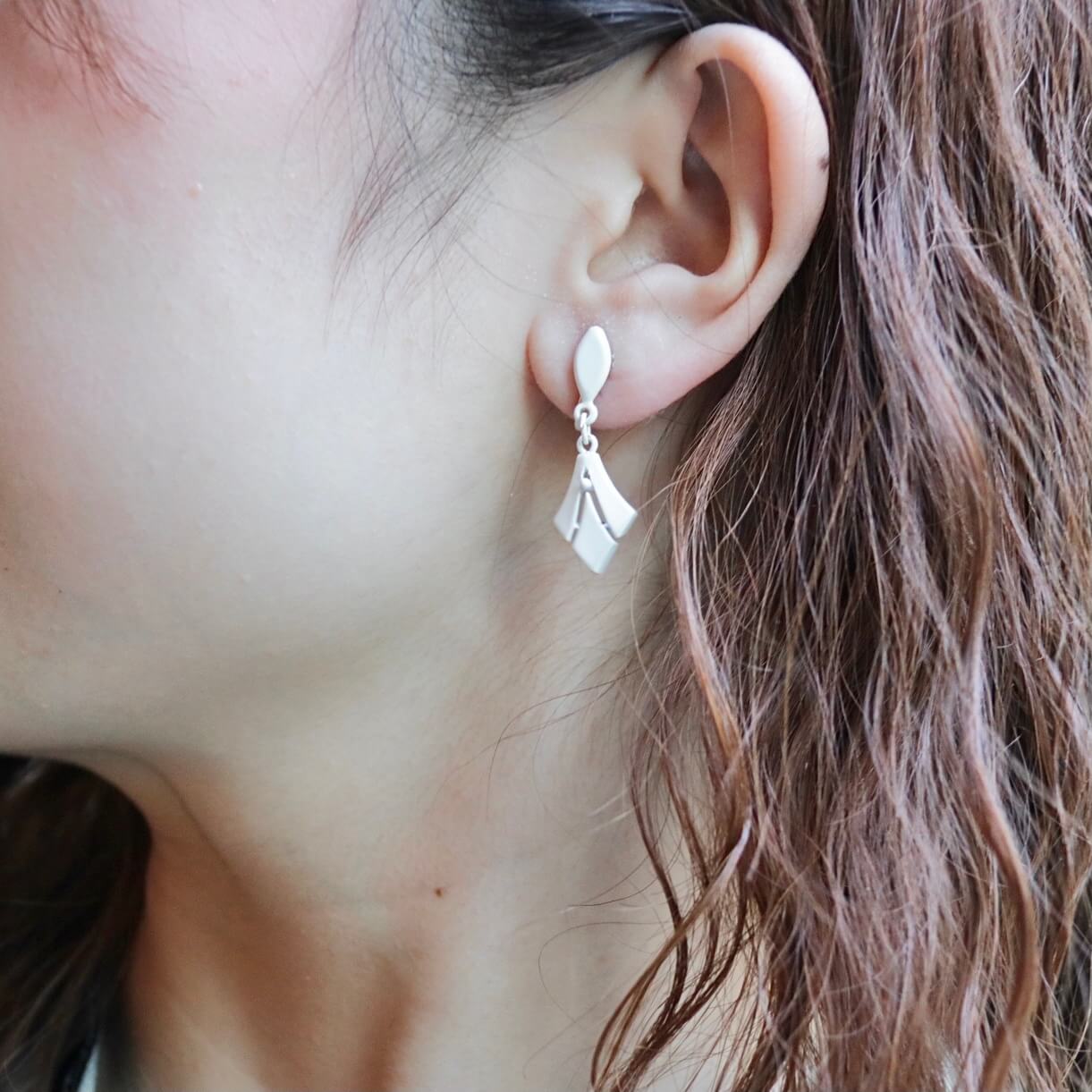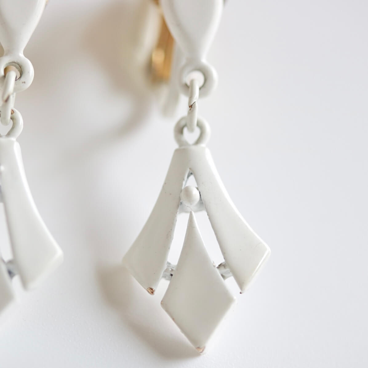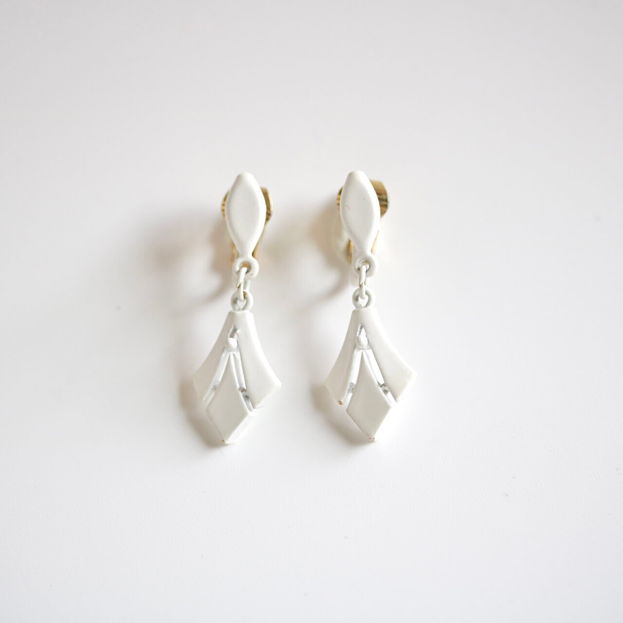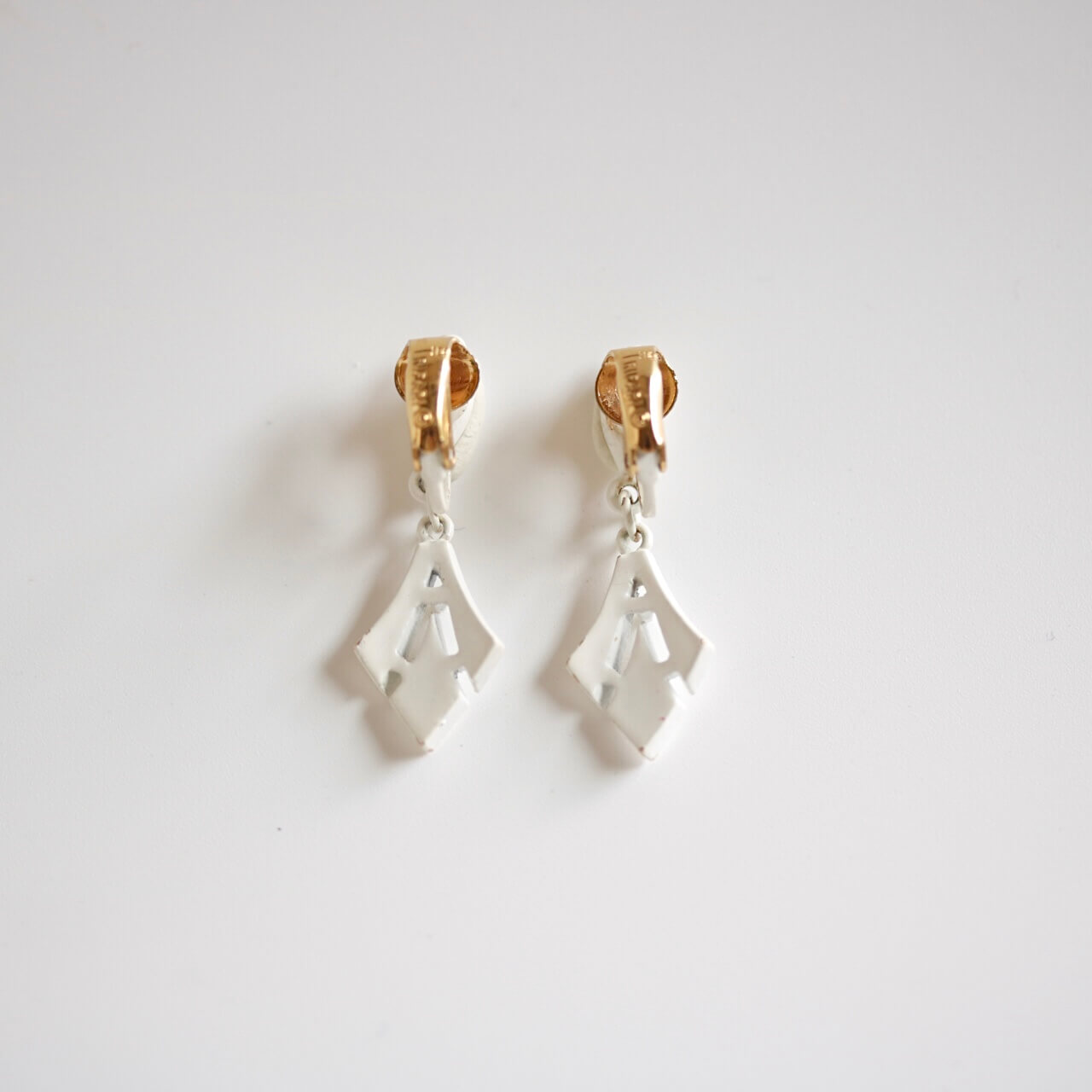 菱形のモチーフが印象的な、小ぶりなホワイトのイヤリング。