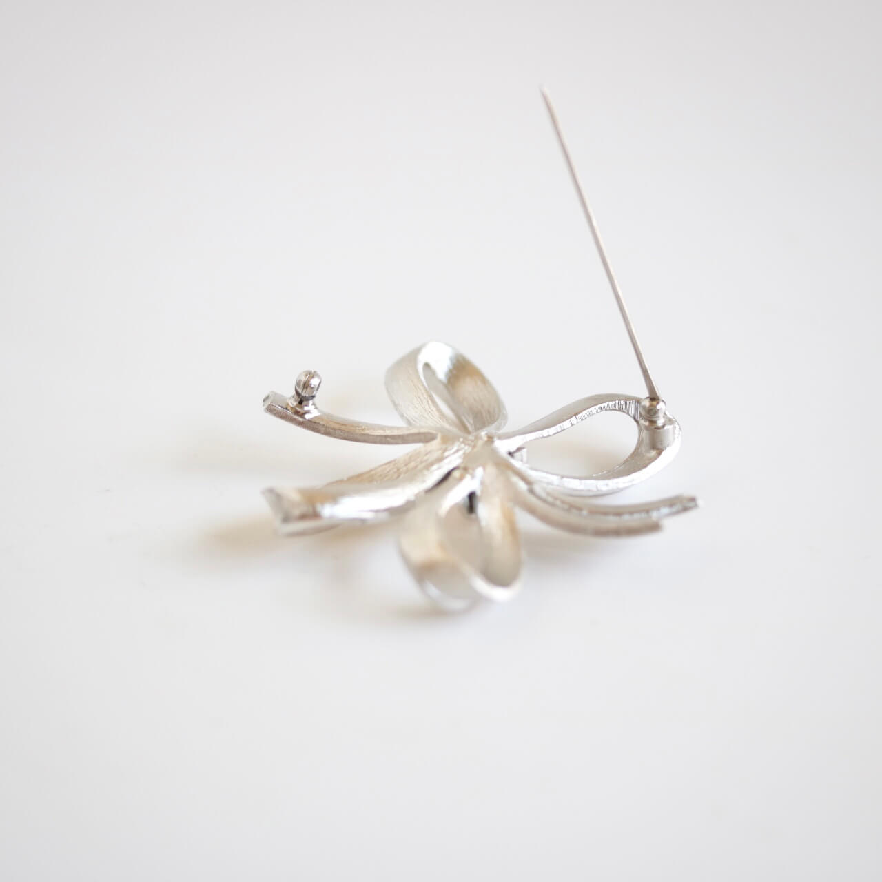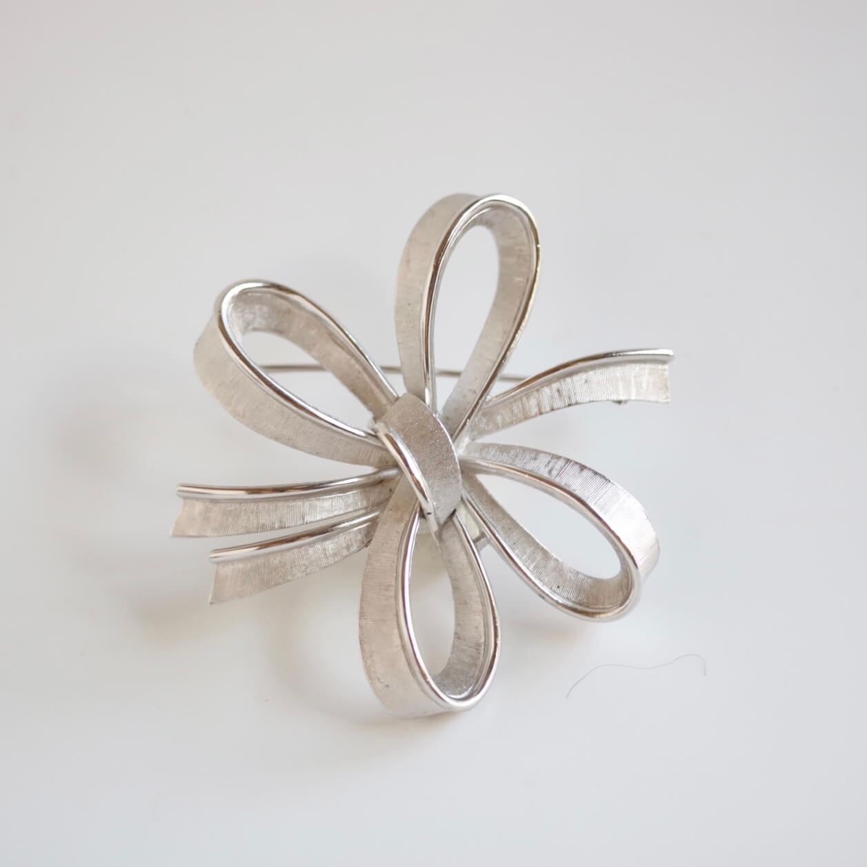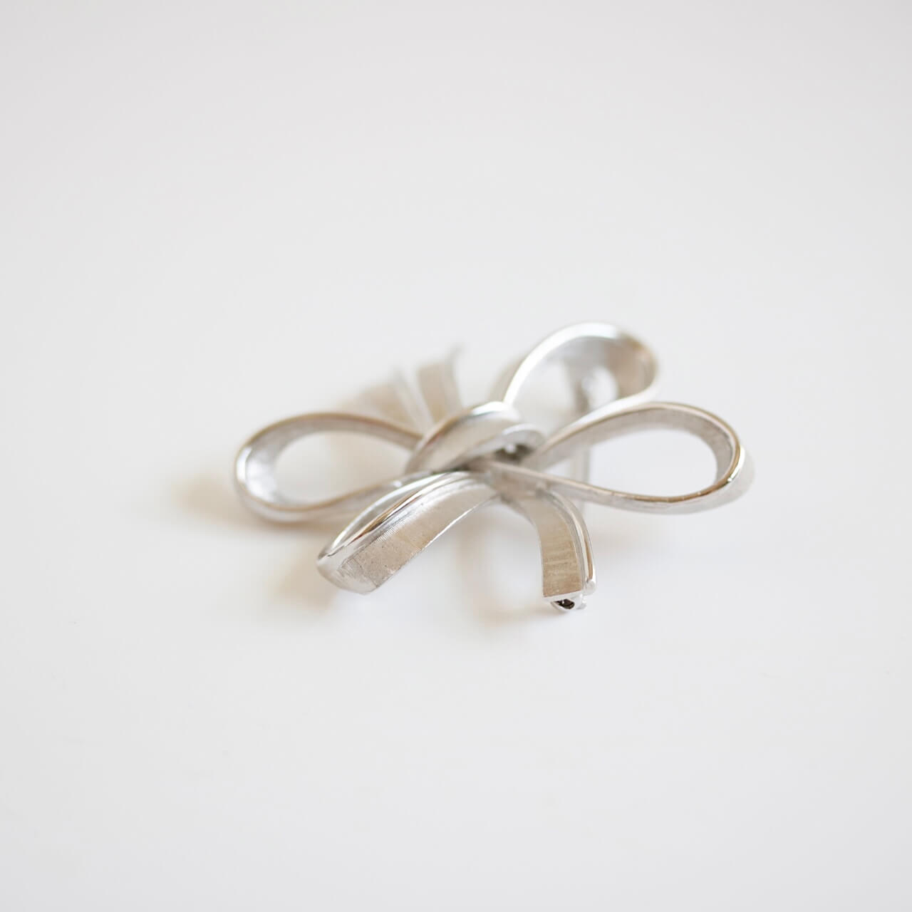 サテンのリボンを、ダブルの蝶結びにしたような曲線が美しいブローチ。