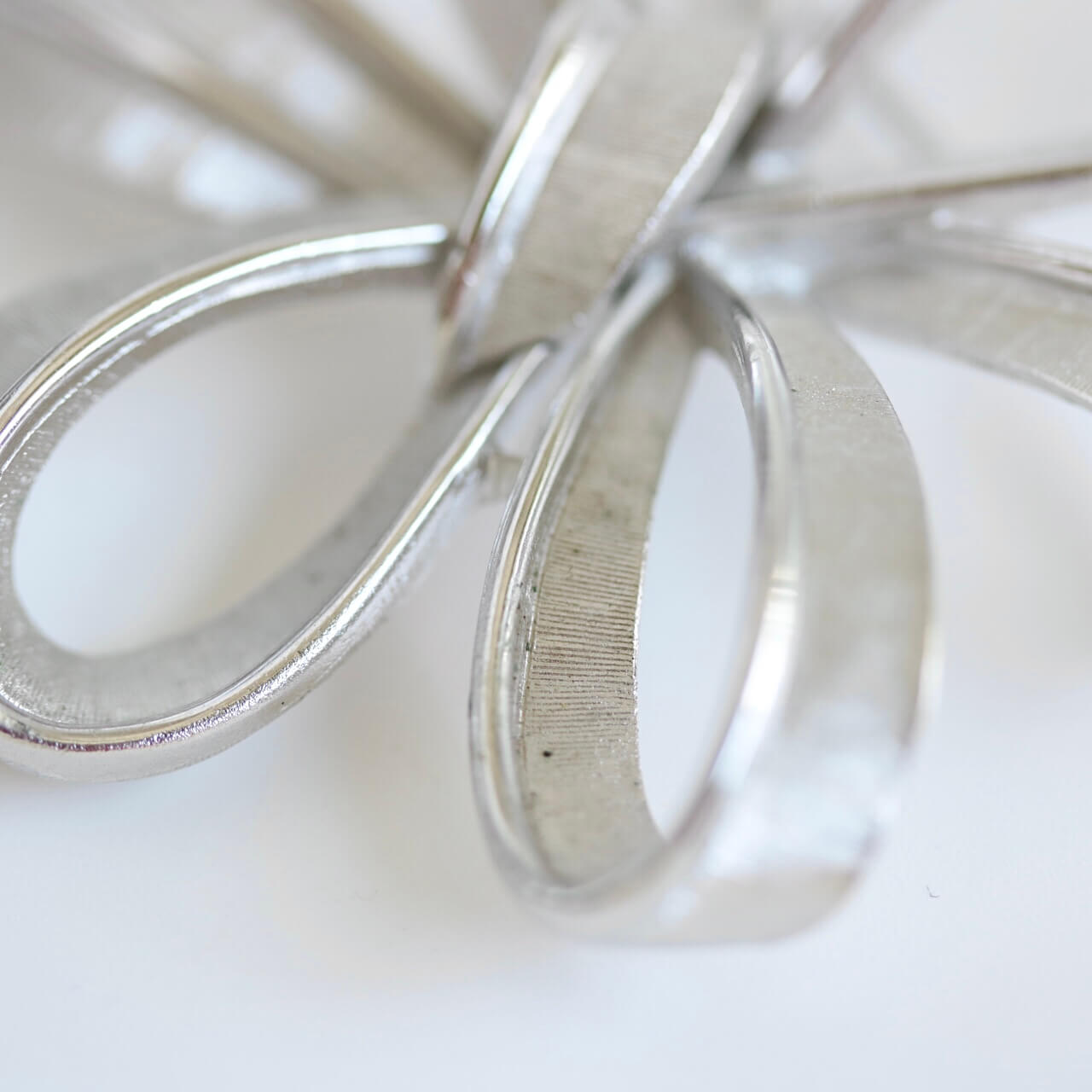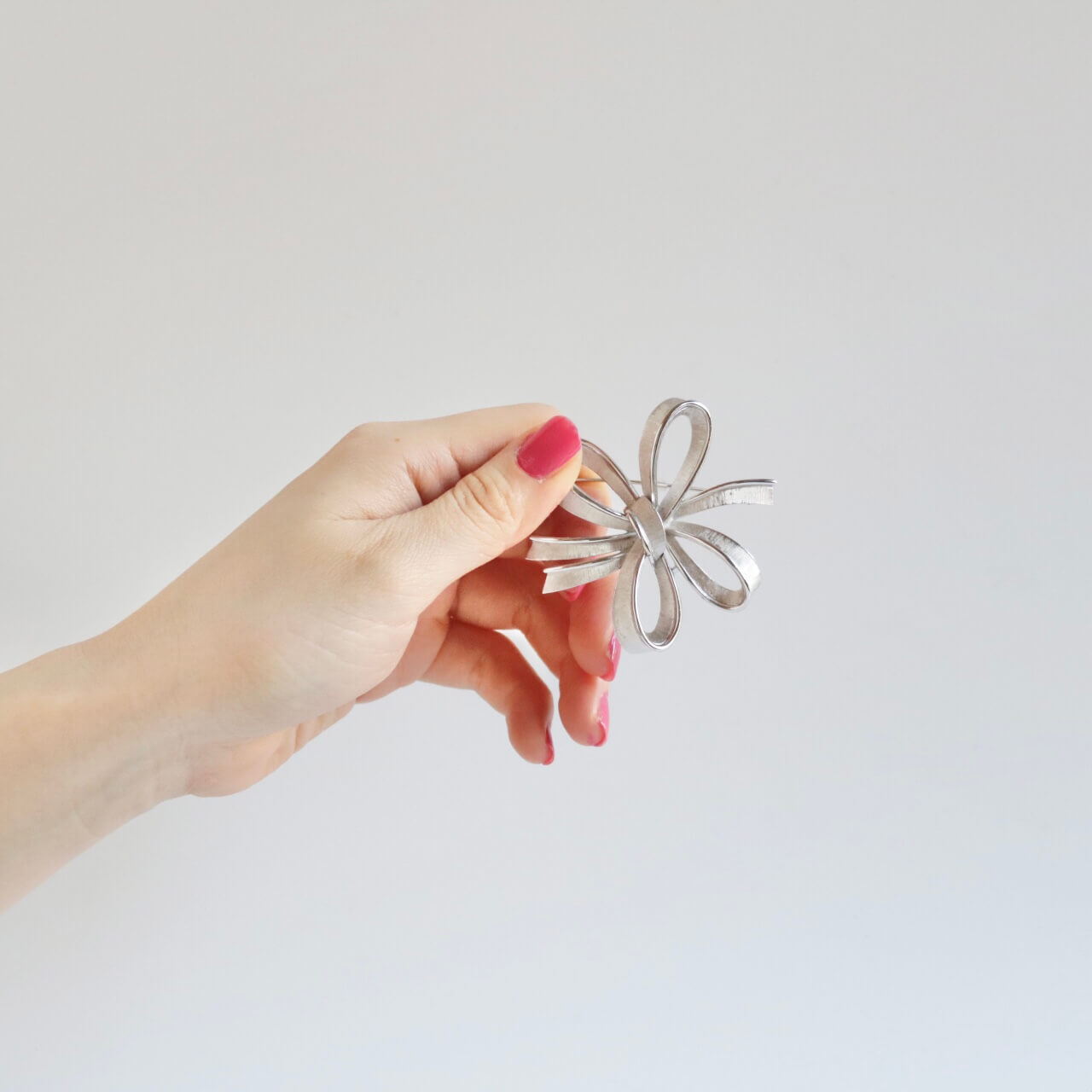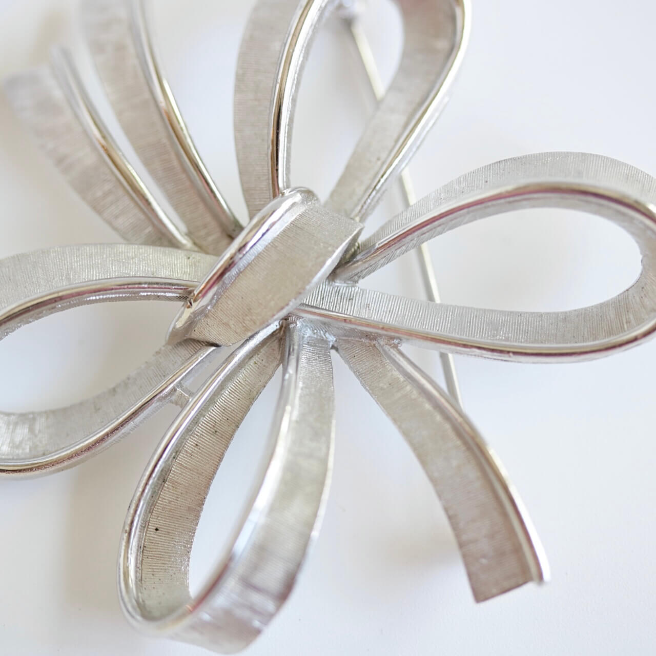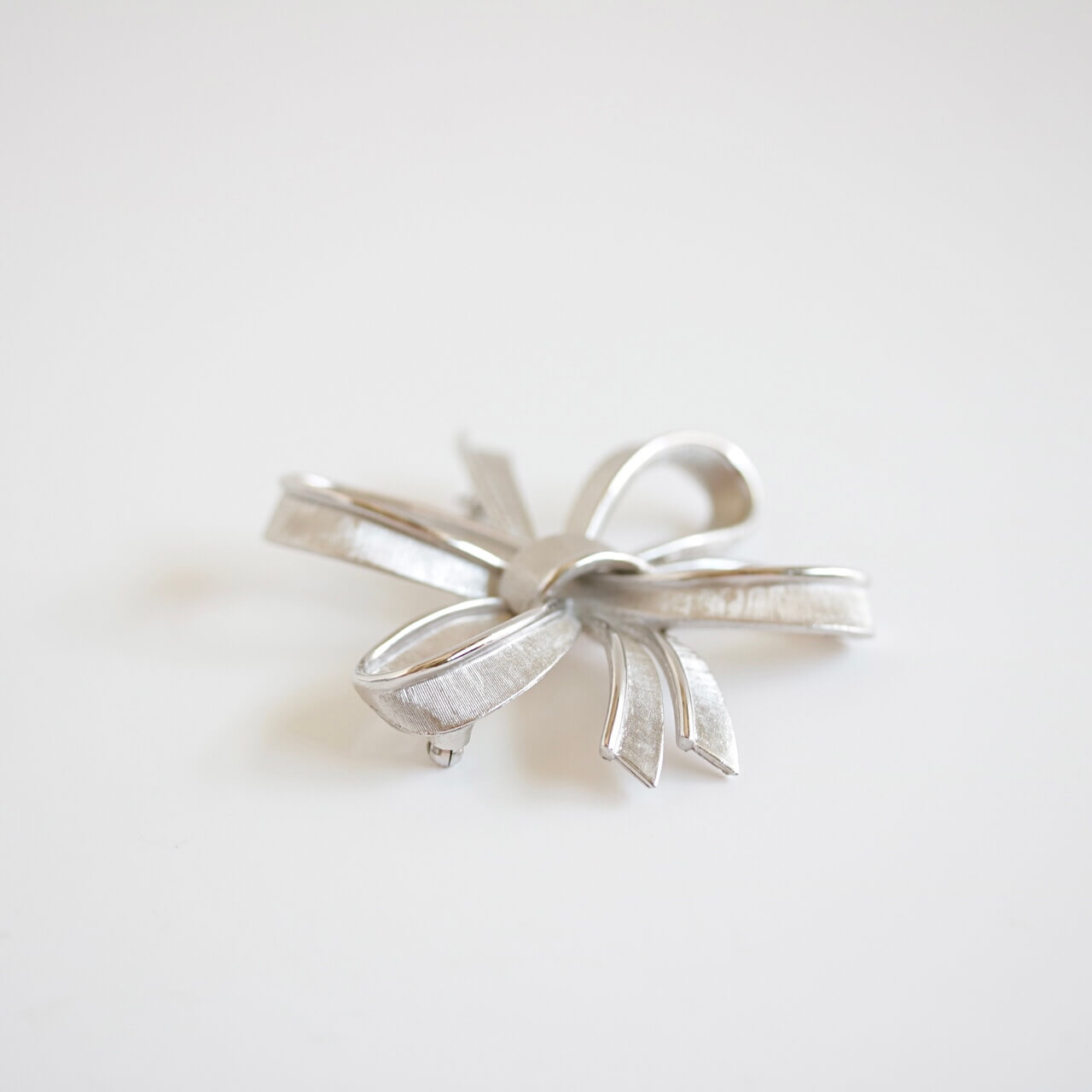 サテンのリボンを、ダブルの蝶結びにしたような曲線が美しいブローチ。