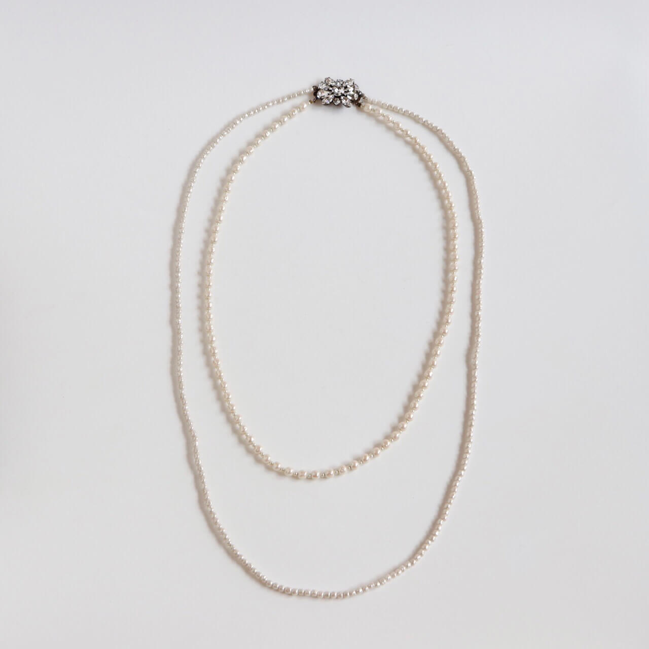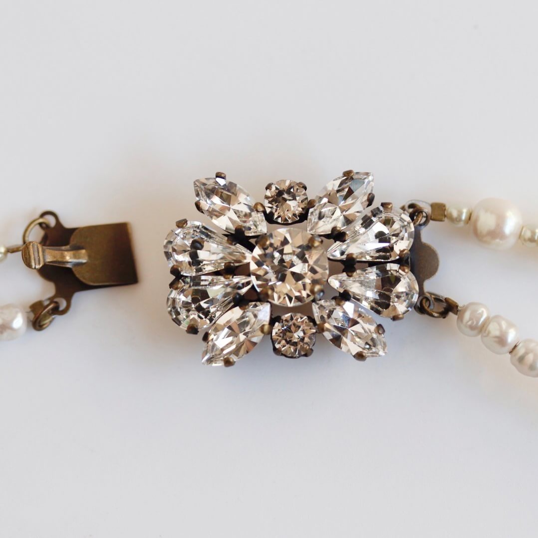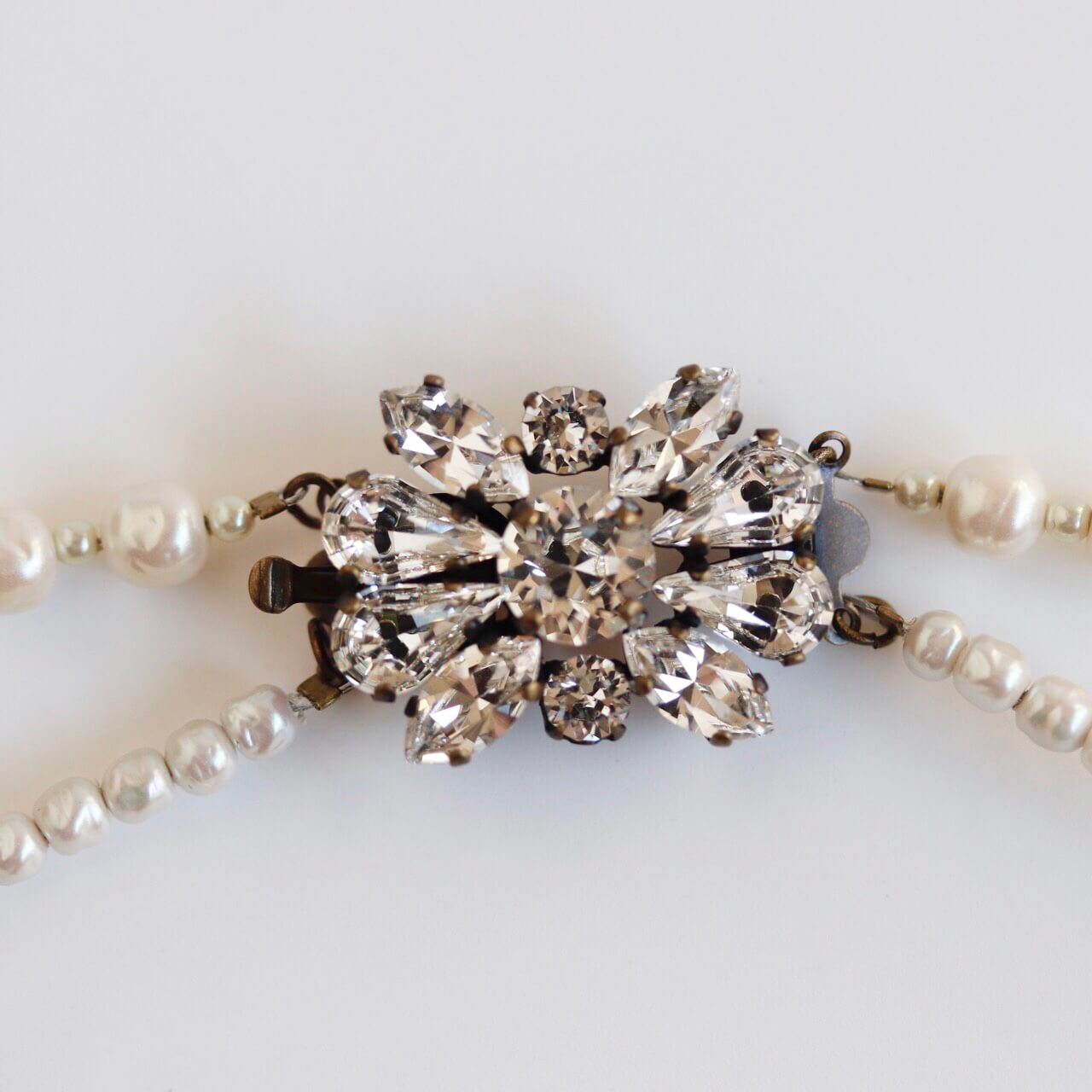 アトリエ ニノン オリジナルのバロックパールと、スワロスフキー製のフラワーモチーフのクラスプを使用した2連ネックレス。