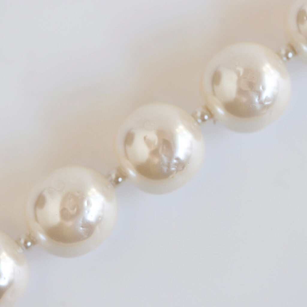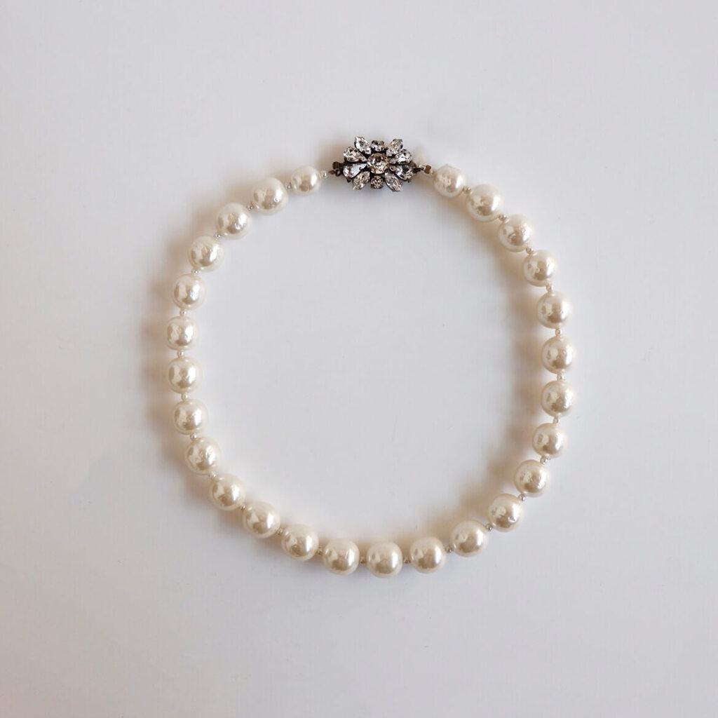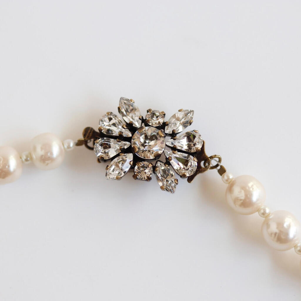 アトリエ ニノン オリジナルのバロックパールと、スワロスフキー製のストンをフラワーモチーフにセットしたクラスプを使用した1連のパールネックレス。