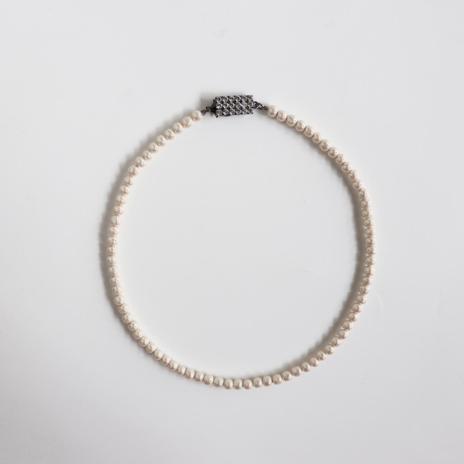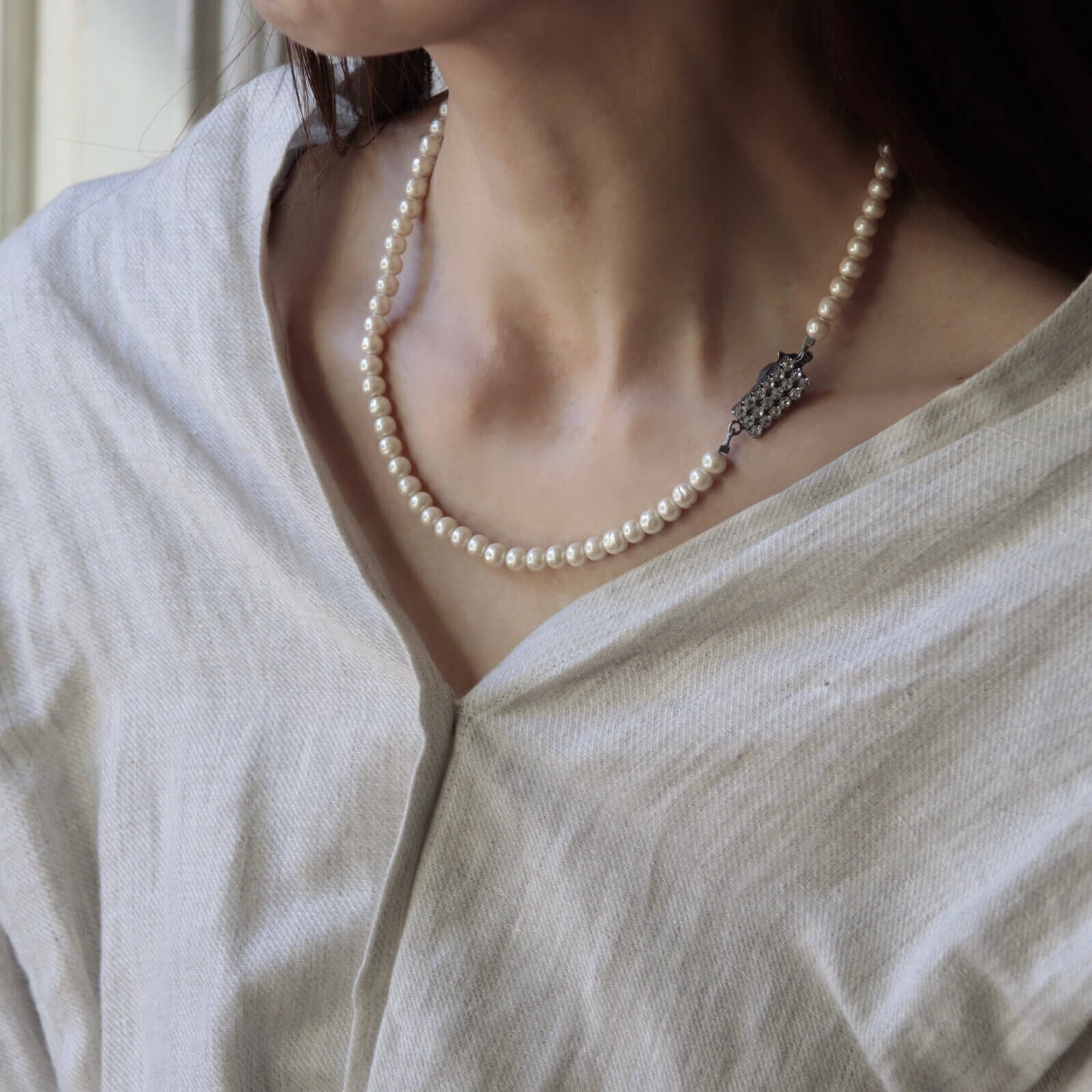 アトリエ ニノンが色と形にこだわってオーダーした、オリジナルのバロックパールと、ユニセックスにもお使いいただけるオリジナルクラスプを使用した1連のパールネックレス。