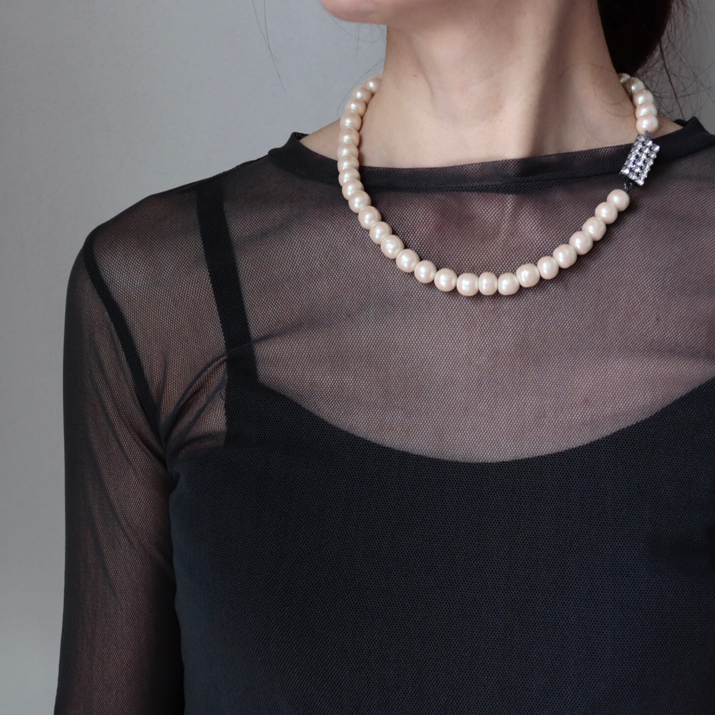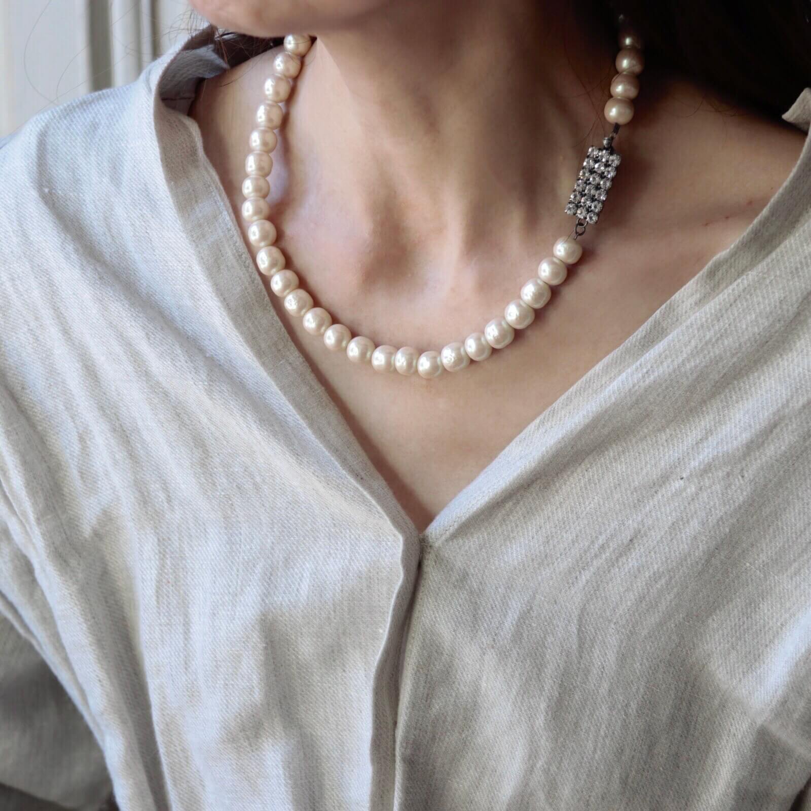アトリエ ニノンが色と形にこだわってオーダーした、オリジナルのバロックパールと、ユニセックスにもお使いいただけるオリジナルクラスプを使用した1連のパールネックレス。