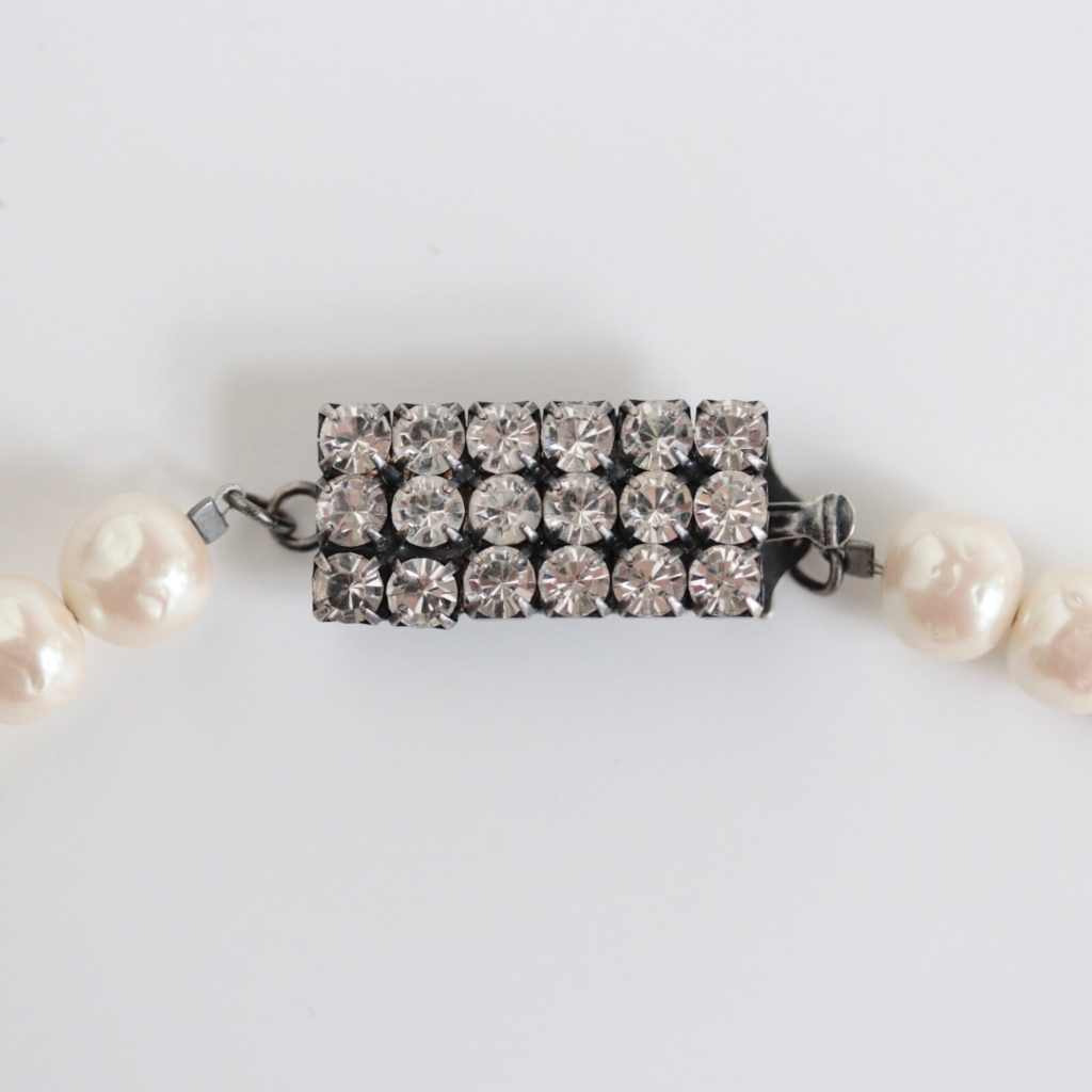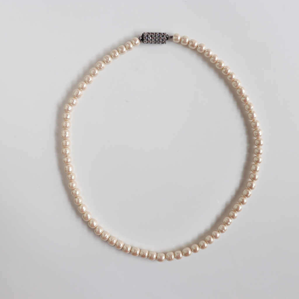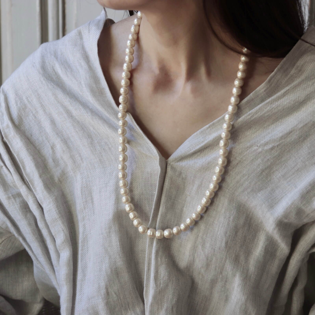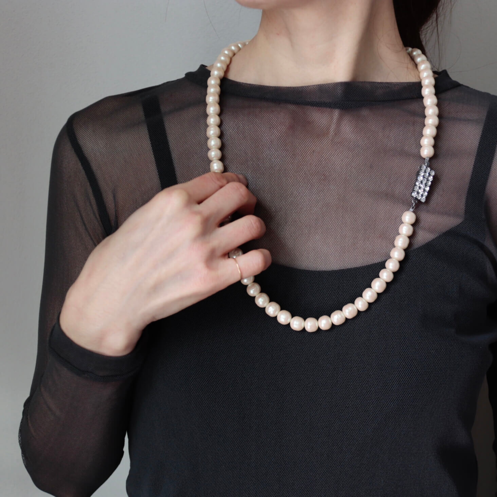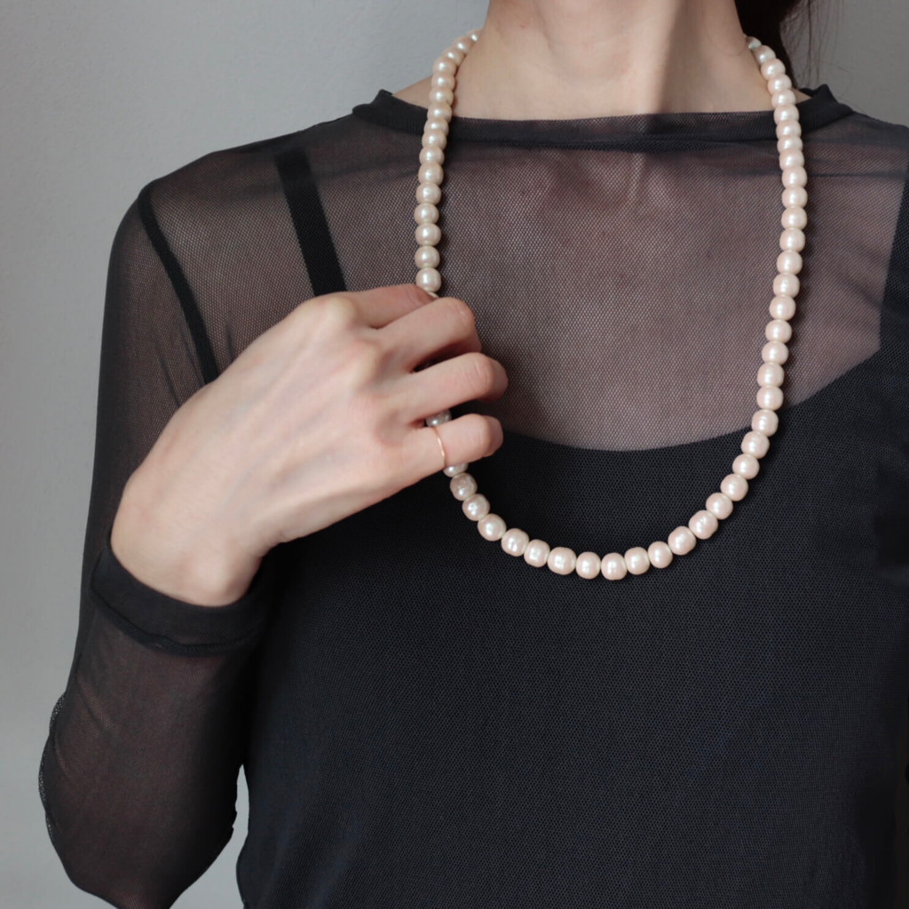 アトリエ ニノンが色と形にこだわってオーダーした、オリジナルのバロックパールと、ユニセックスにもお使いいただけるオリジナルクラスプを使用した1連のパールネックレス。