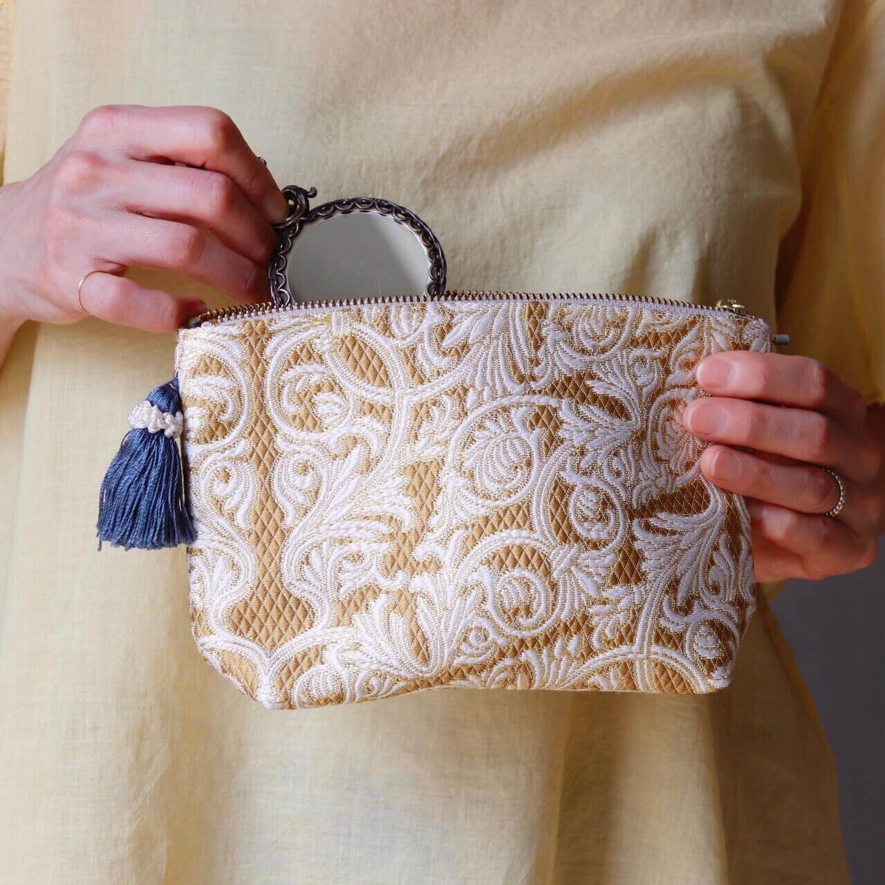 ライトブルーのベースにゴールドが映えるマチありポーチです。
