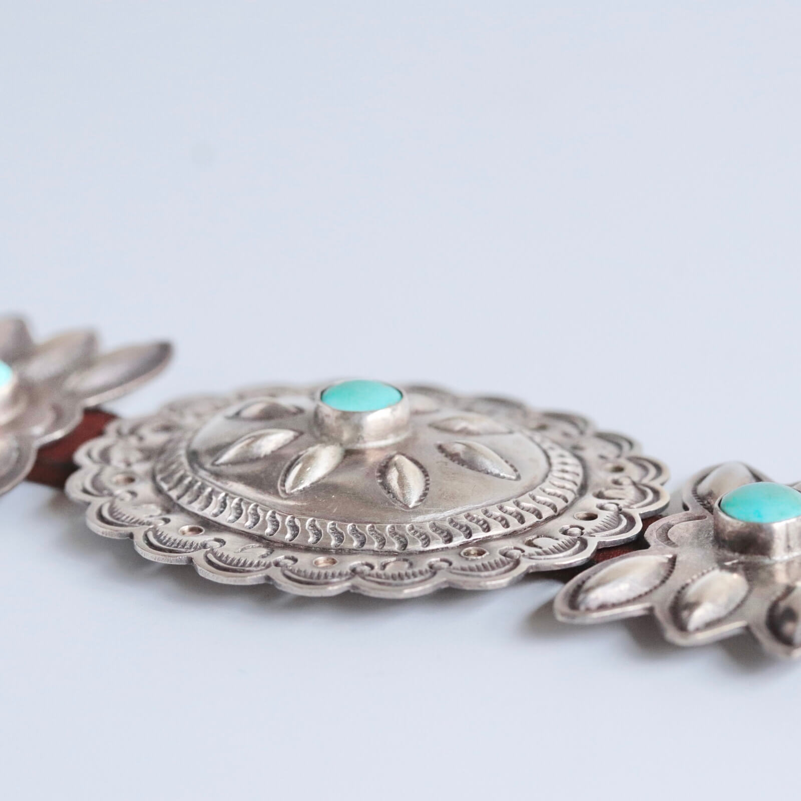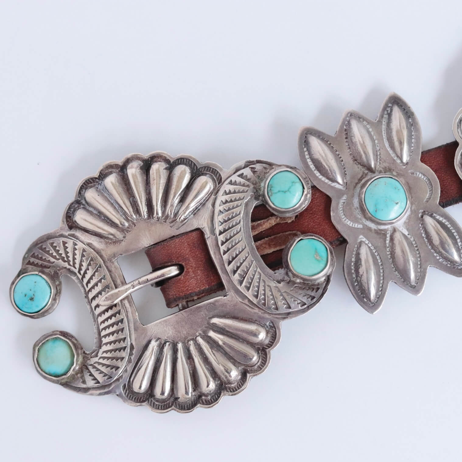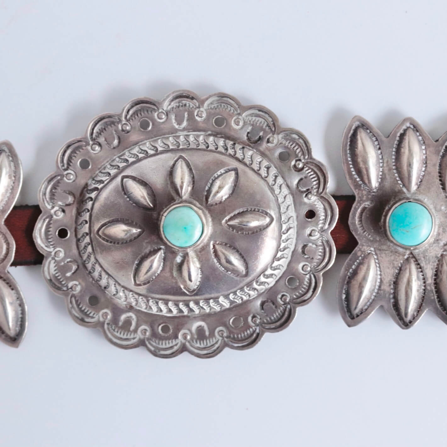 コンチョのエッジはスカラップになっており、ターコイズを中心にフラワーモチーフのようなデザインになっています。