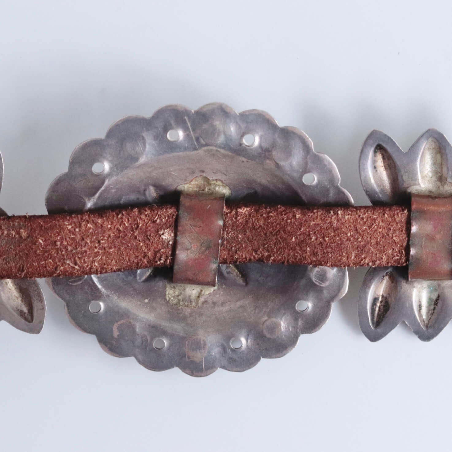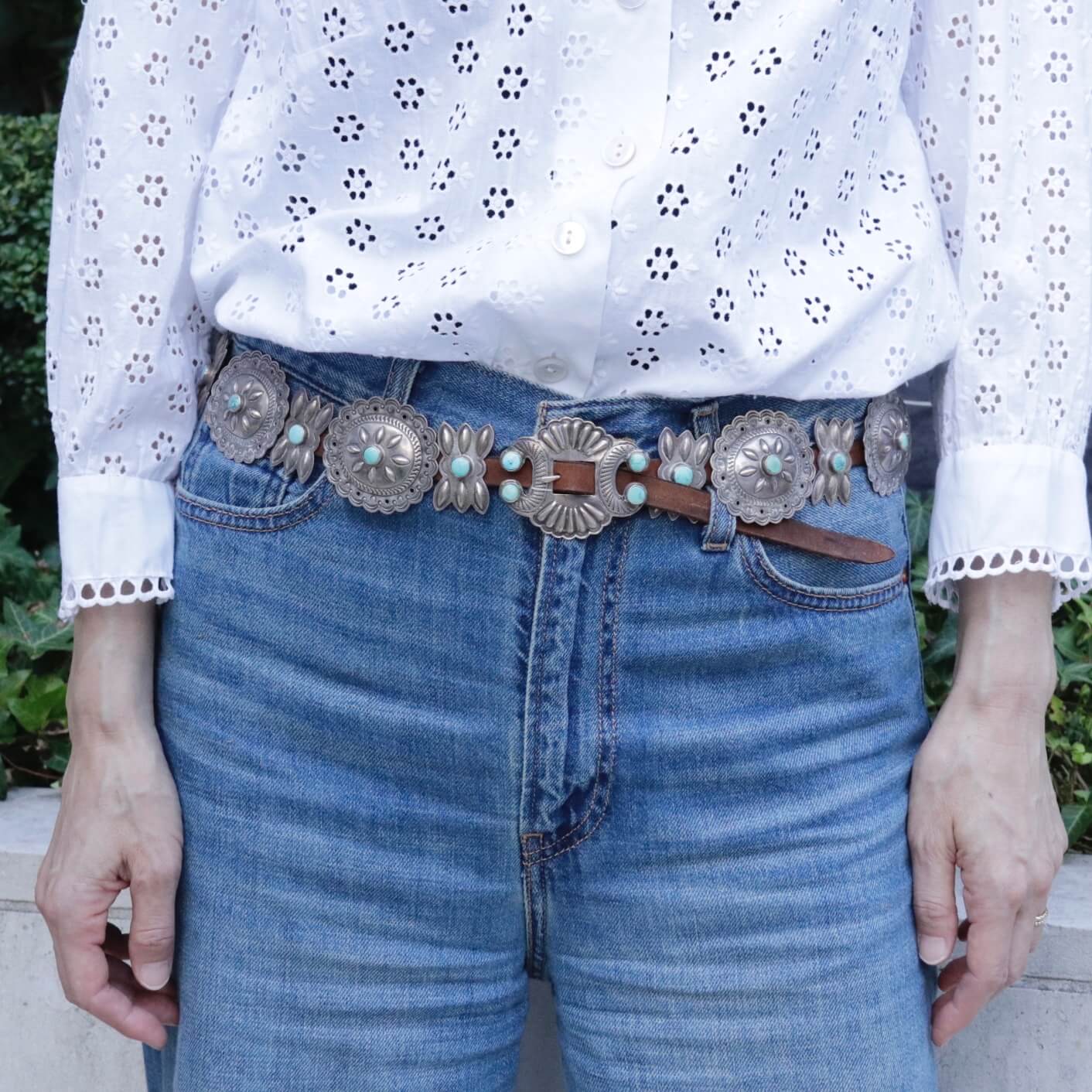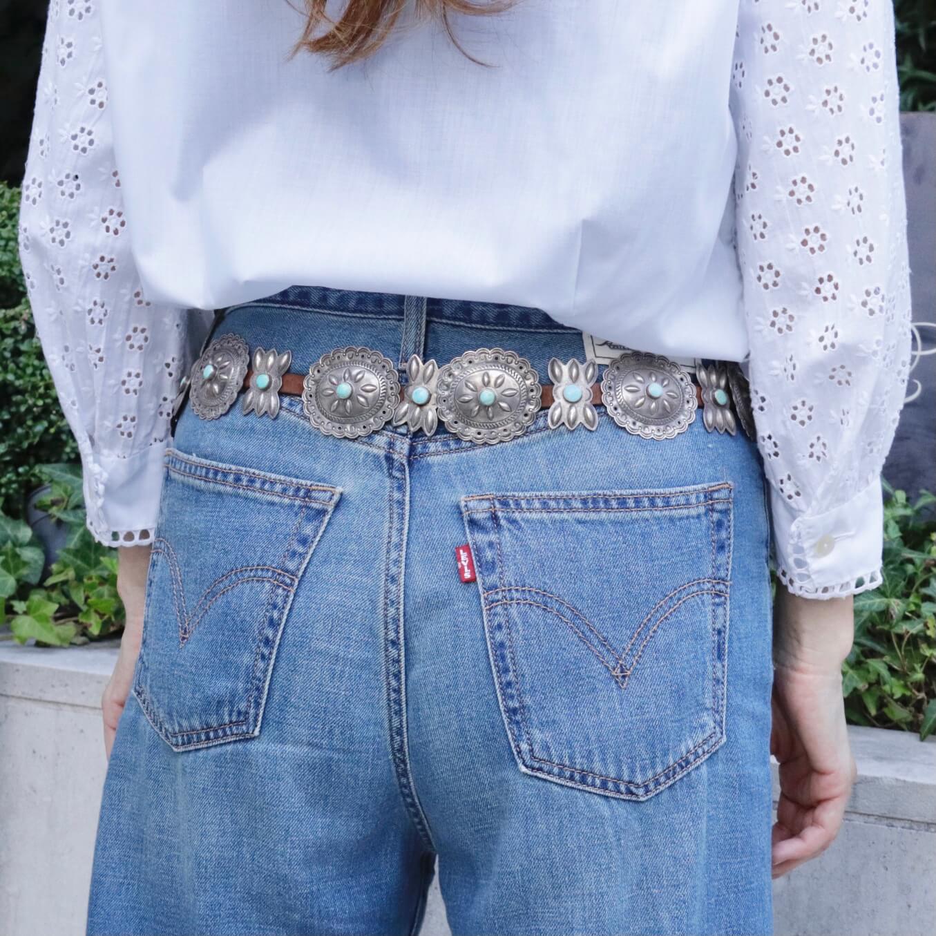 コンチョのエッジはスカラップになっており、ターコイズを中心にフラワーモチーフのようなデザインになっています。