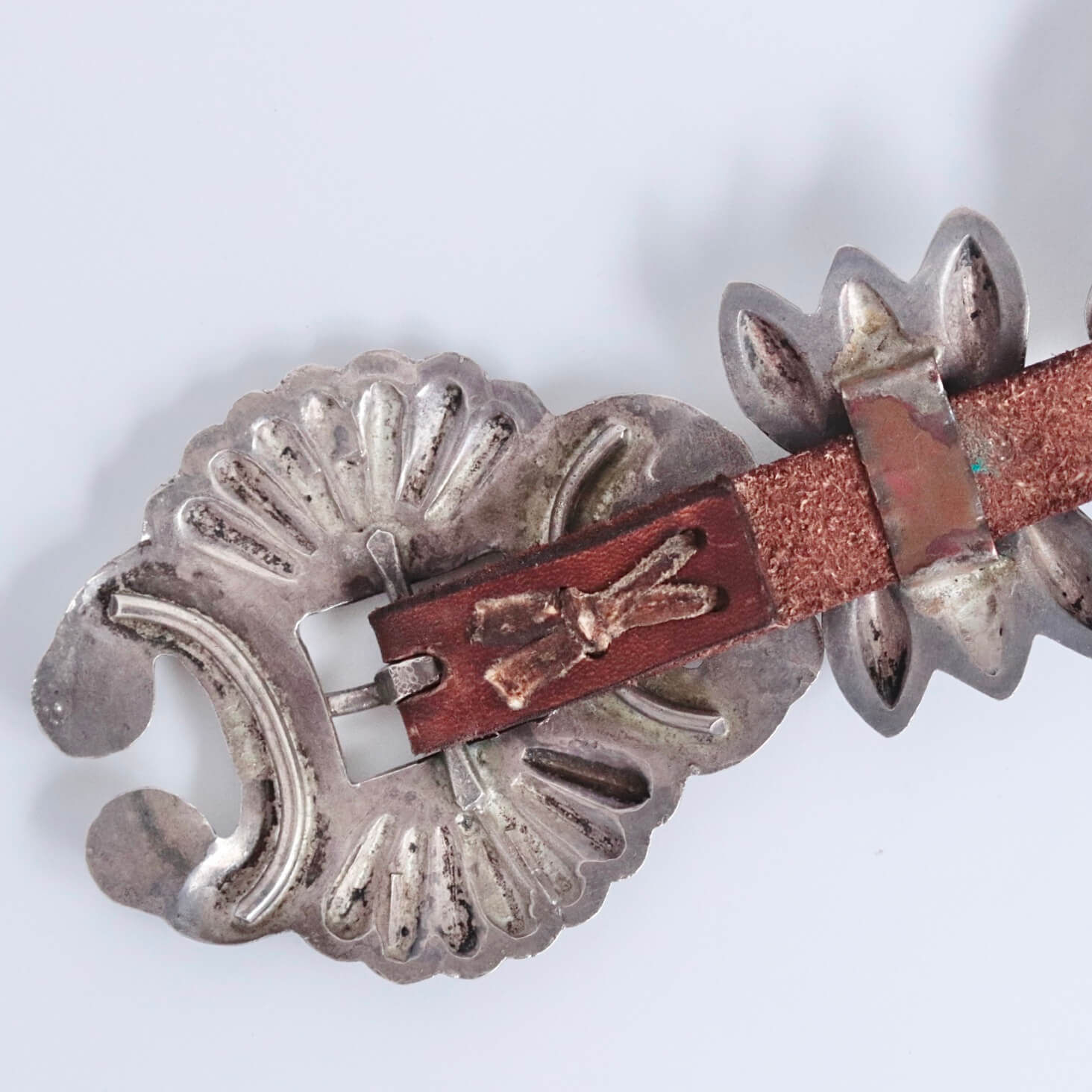 ブラウンカラーのレザーベルトにコンチョとボウ(リボン)が交互にセットされています。