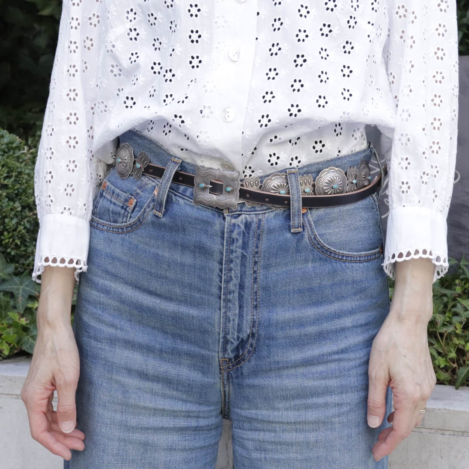 細めの黒レザーベルトに、丁寧に作られた滑らかなふくらみのコンチョとボウ(リボン)がセットされている、とてもオーセンティックでお手本となるようなコンチョベルト。