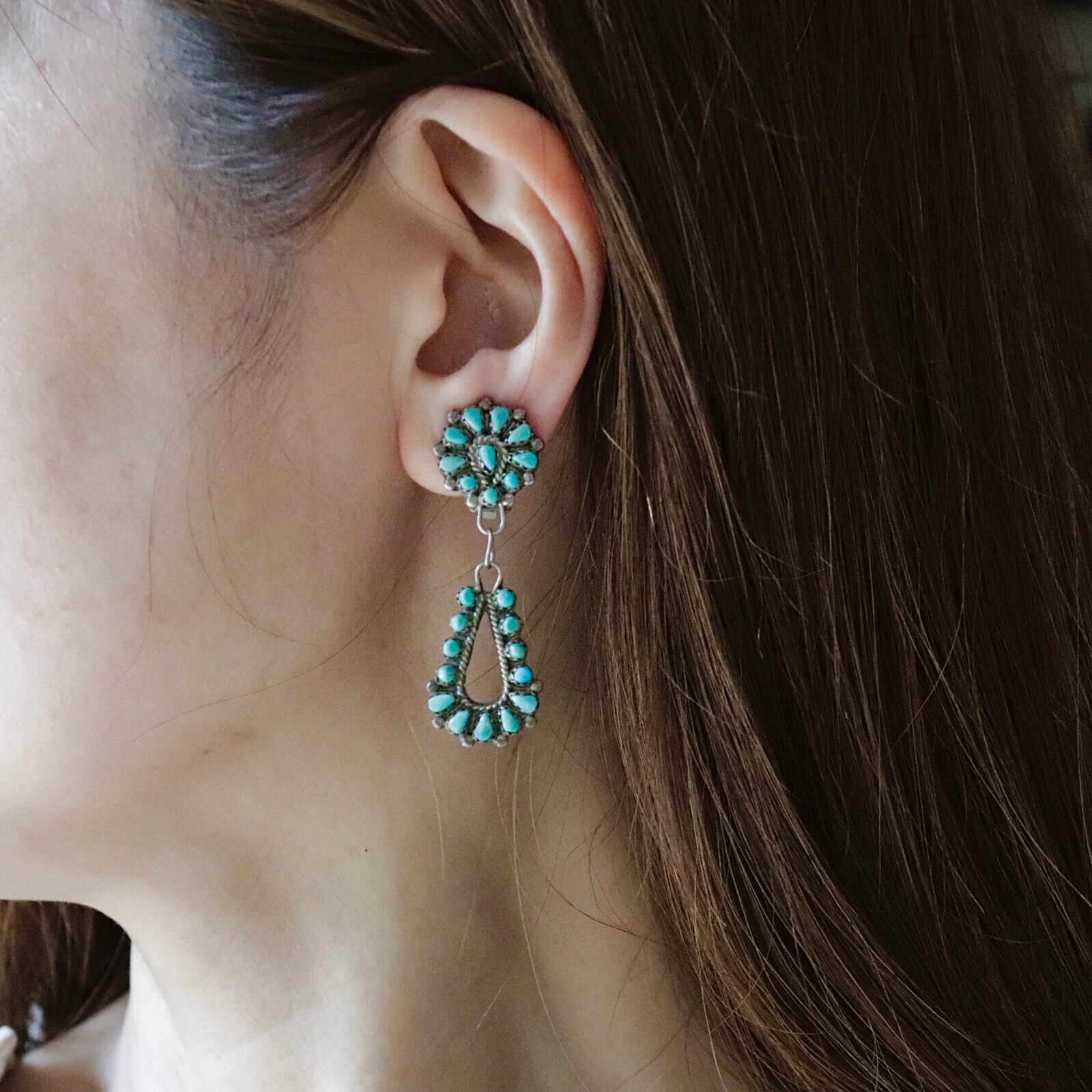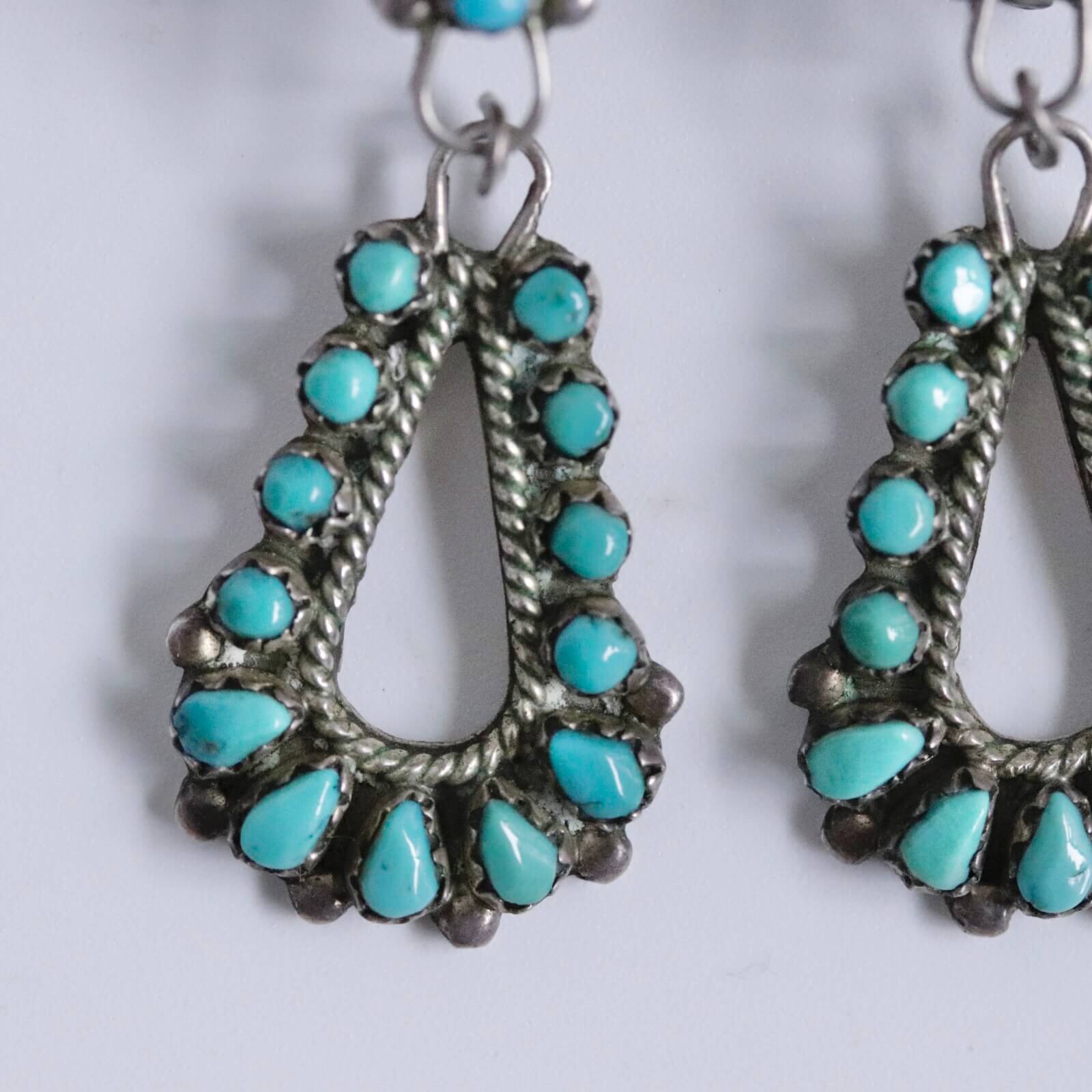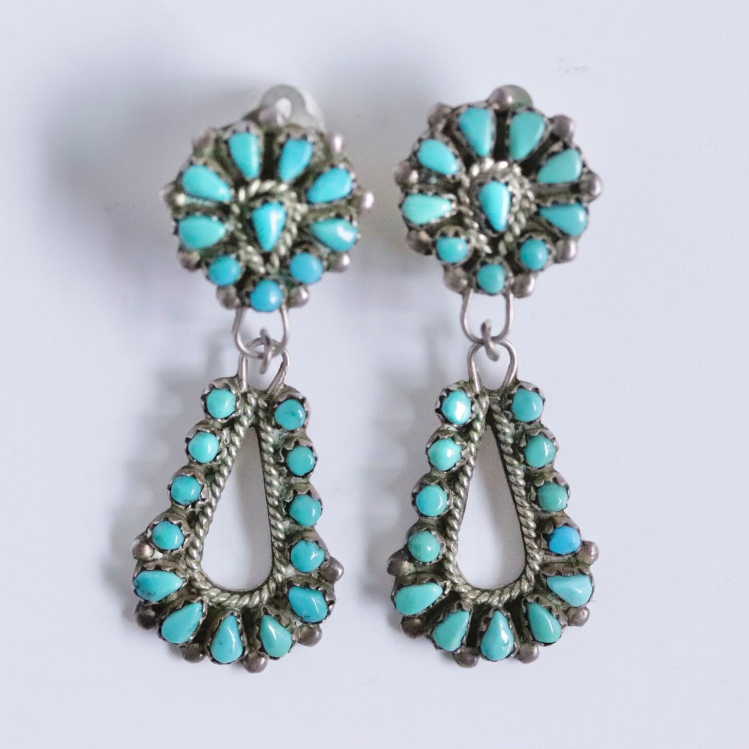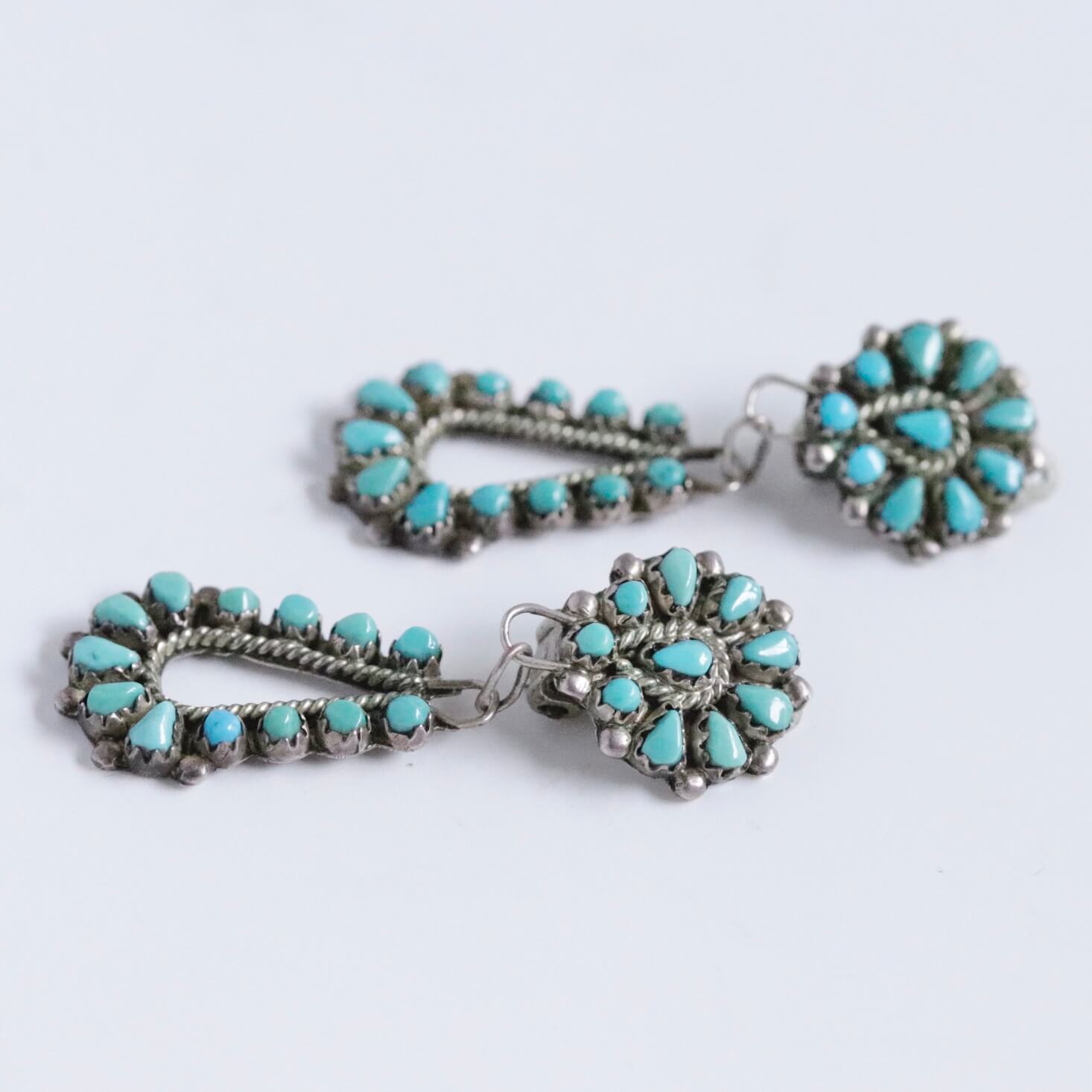 ティアドロップシェイプとラウンドシェイプのターコイズをバランスよく並べた完成度の高いイヤリングです。