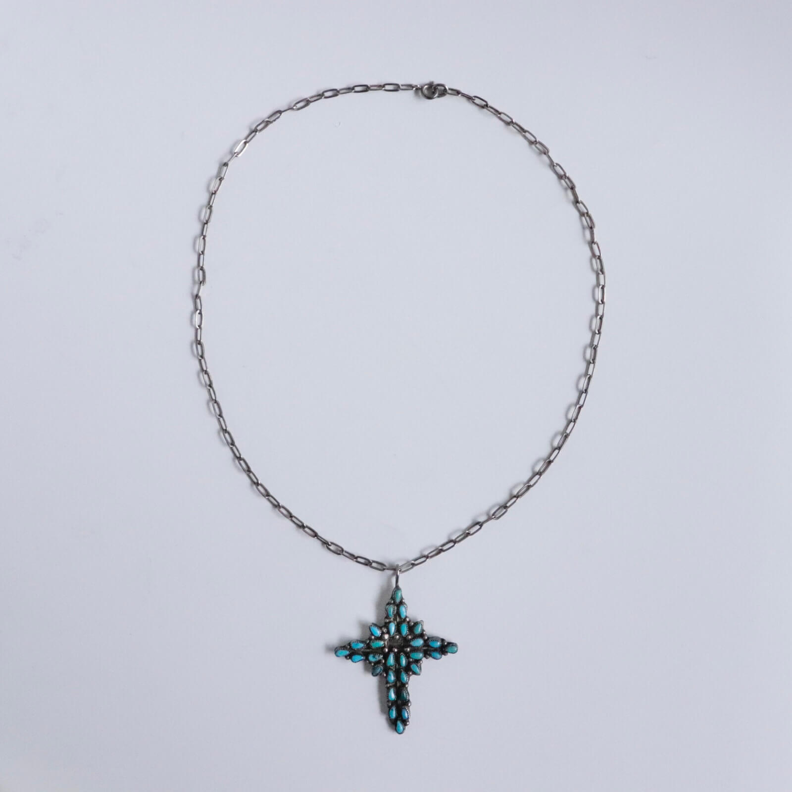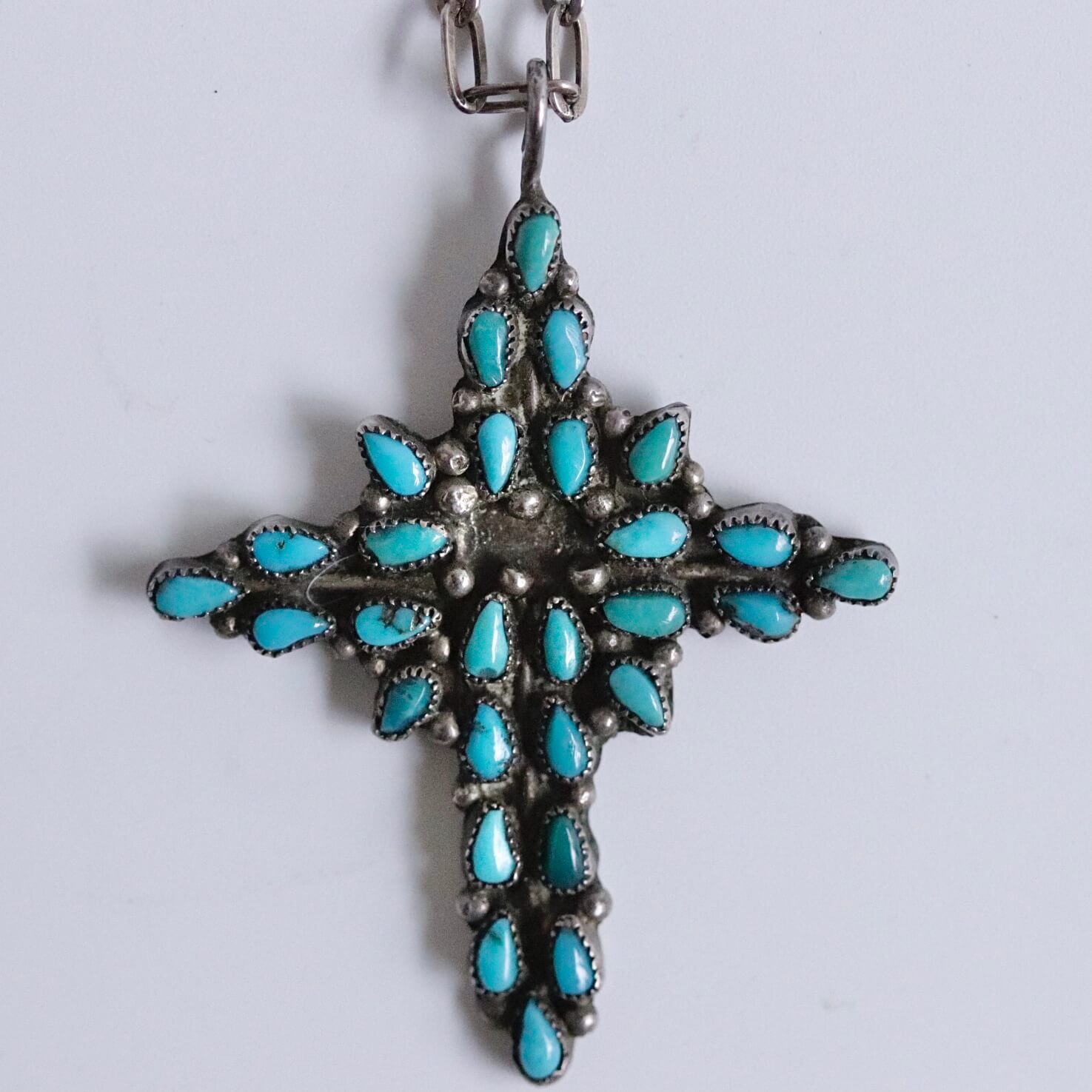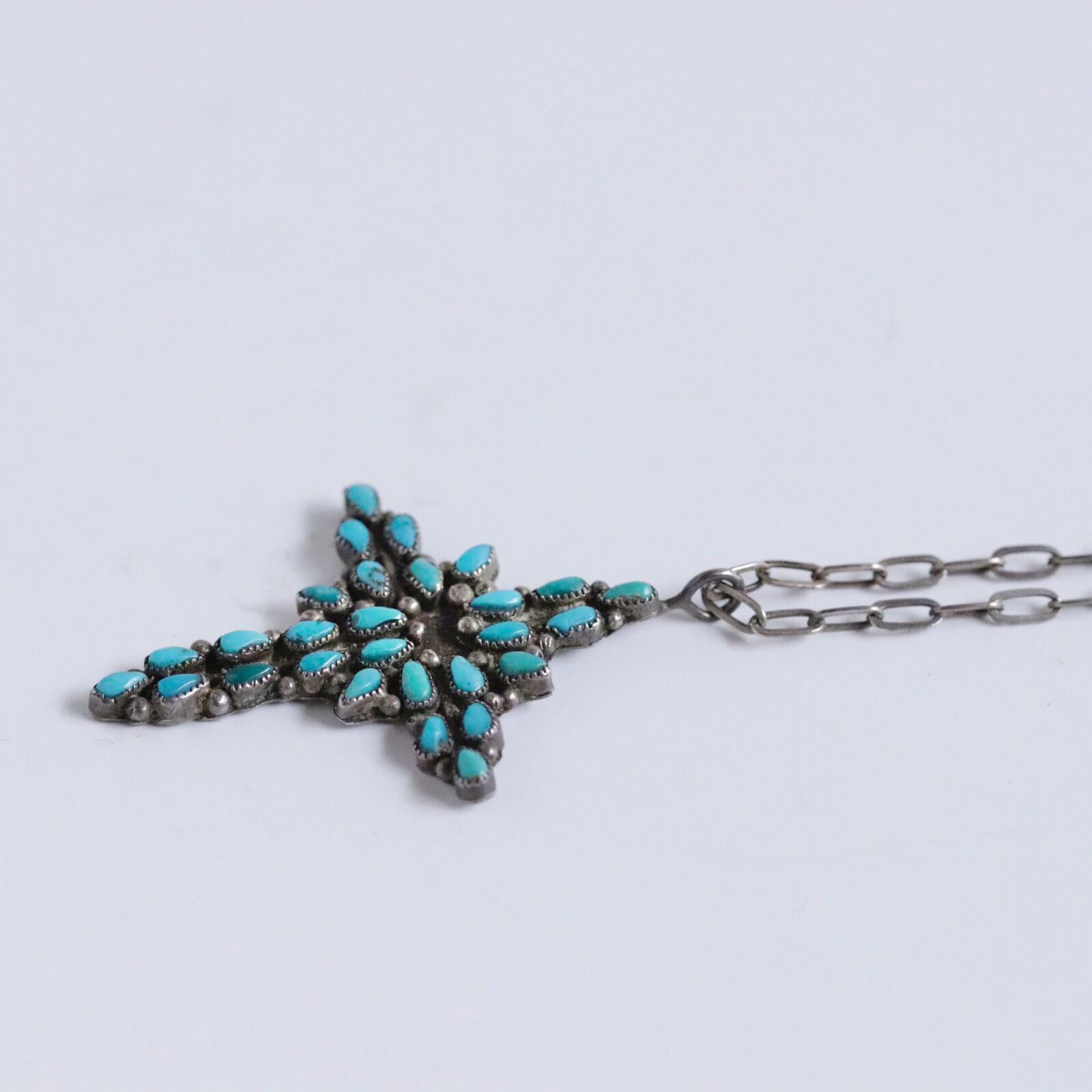 雫型にカットされたターコイズをバランスよくクロスの形に並べています。