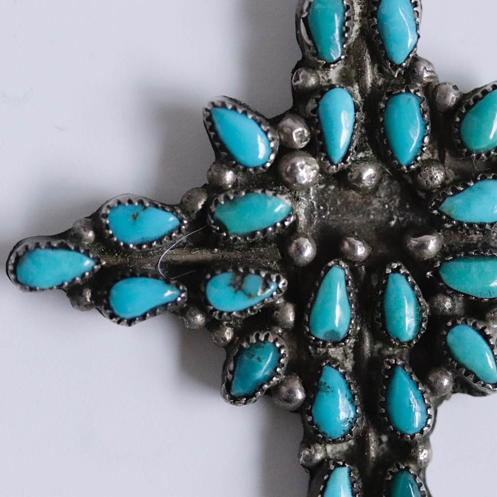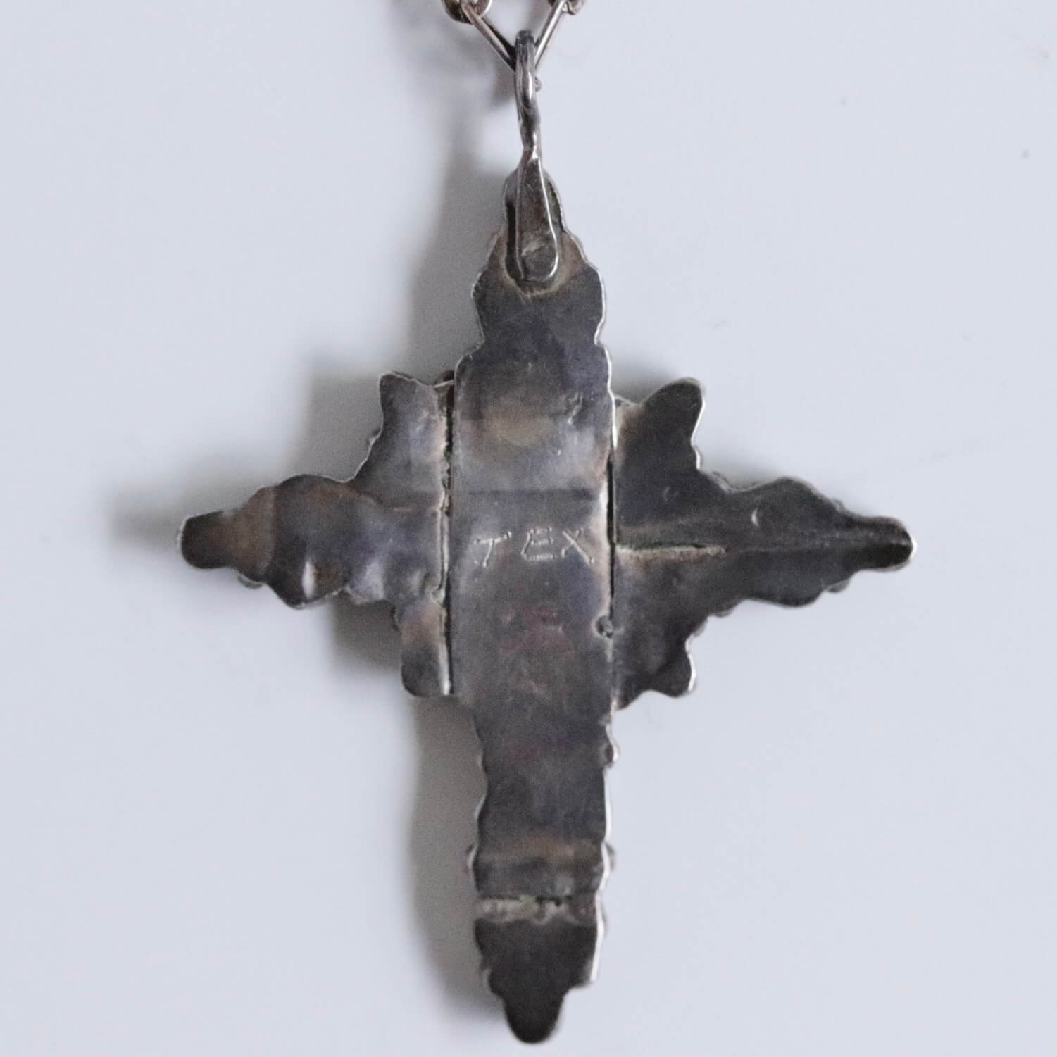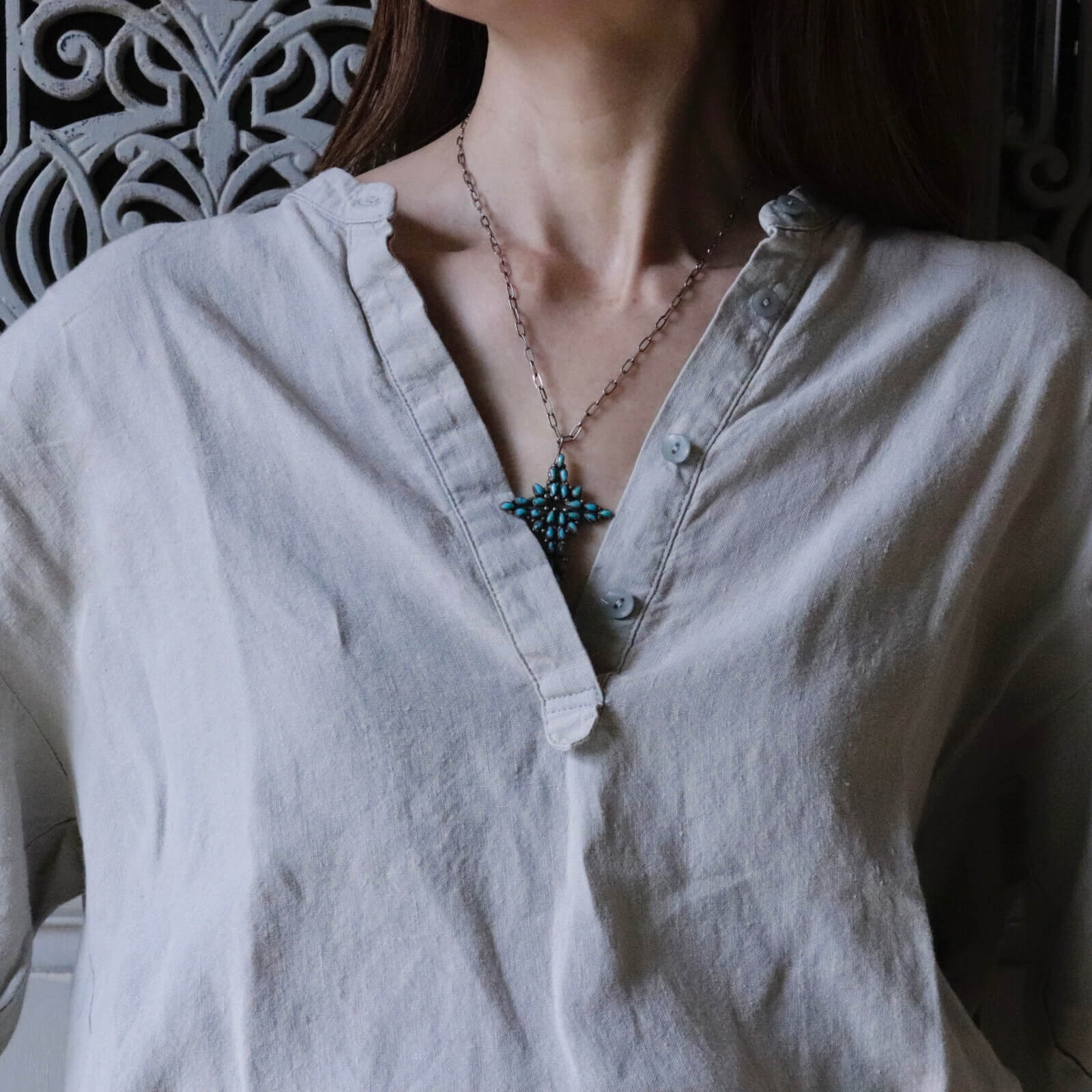 雫型にカットされたターコイズをバランスよくクロスの形に並べています。