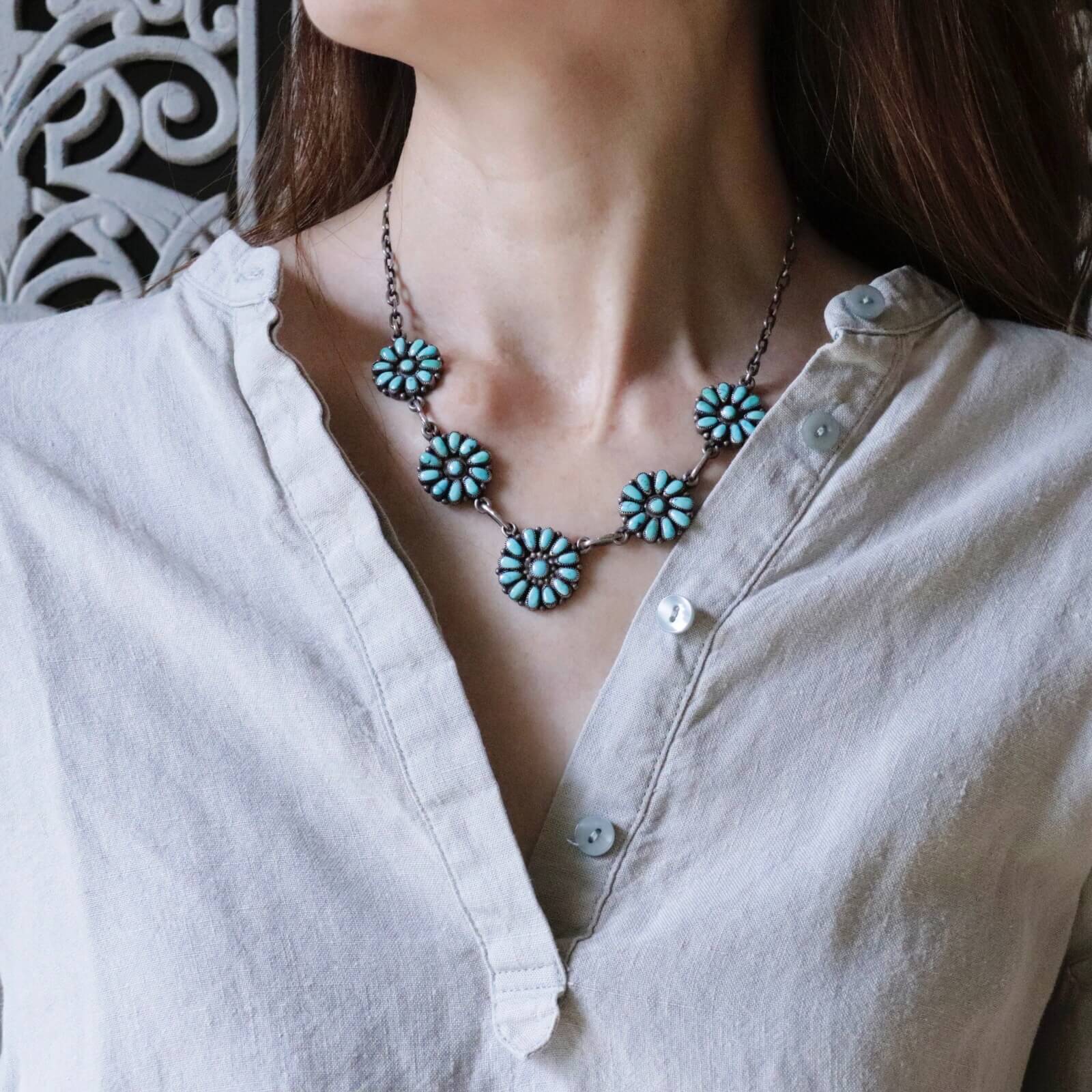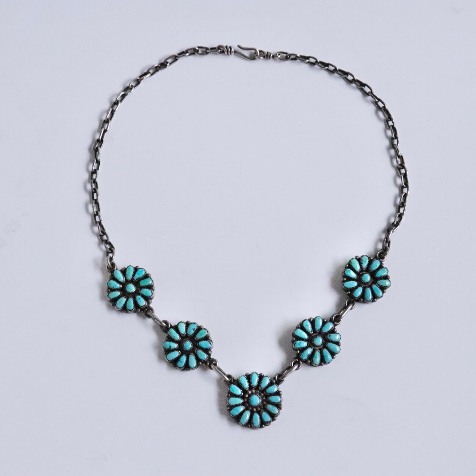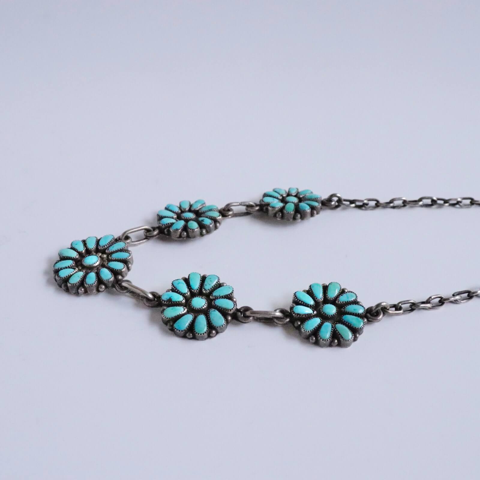 ふっくらとした雫型のターコイズの花びらを並べたお花を5つ繋いでネックレスにしています。
