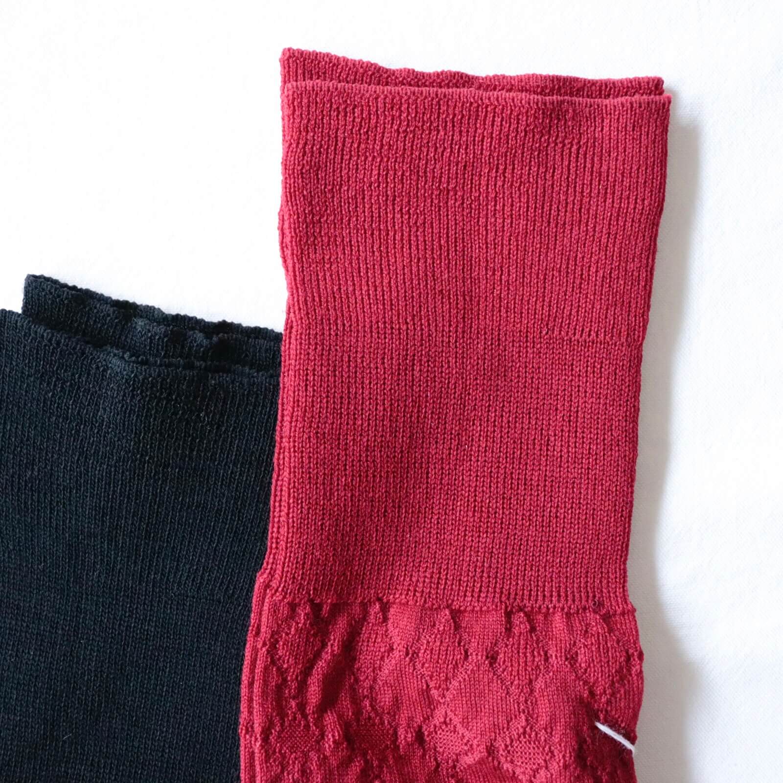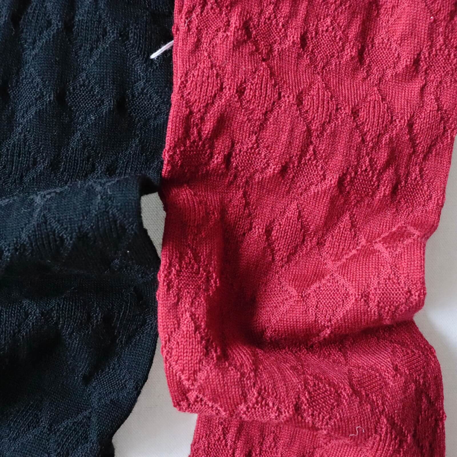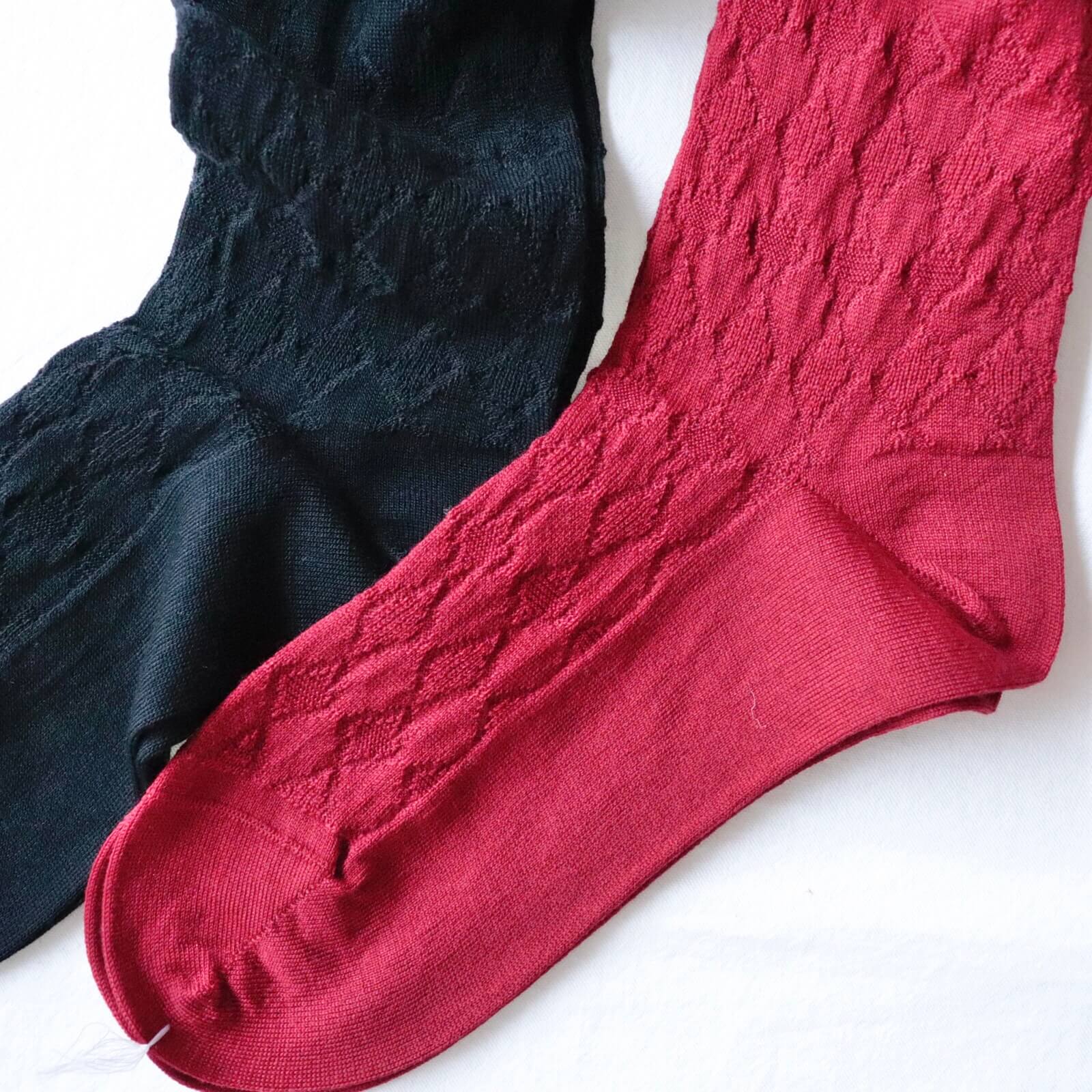 スーパーメリノを使用、アーガイル柄が連続する編み柄のハイソックスです。