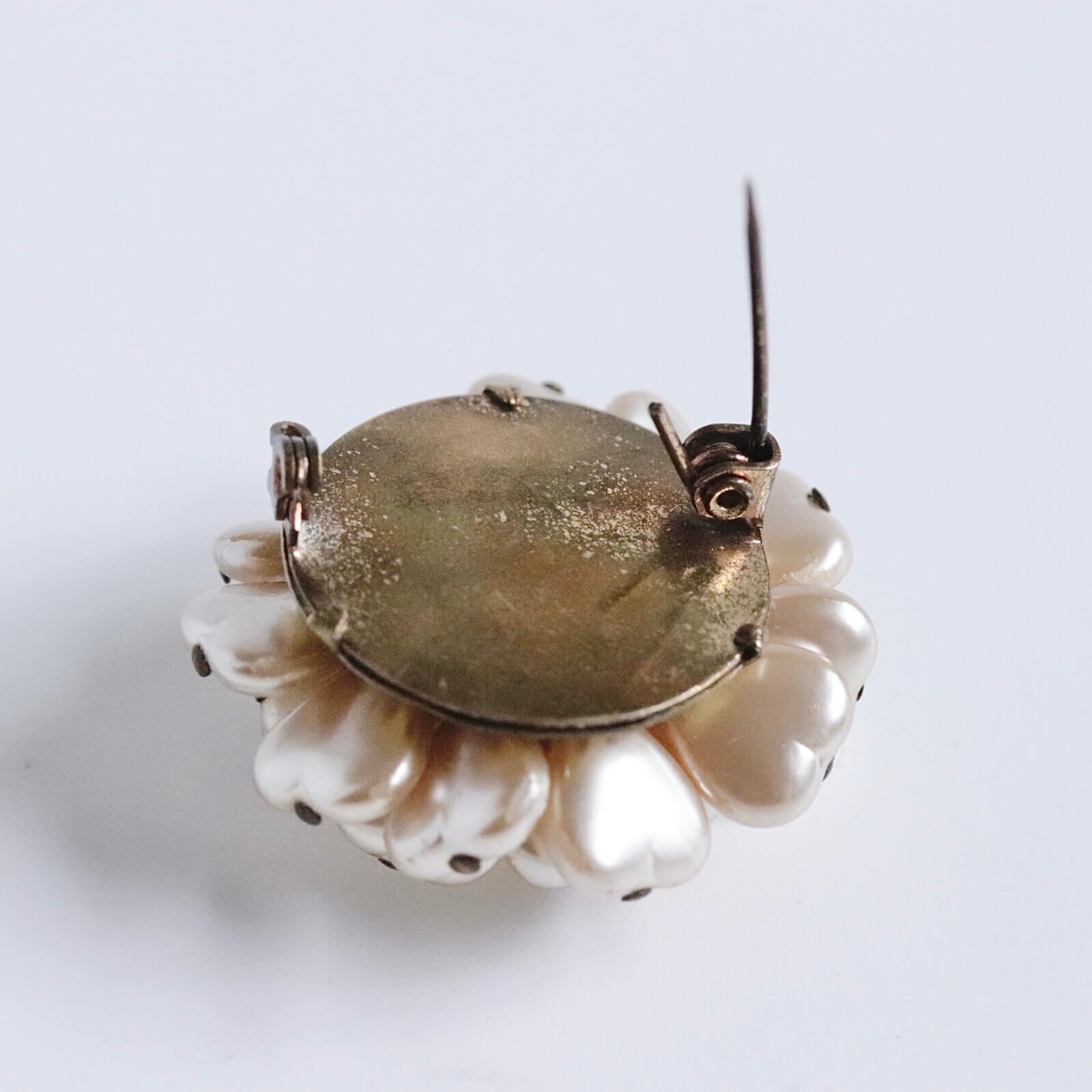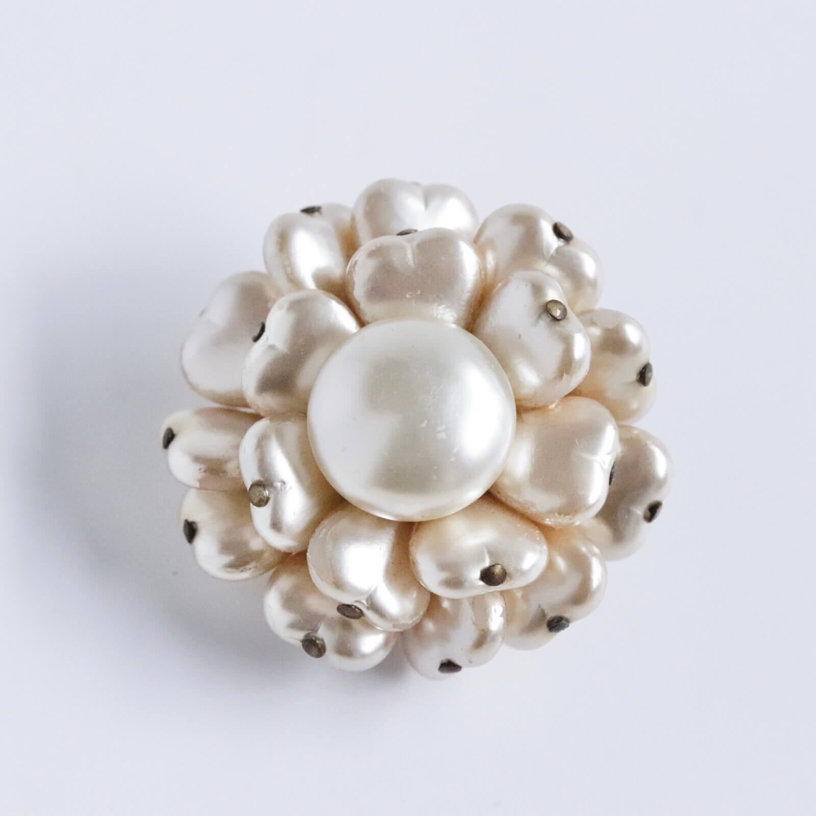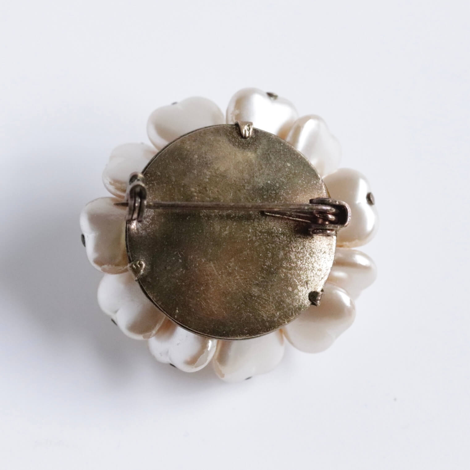 ハート型の花びらが、丸いドーム型のパールを囲むようにセットされたお花モチーフのブローチです。