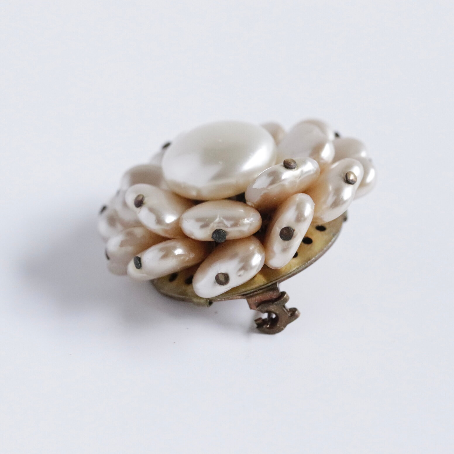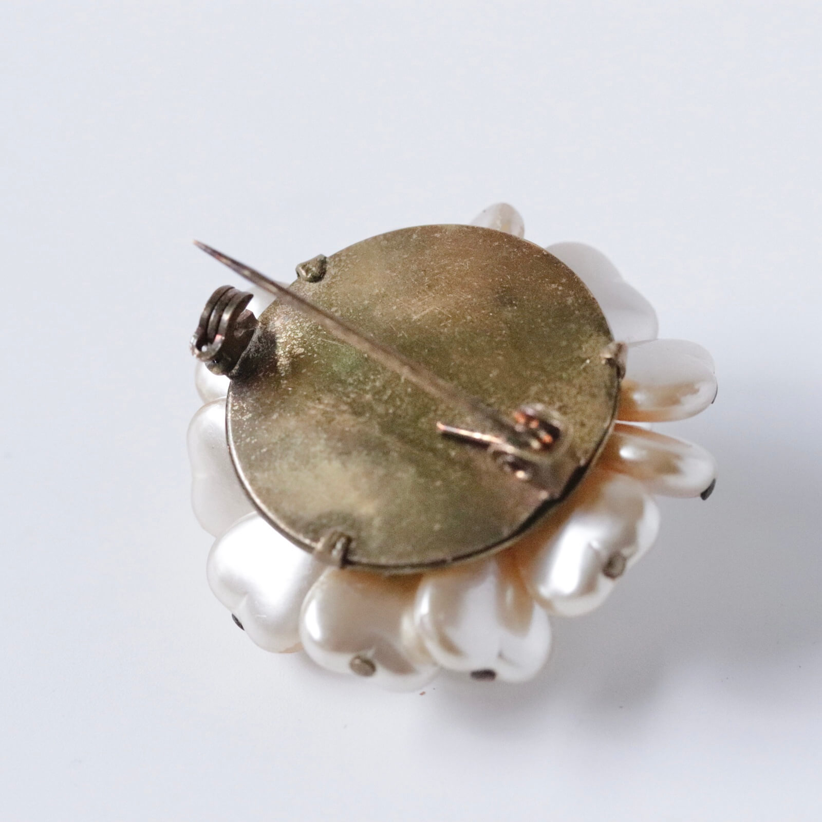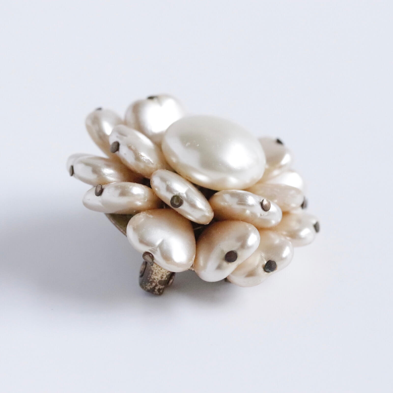 ハート型の花びらが、丸いドーム型のパールを囲むようにセットされたお花モチーフのブローチです。