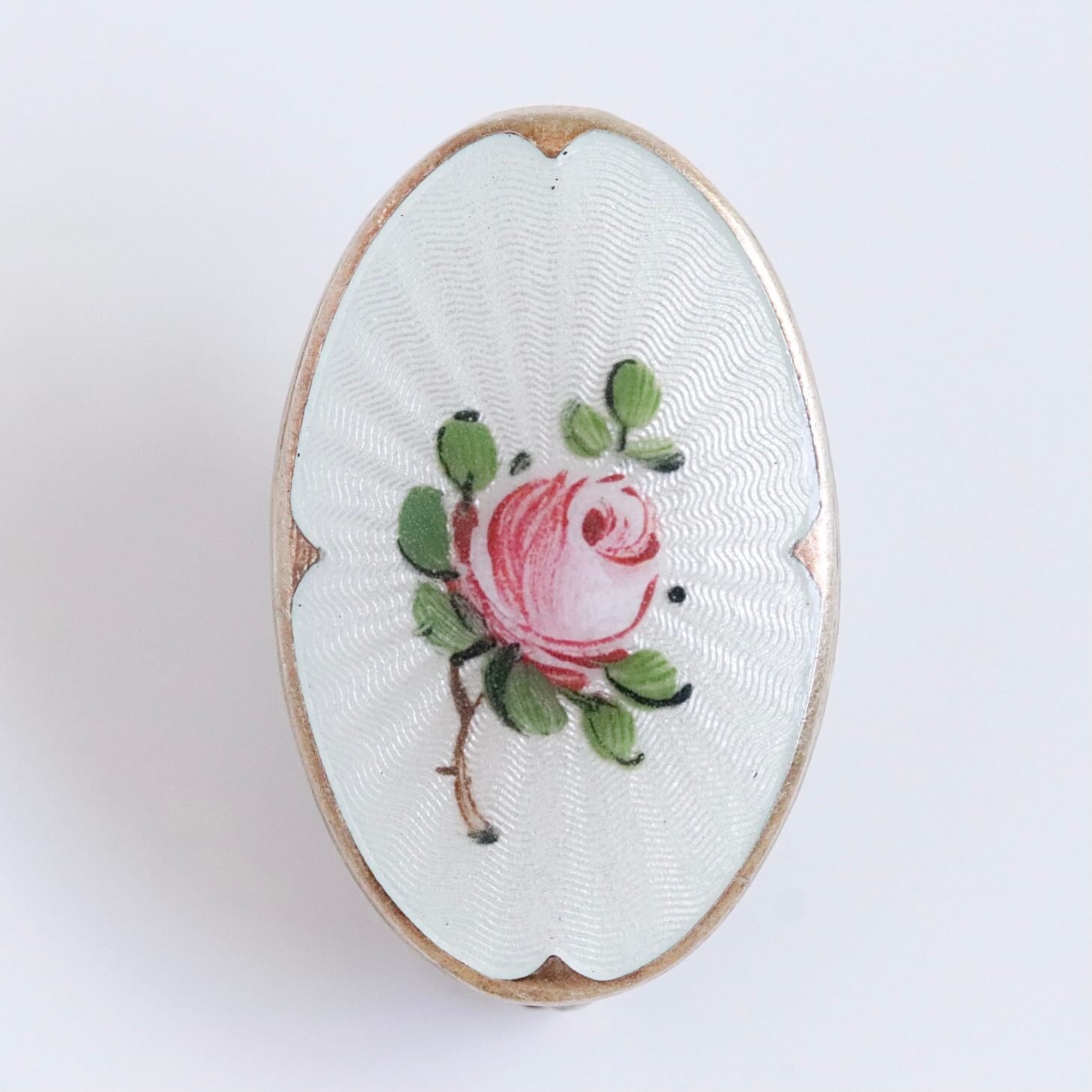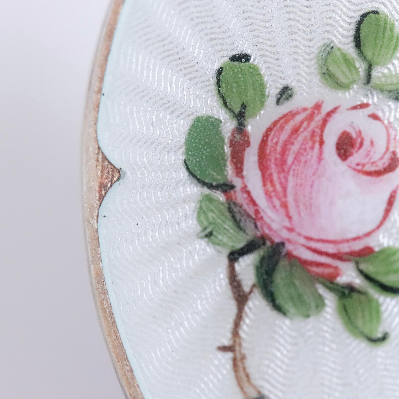 こちらは繊細な薔薇の図案が中央に描かれ、放射線状に彫り込まれたギロッシュ加工が輝くような上品なジュエリーです。