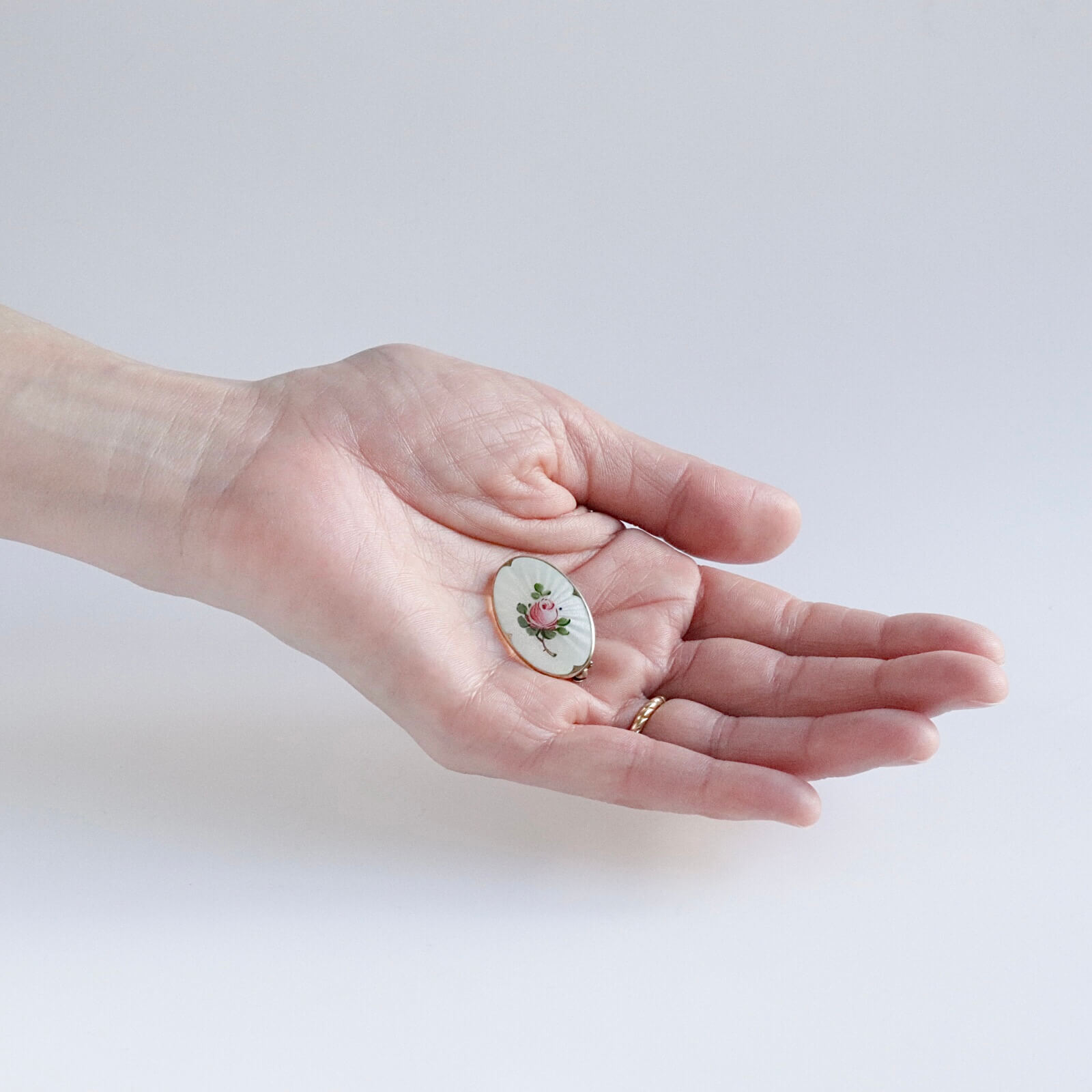 襟元に小さな薔薇を1輪飾るようなブローチです。