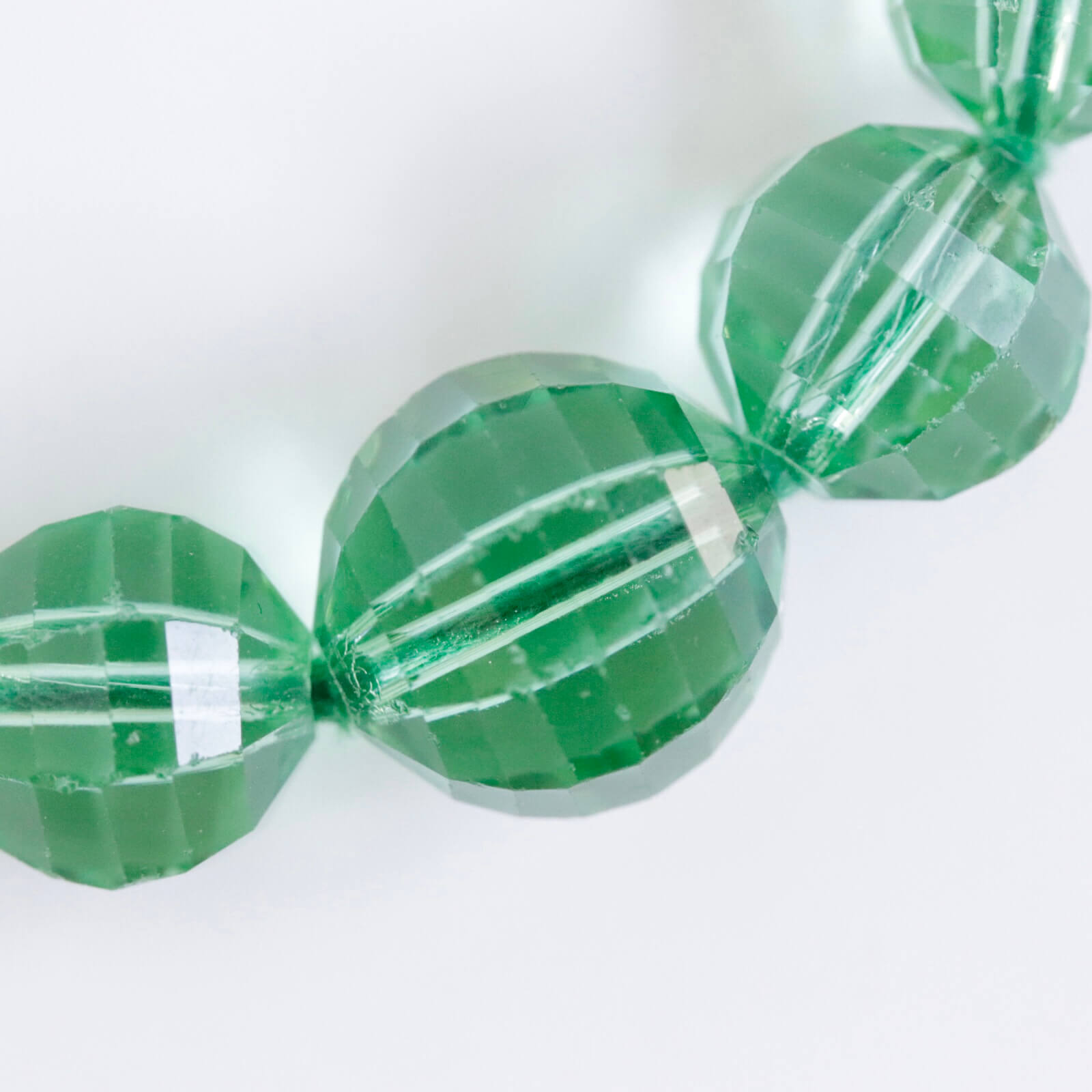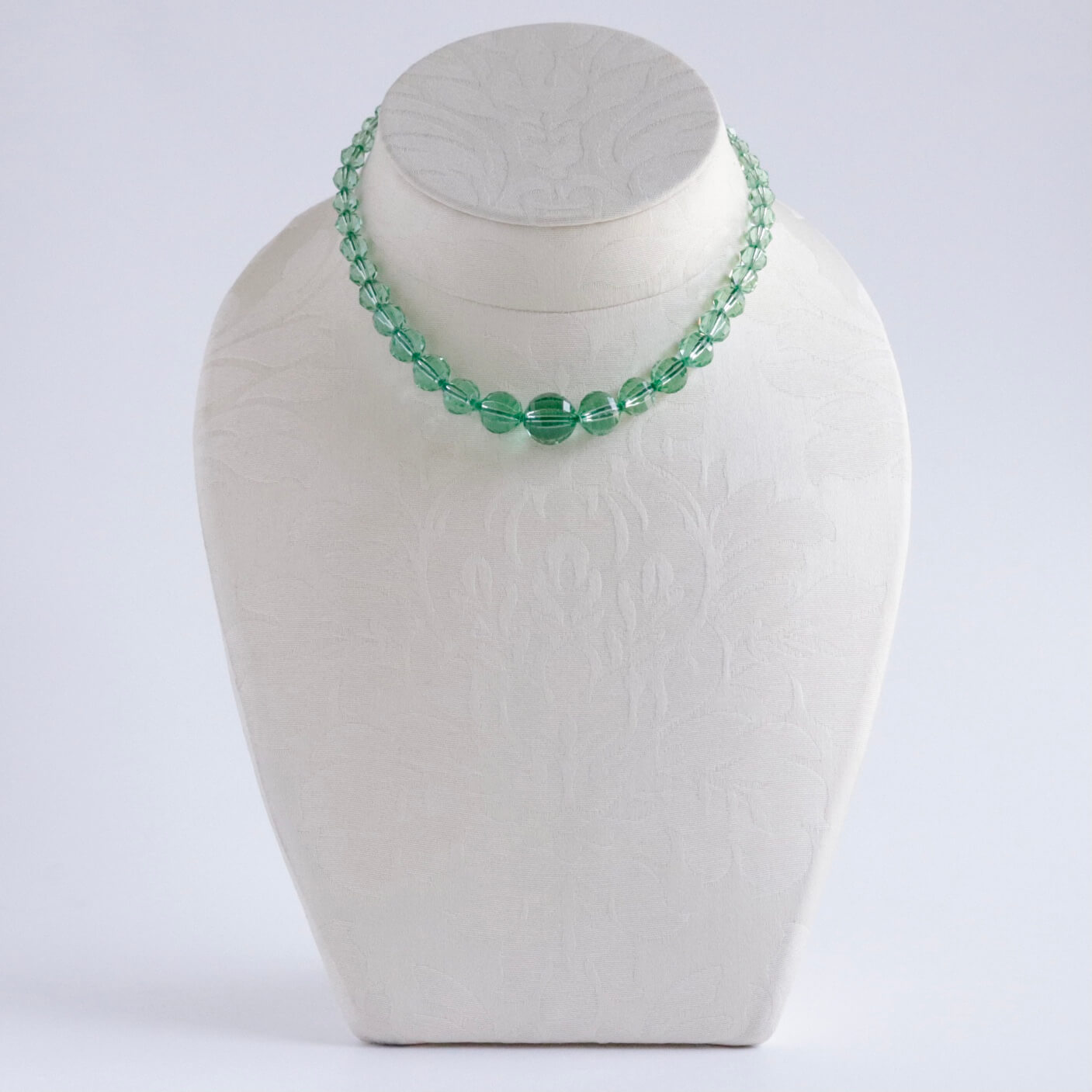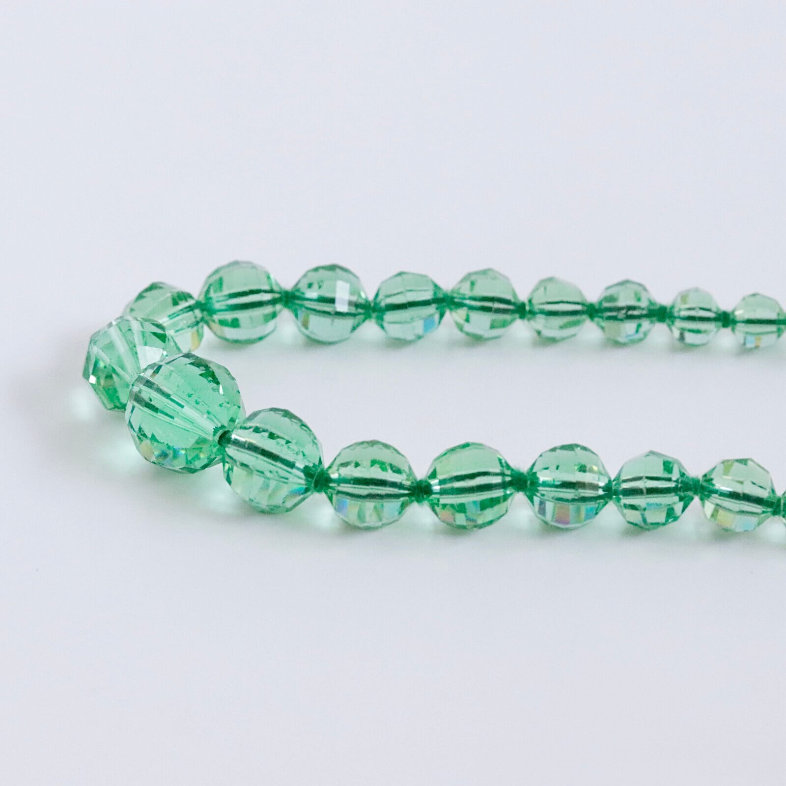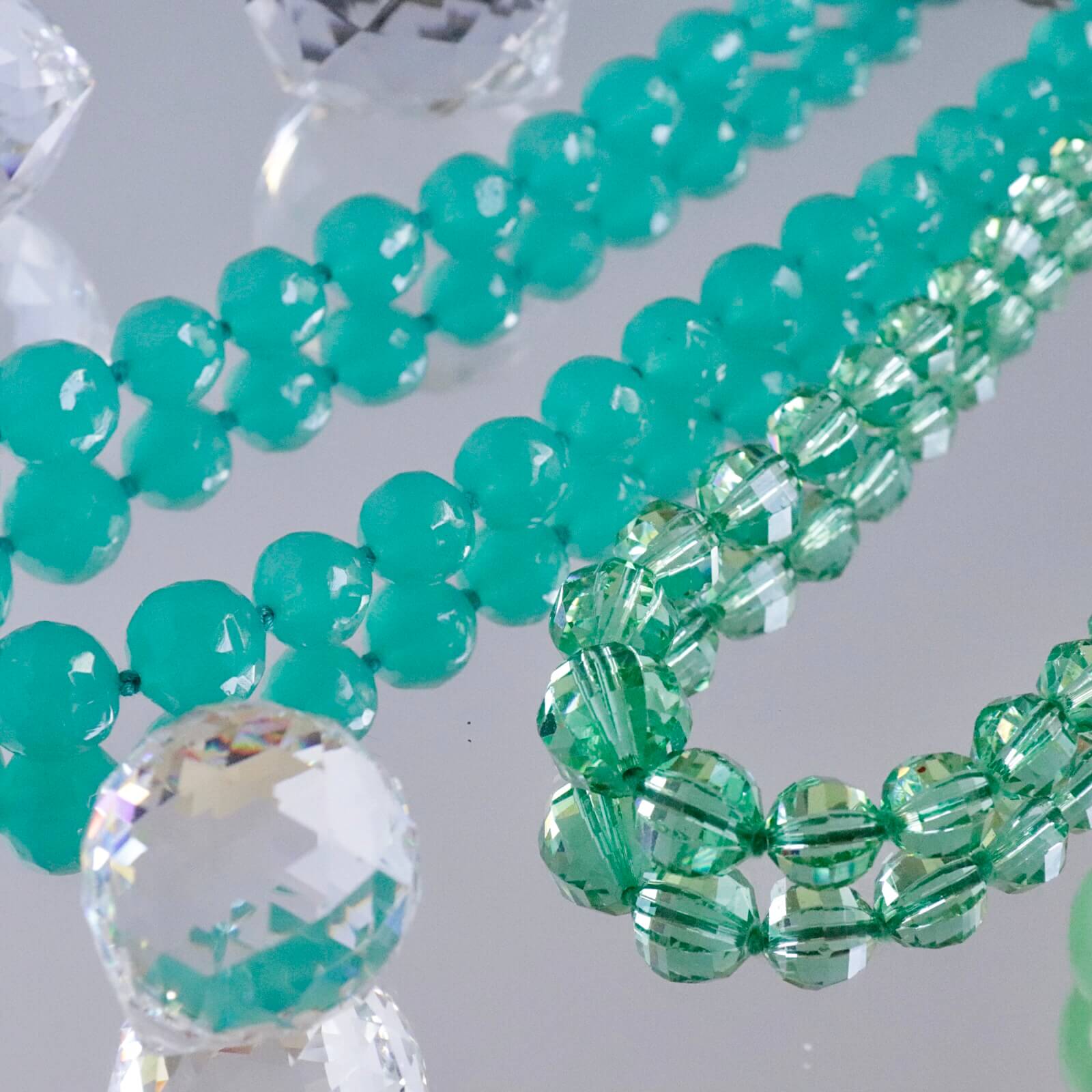 細かいカットが入ったガラスビーズをグラデーションをつけてネックレスに仕立てています。