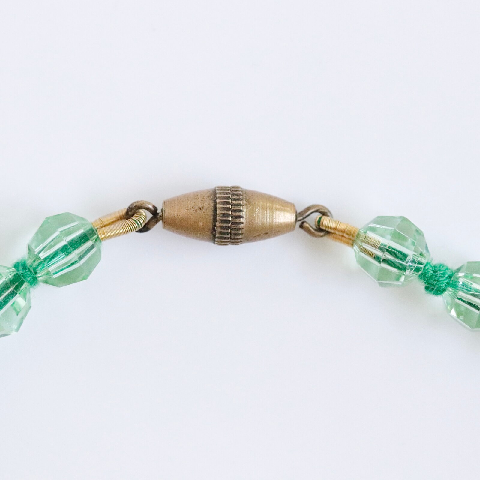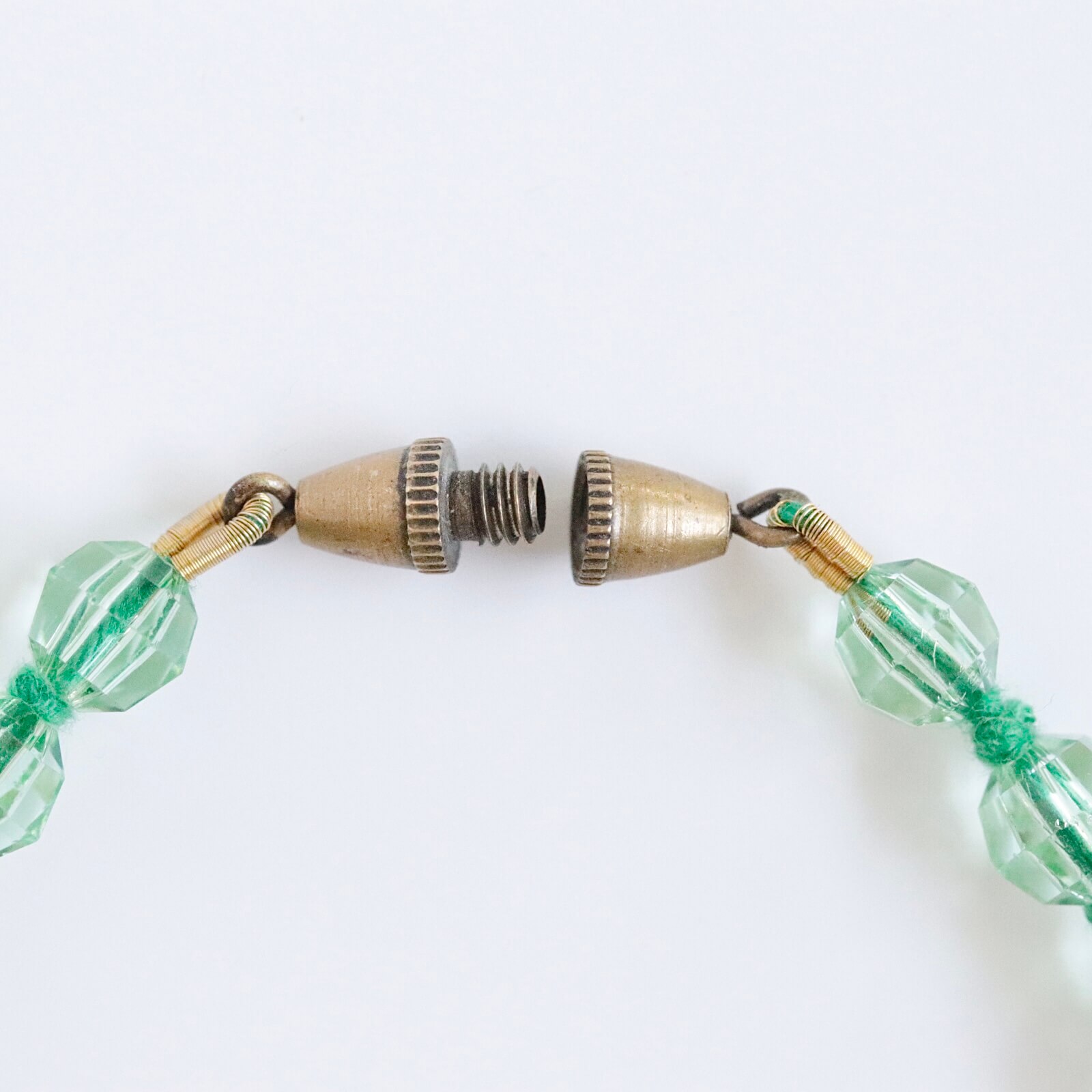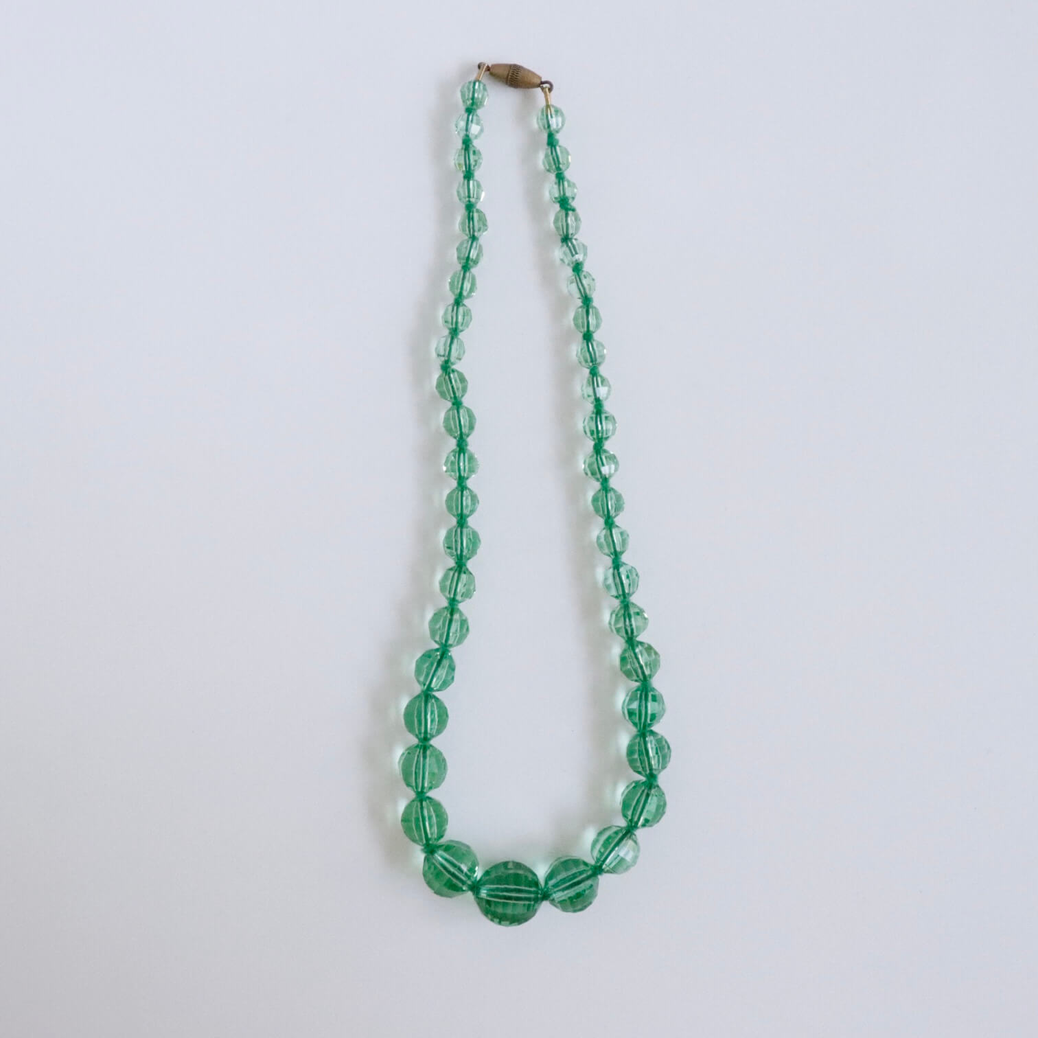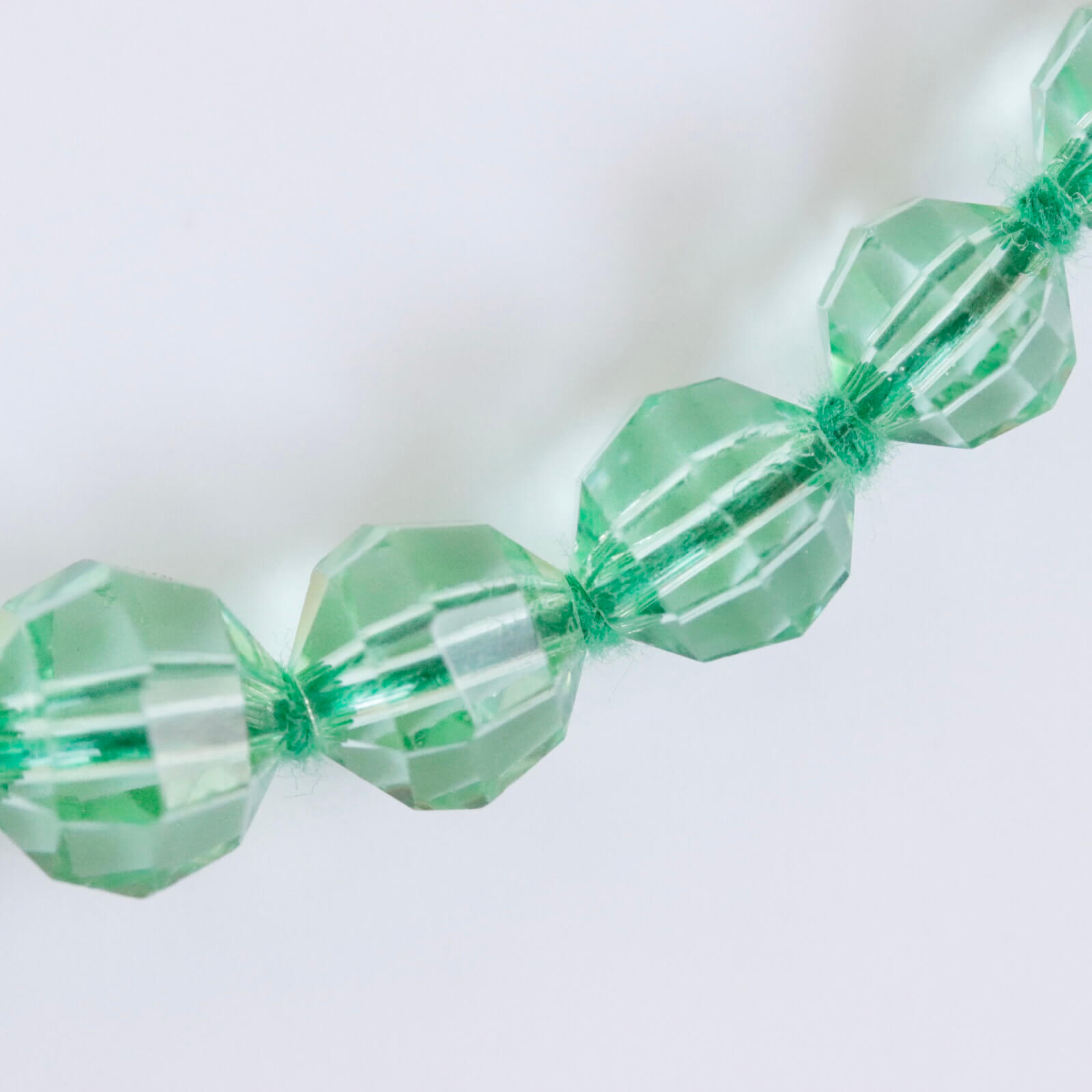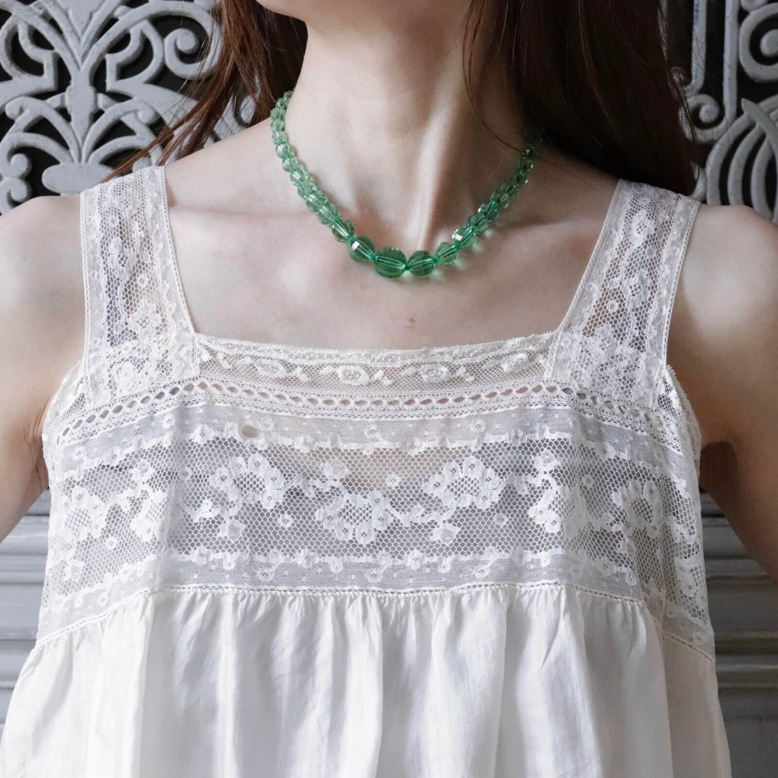 細かいカットが入ったガラスビーズをグラデーションをつけてネックレスに仕立てています。