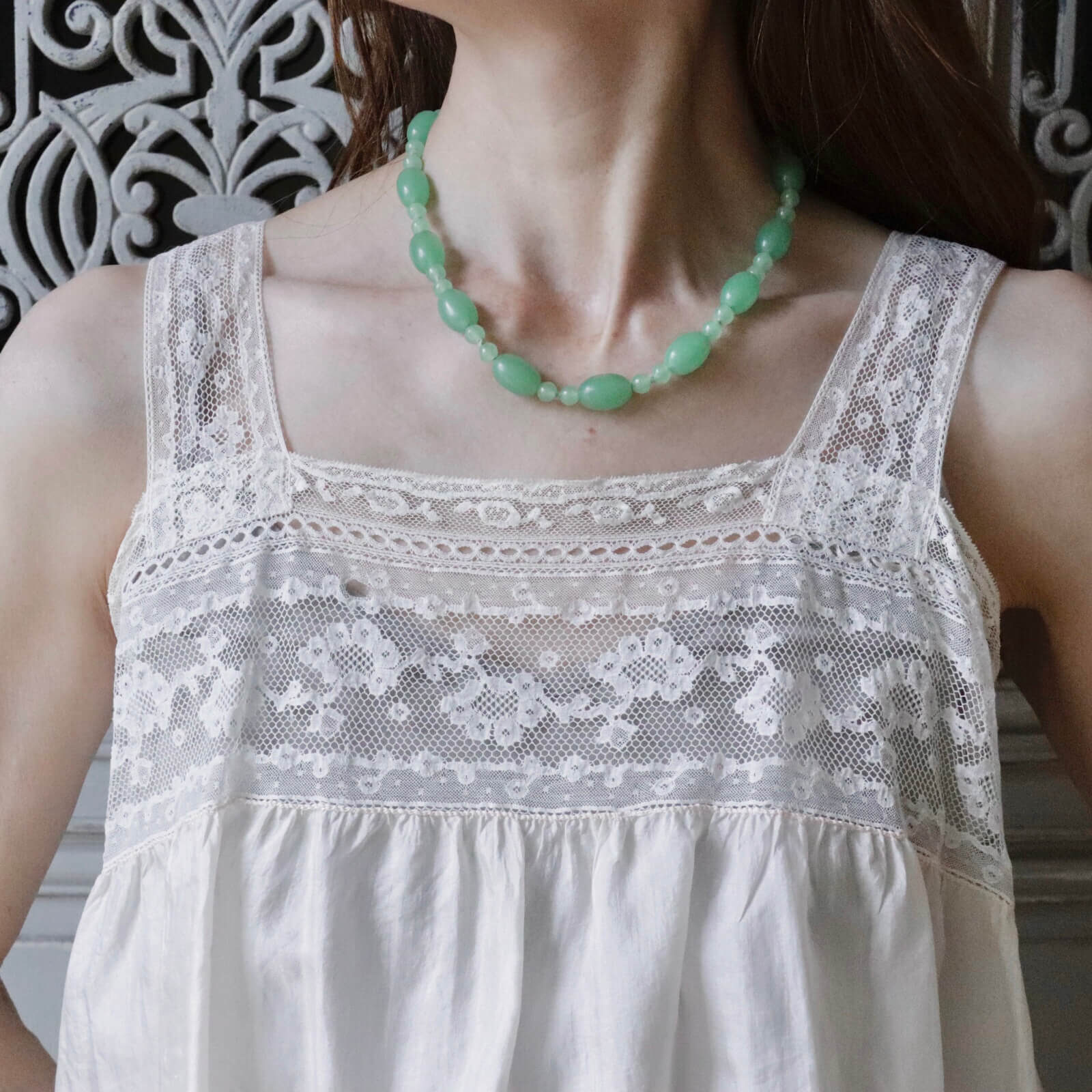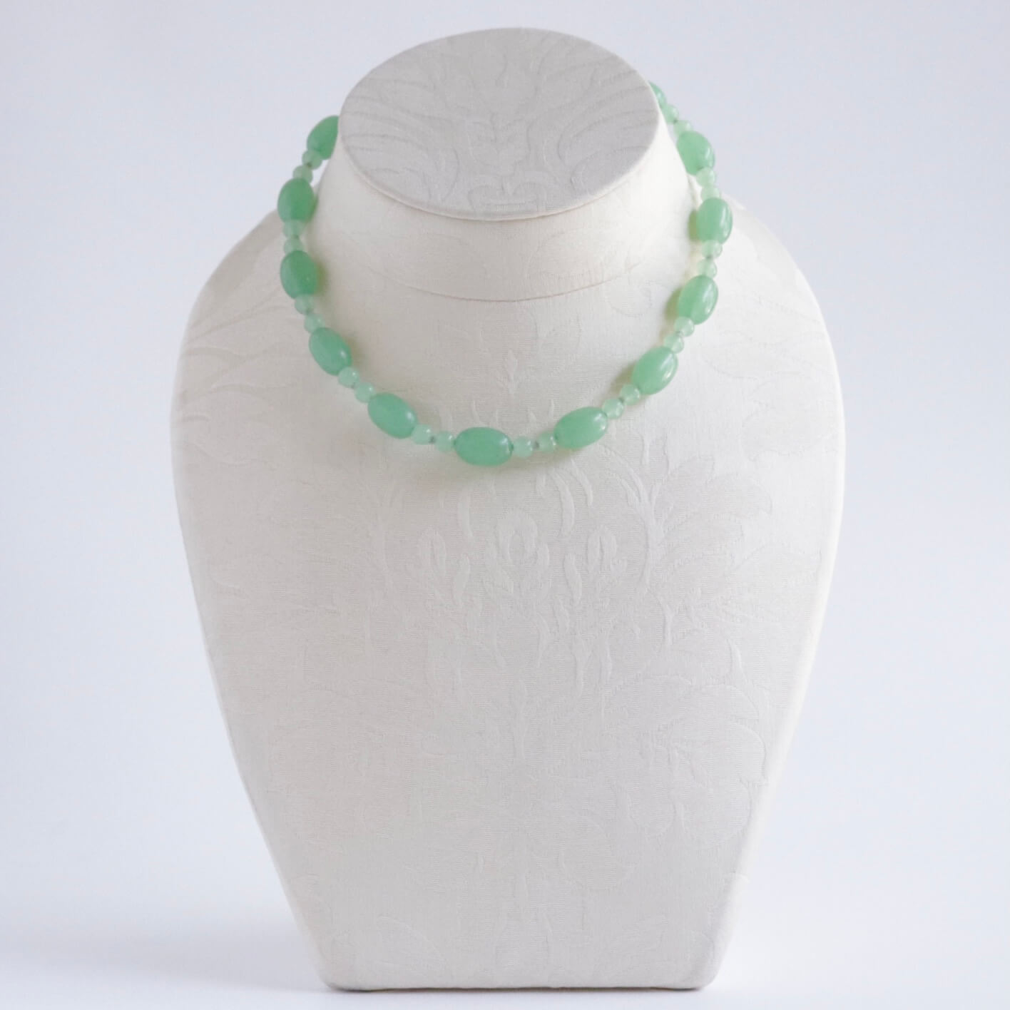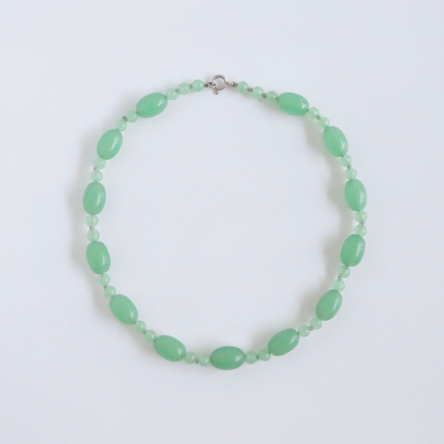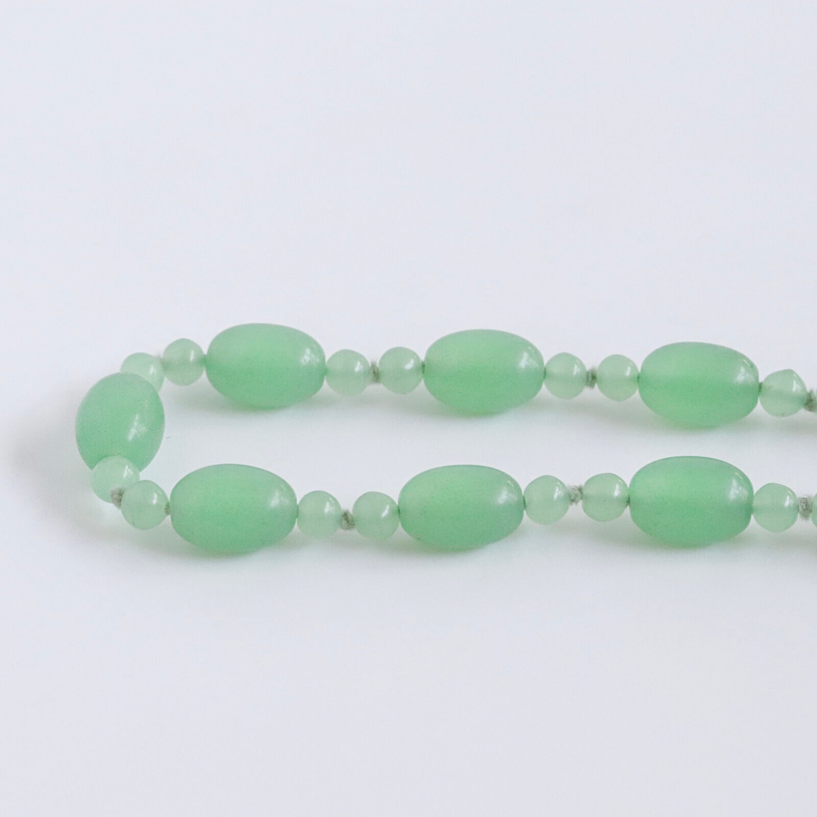 楕円型と丸型のビーズをリズムよく並べてネックレスに仕立てています。