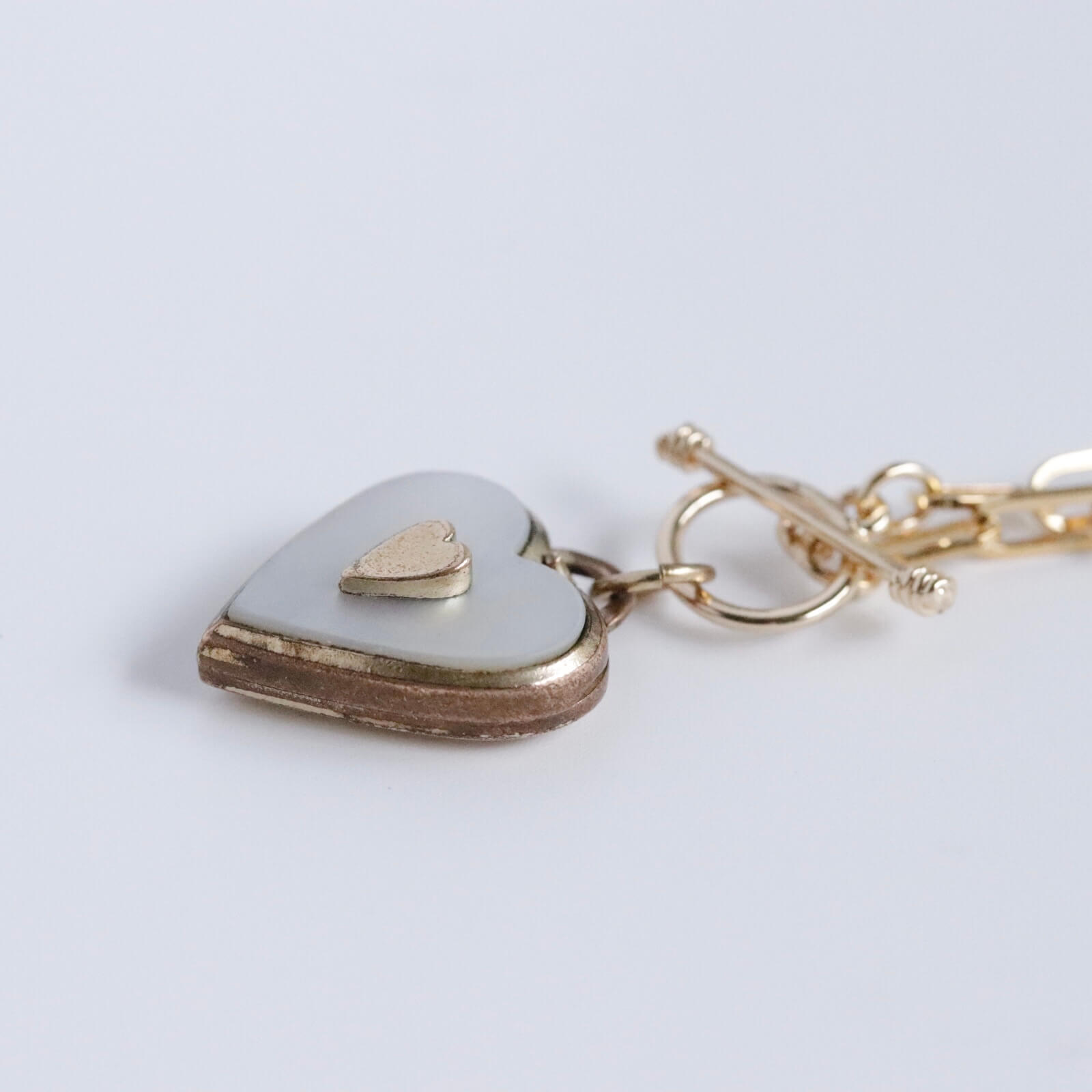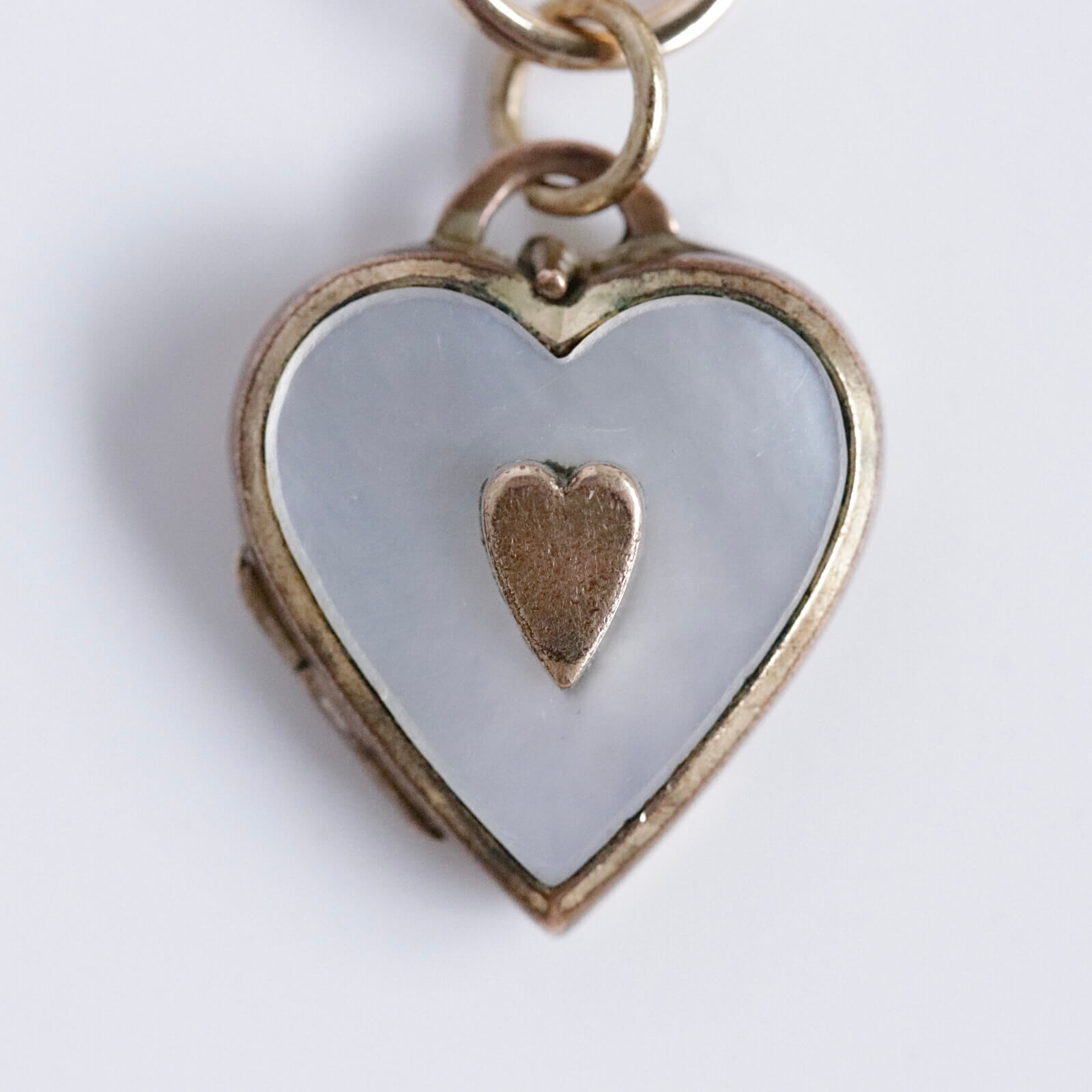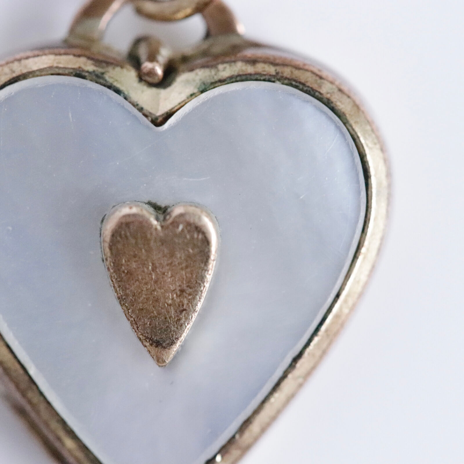 表面はマザーオブパール(白蝶貝)を埋め込んでその上に小さなハートをセットした愛らしいデザイン。