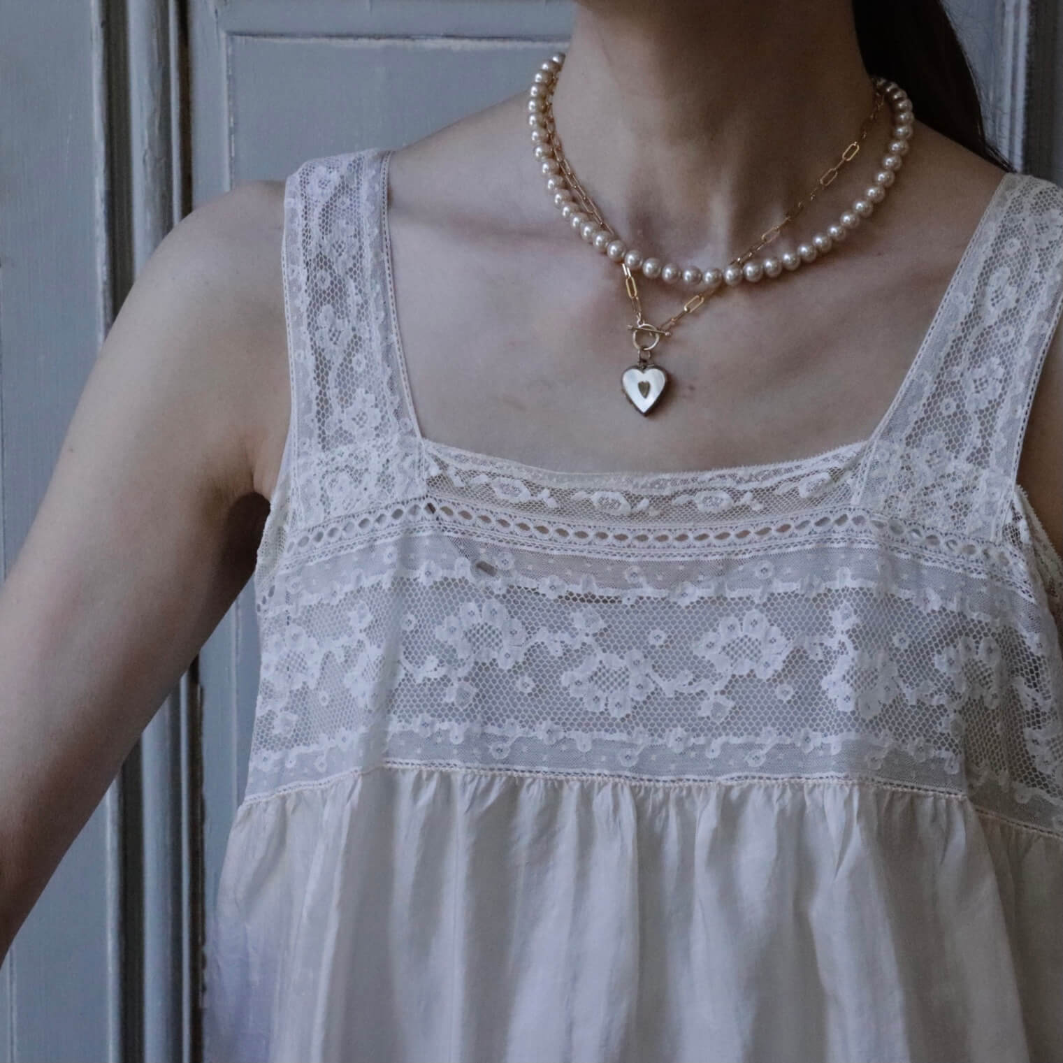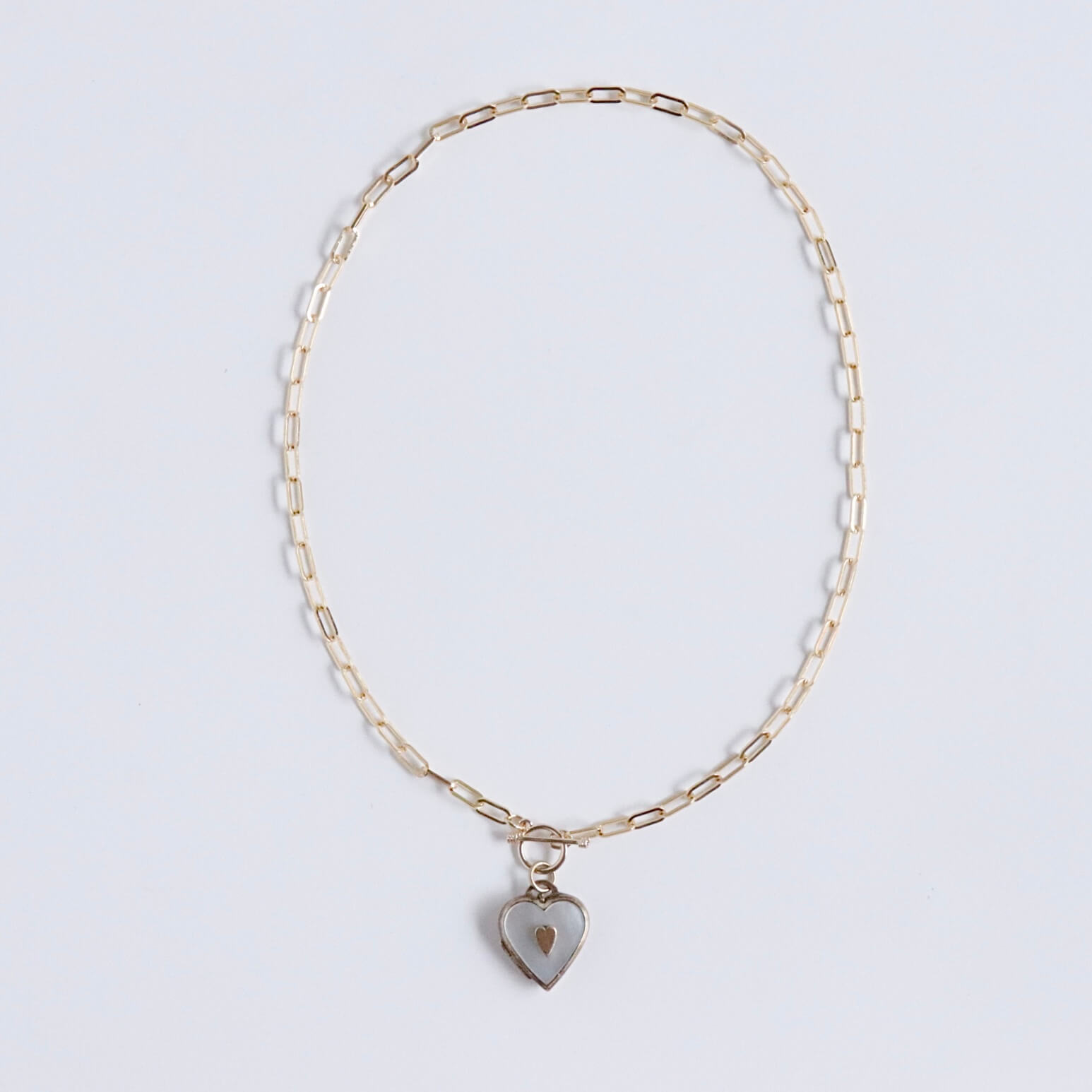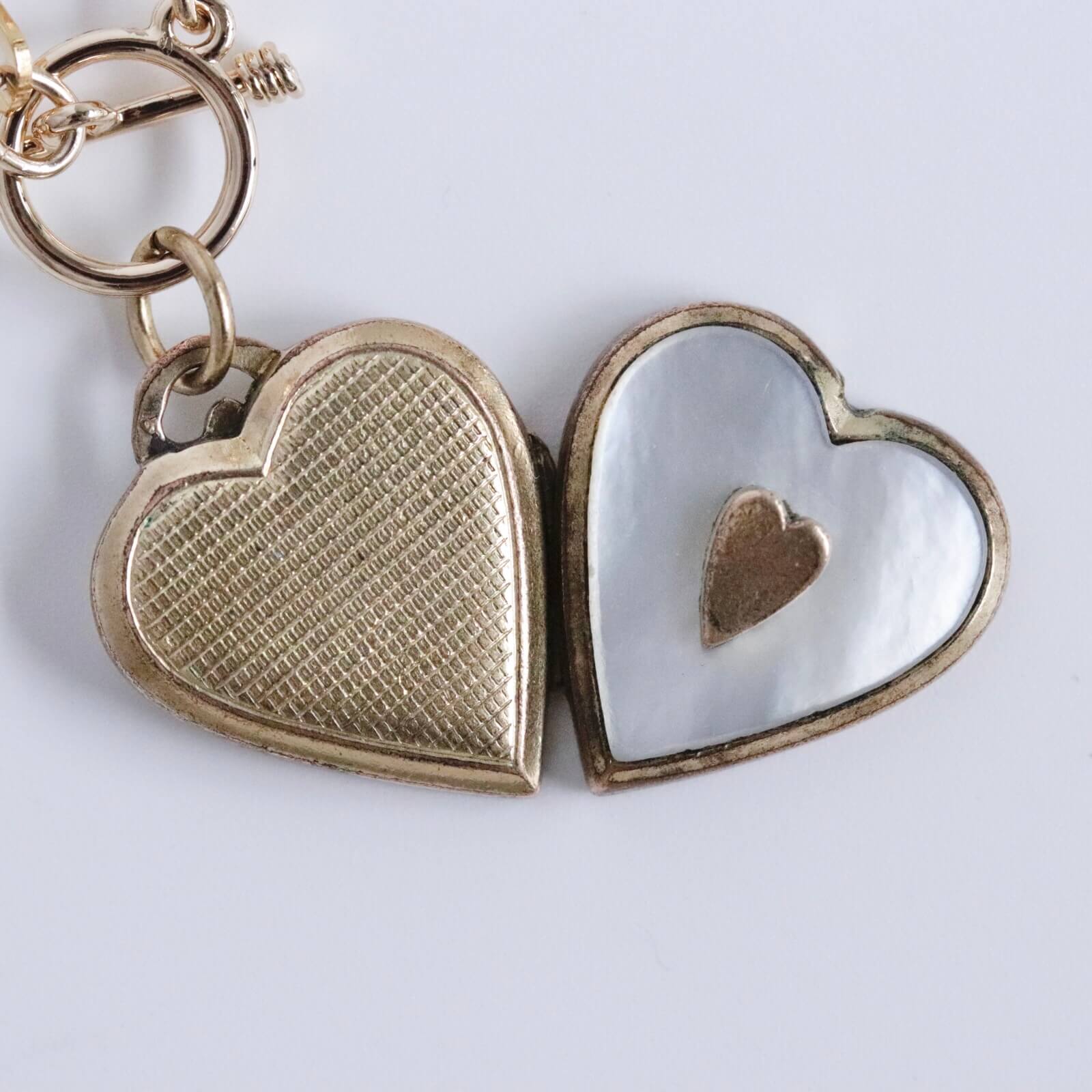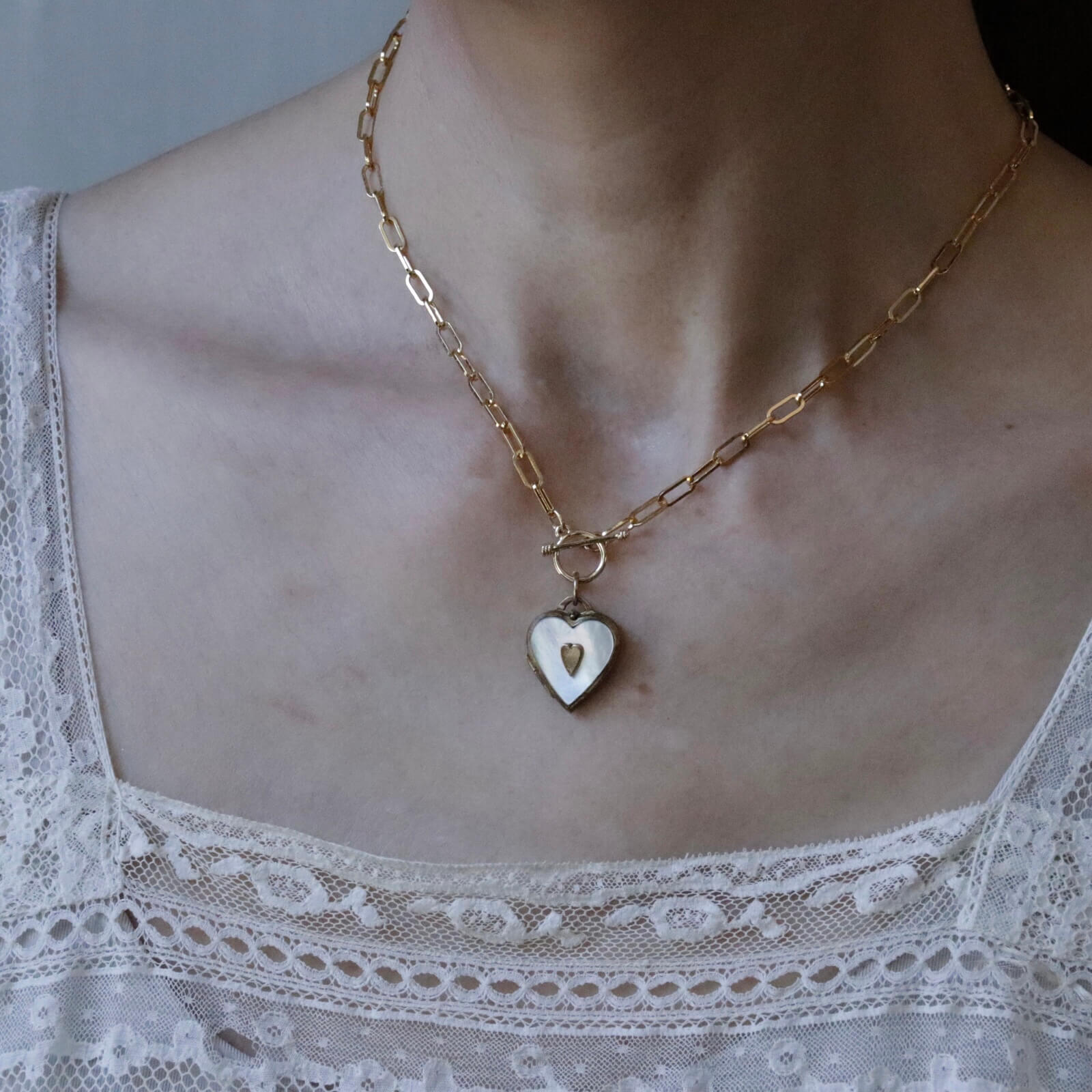 表面はマザーオブパール(白蝶貝)を埋め込んでその上に小さなハートをセットした愛らしいデザイン。
