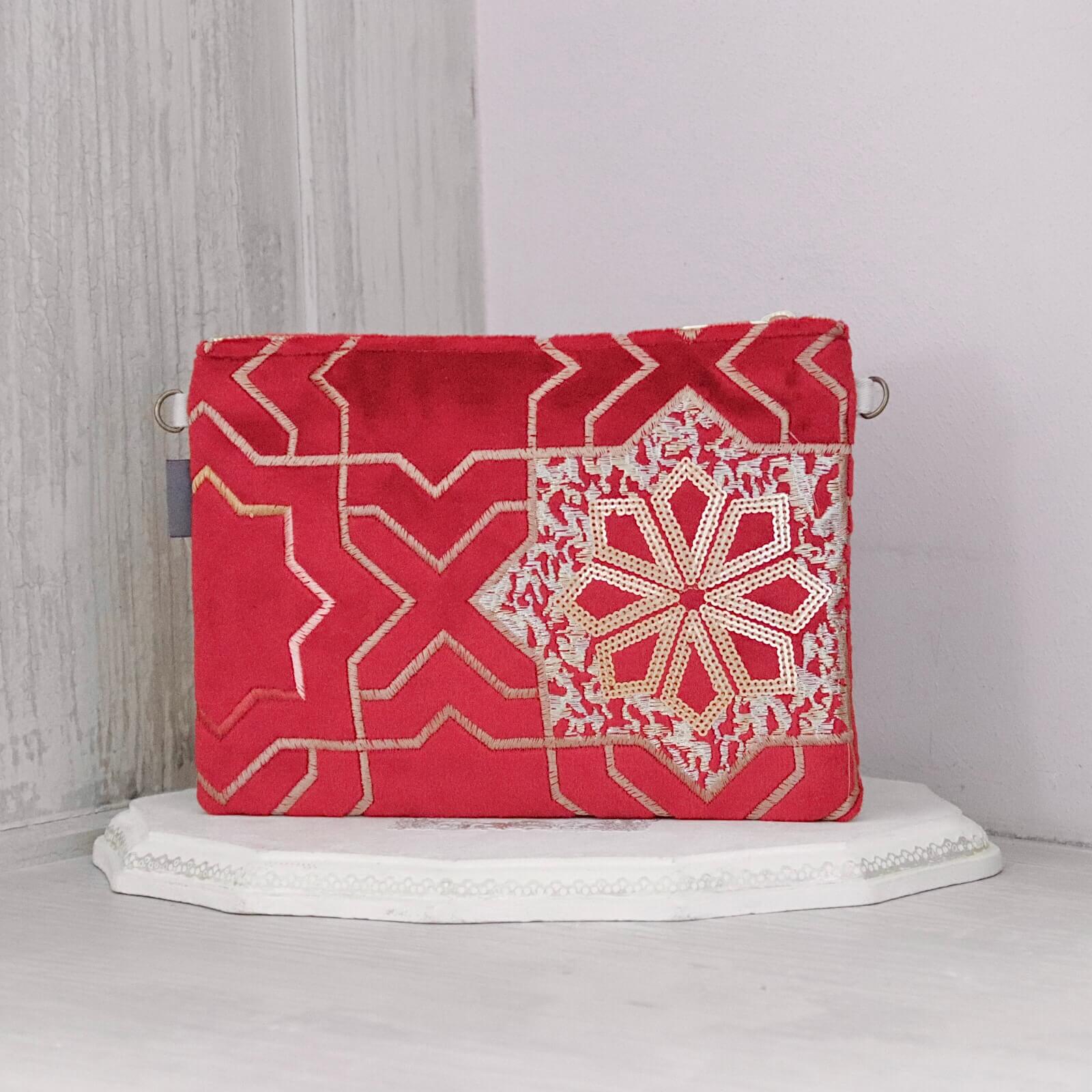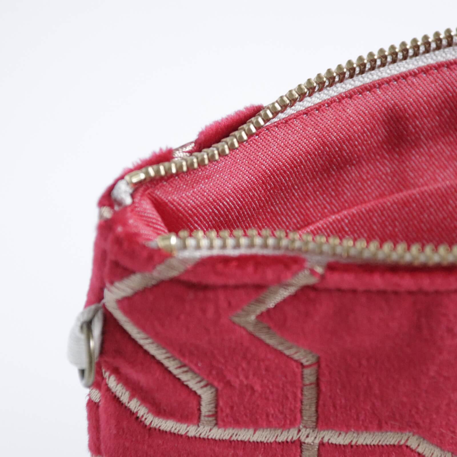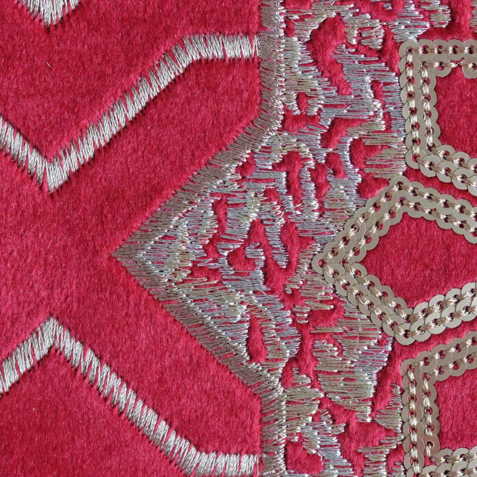 少し起毛がかったベースのレッドカラーに、ゴールドの刺繍と控えめなマットゴールドのスパンコールが縫われています。
