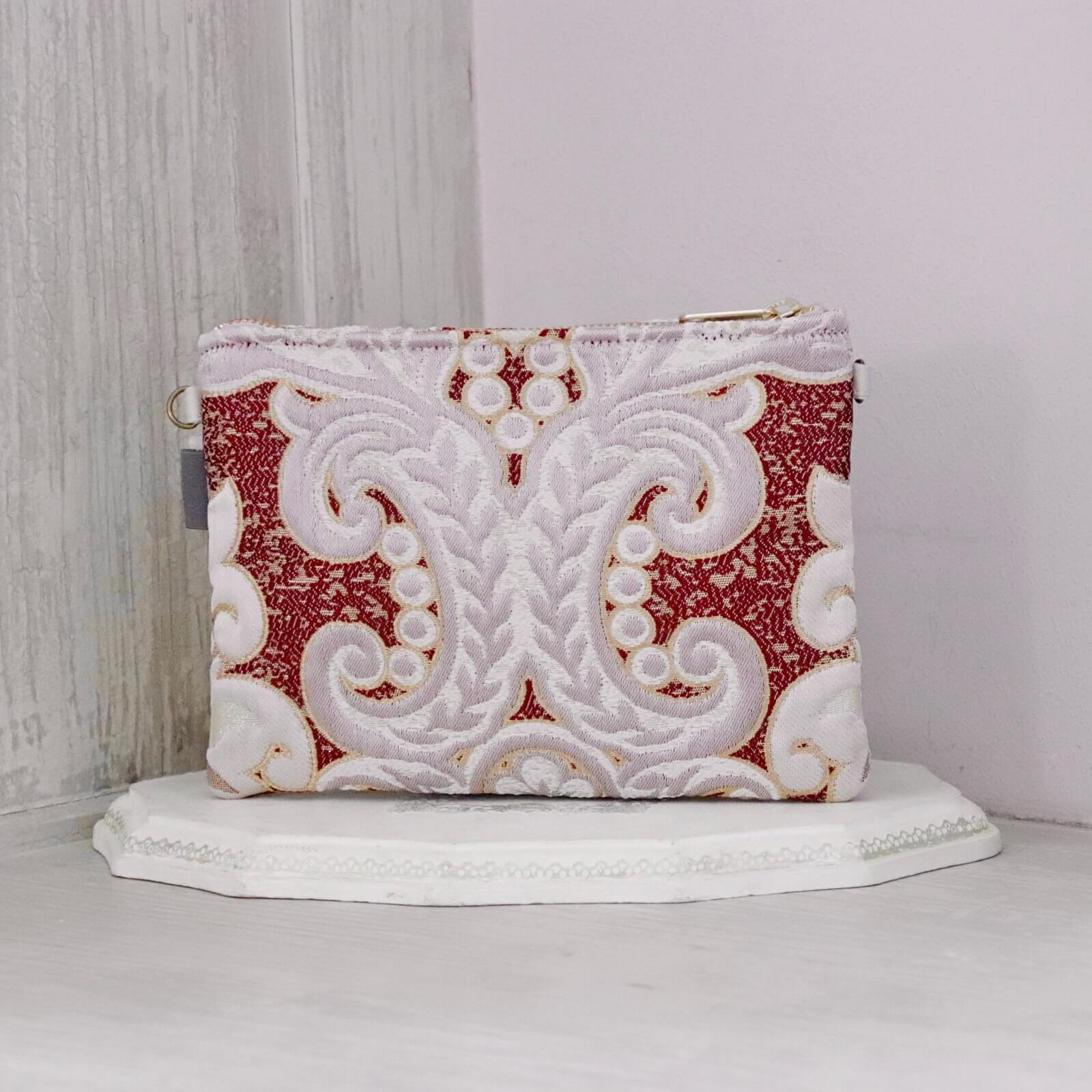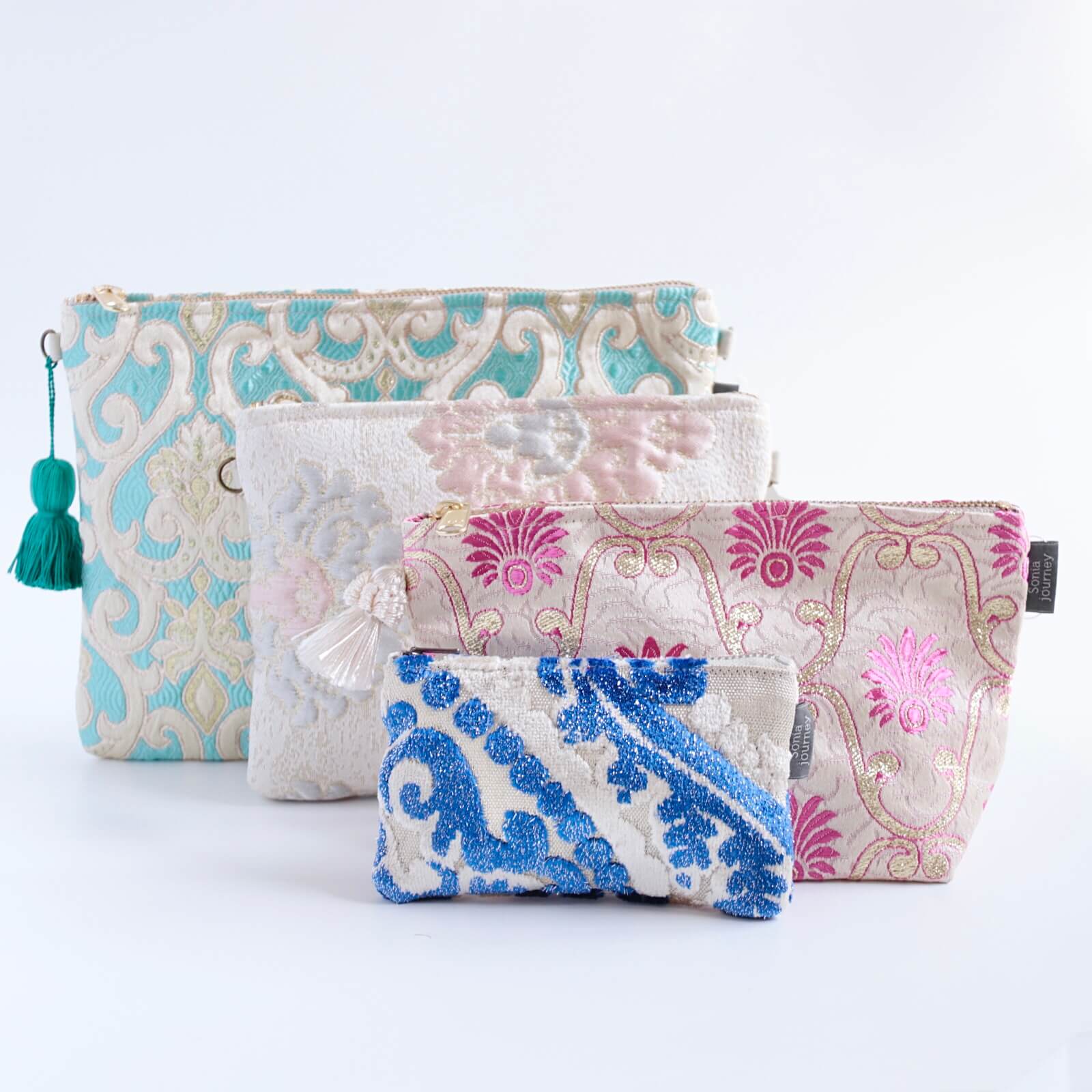ベースにゴールドが入っているため上品な華やかさがあるスクエアポーチです。