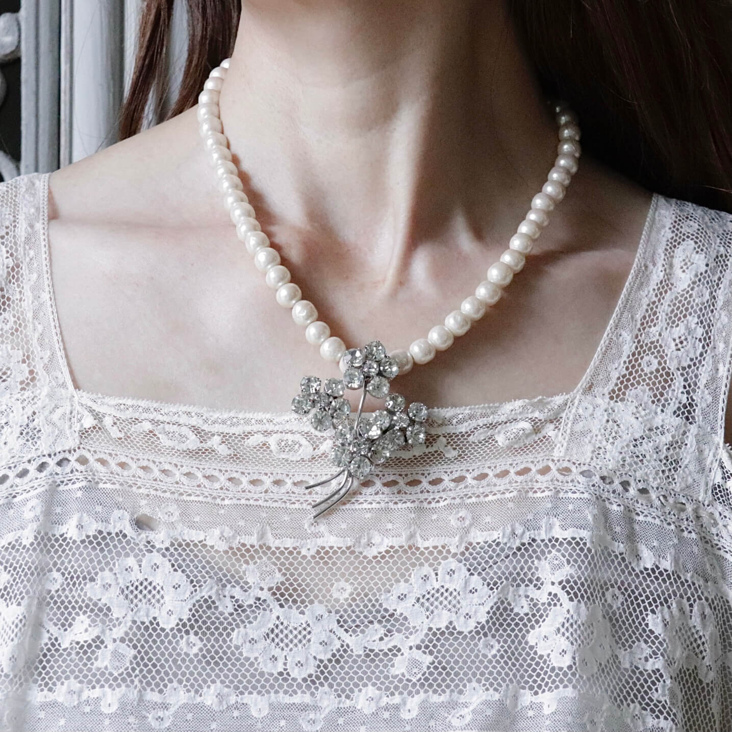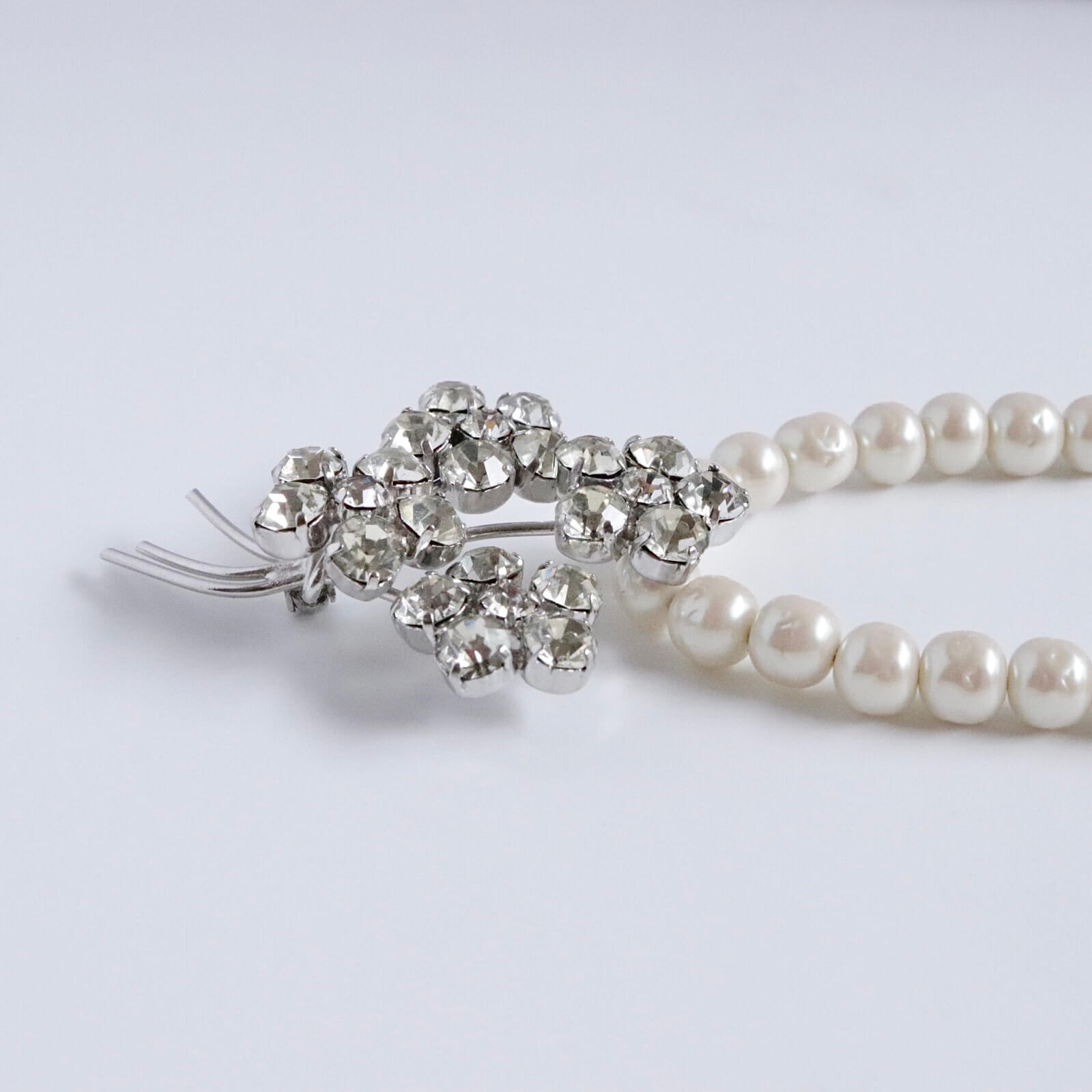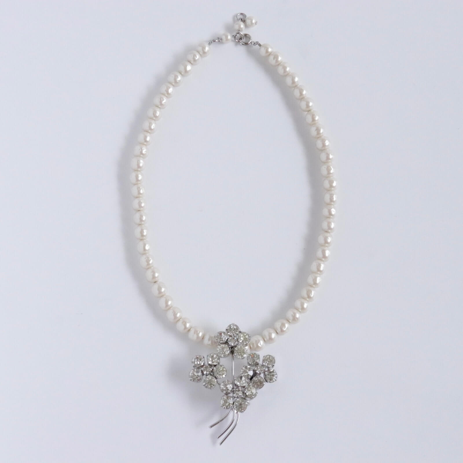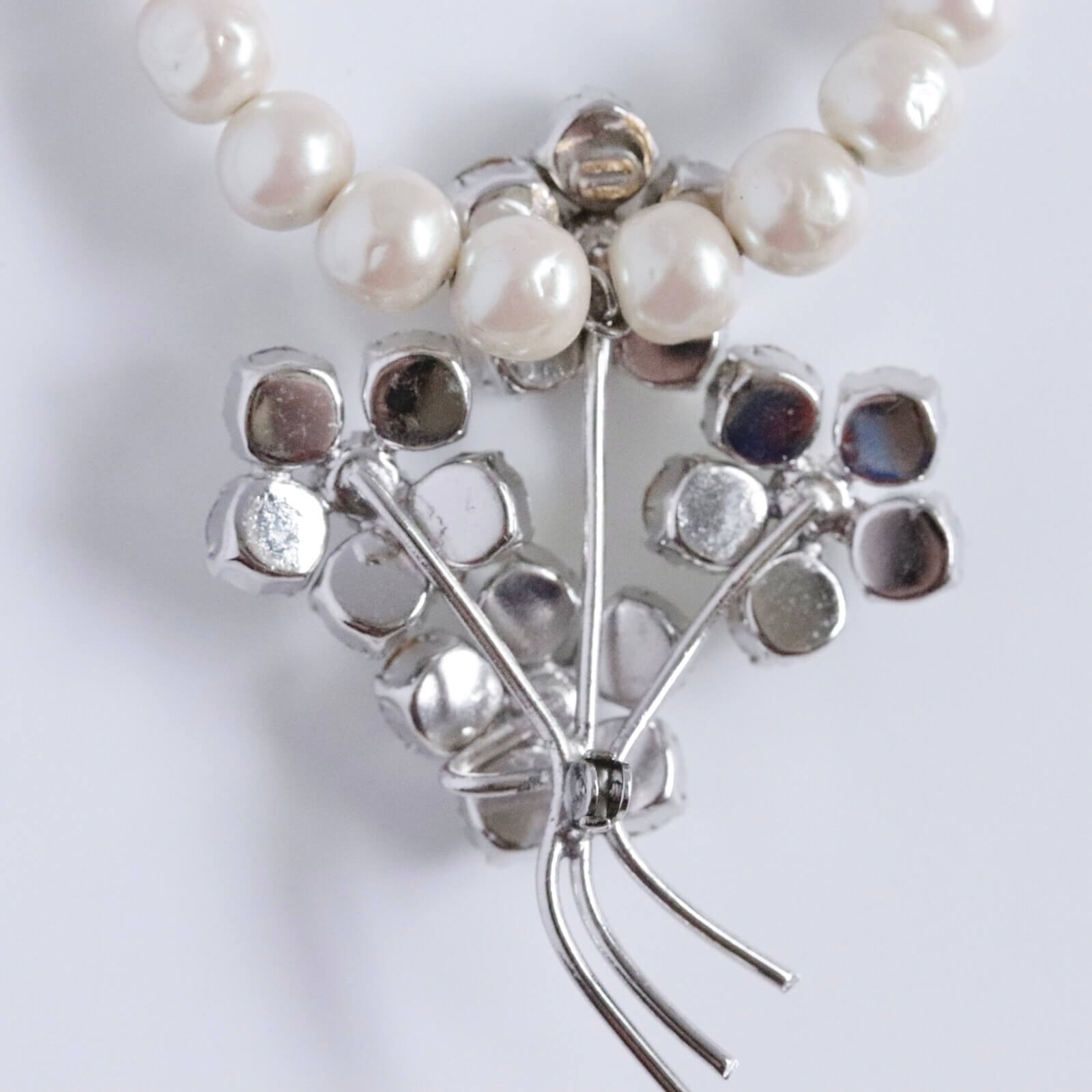 1950年代のブローチをチャームに仕立てたパールのネックレスです。