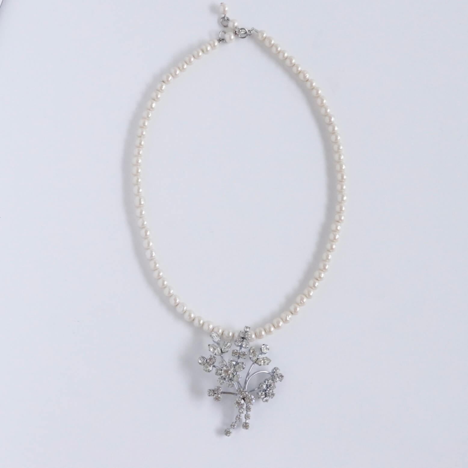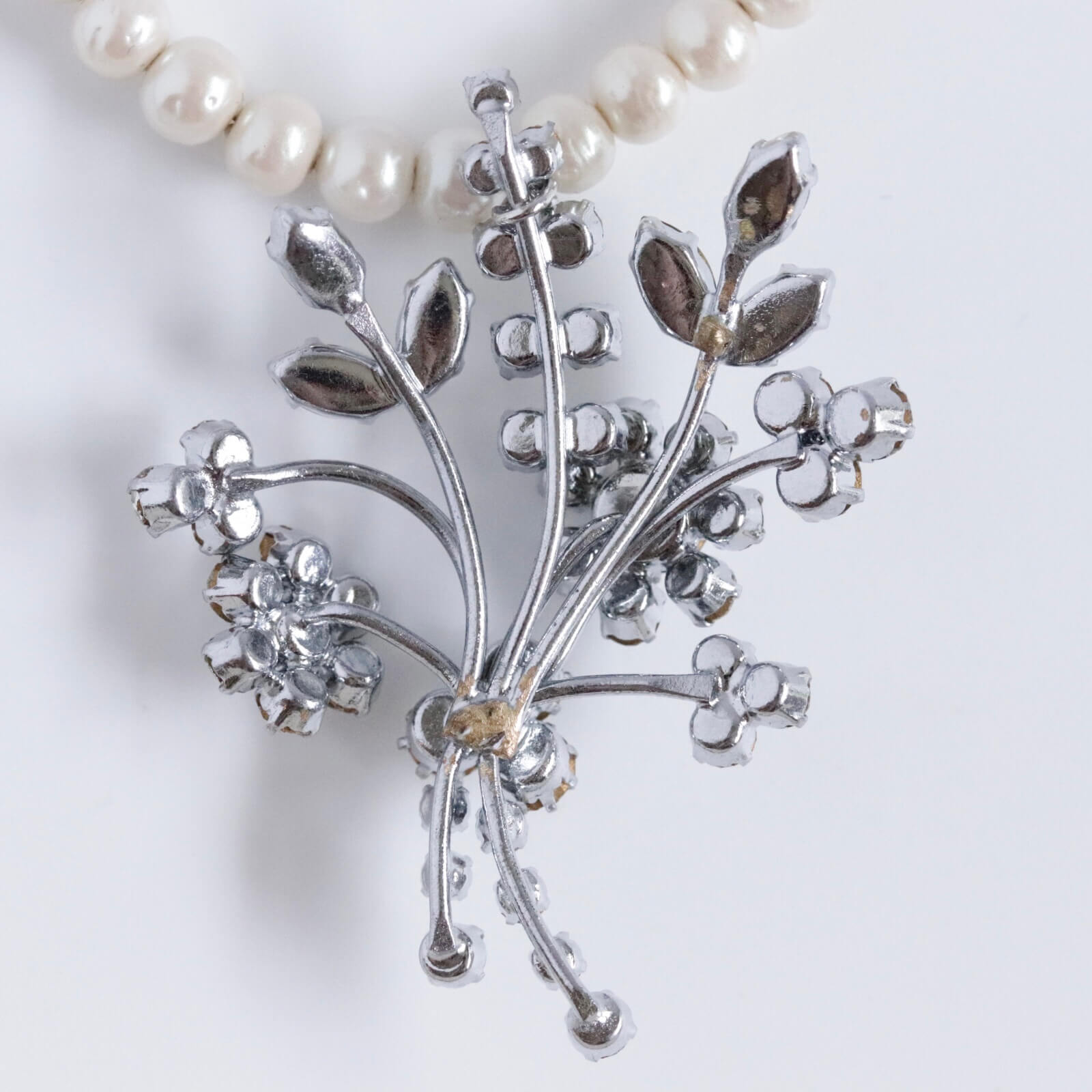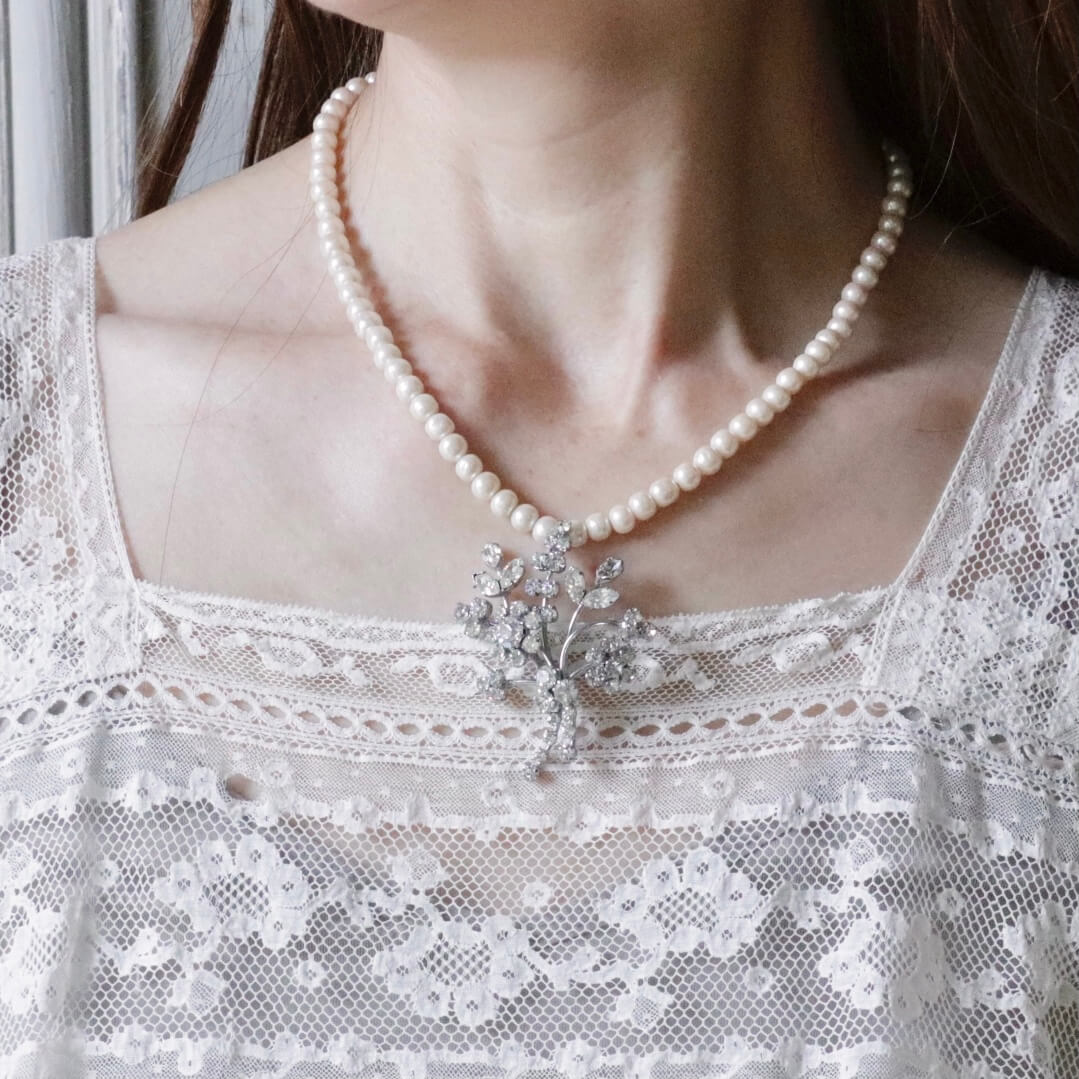 1950年代のブローチをチャームに仕立てたパールのネックレスです。
