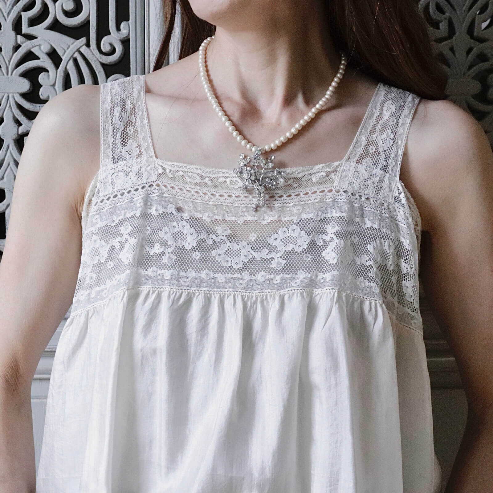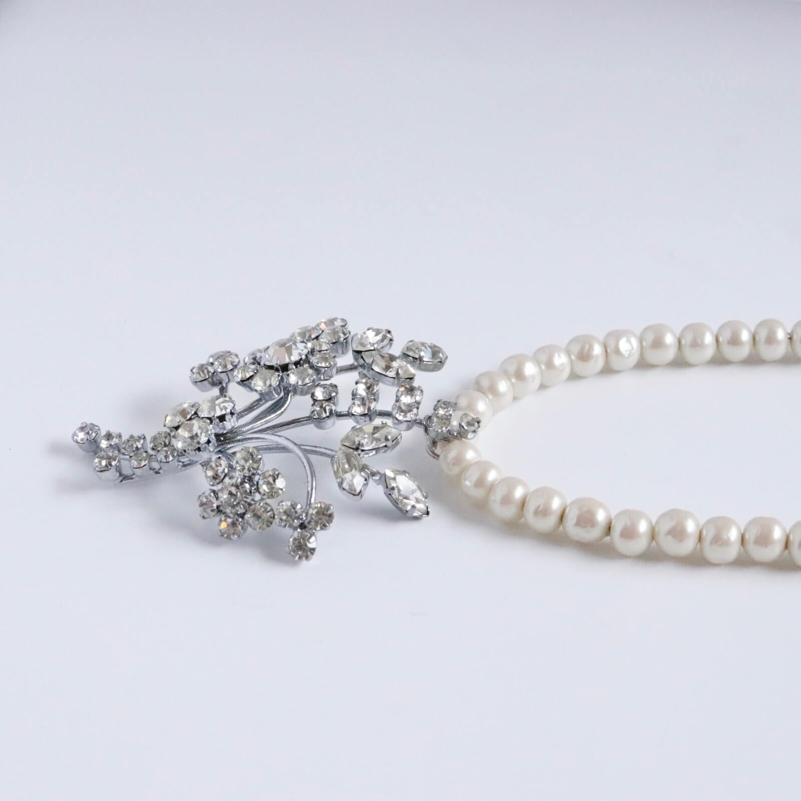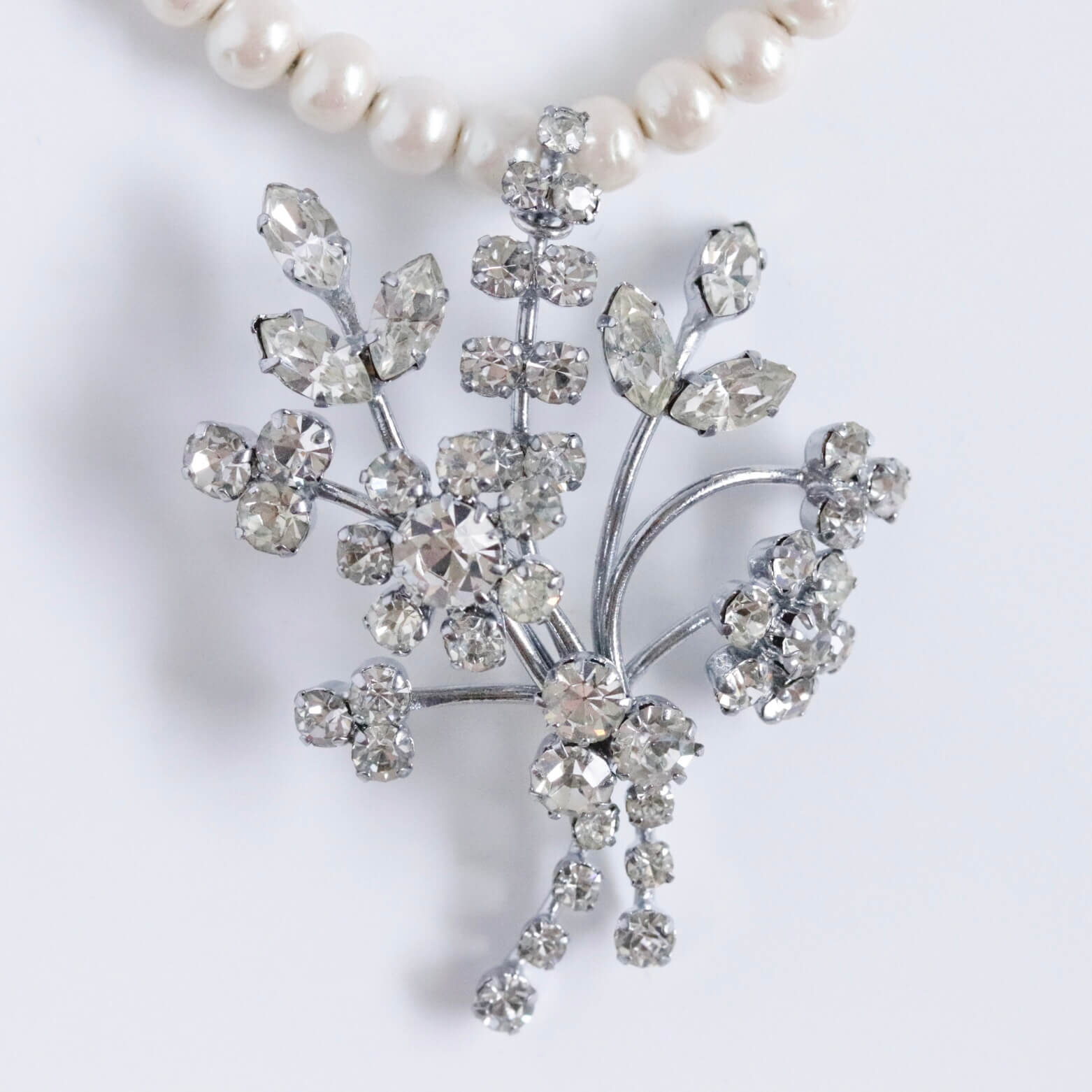 1950年代のブローチをチャームに仕立てたパールのネックレスです。