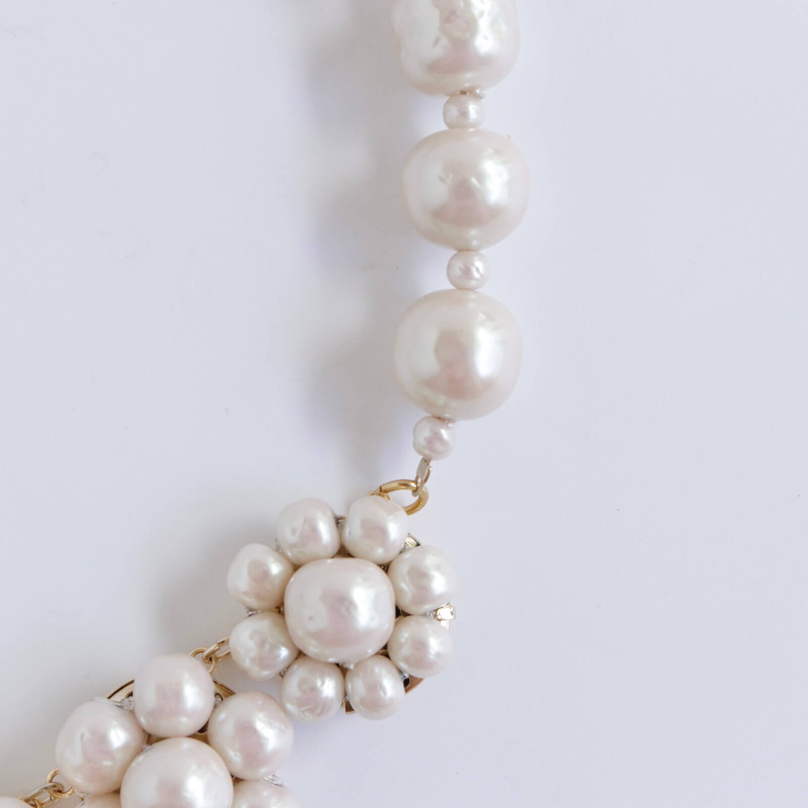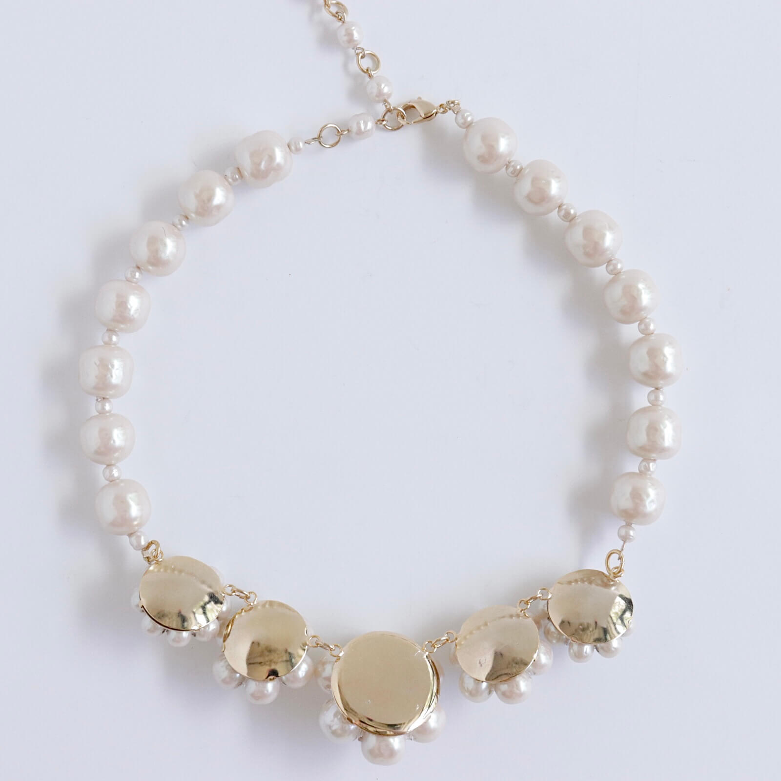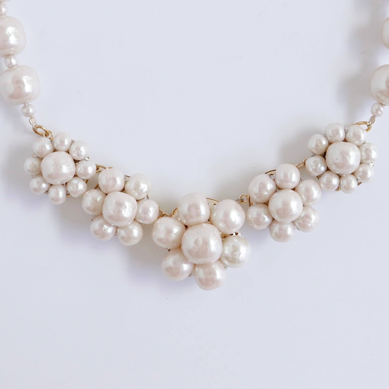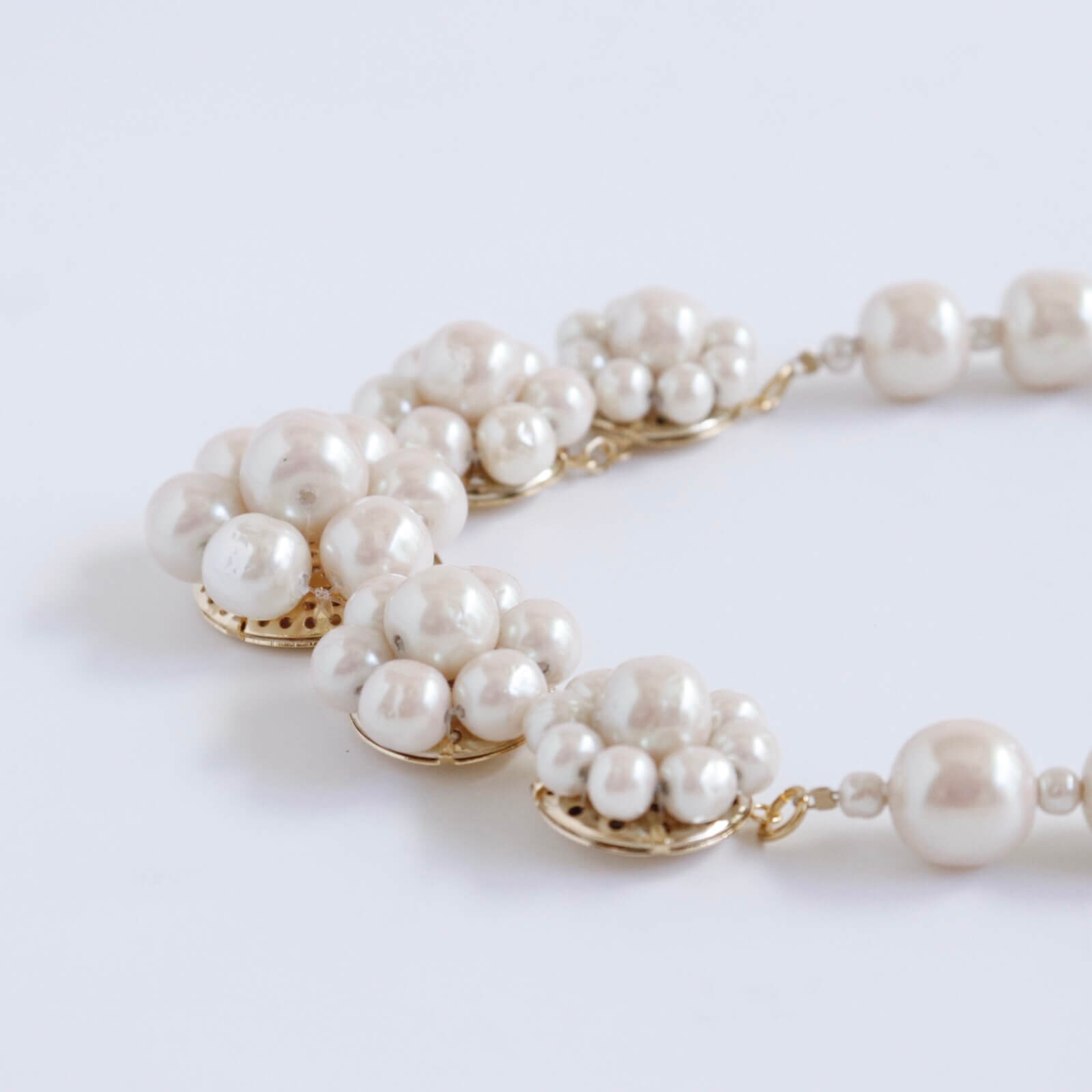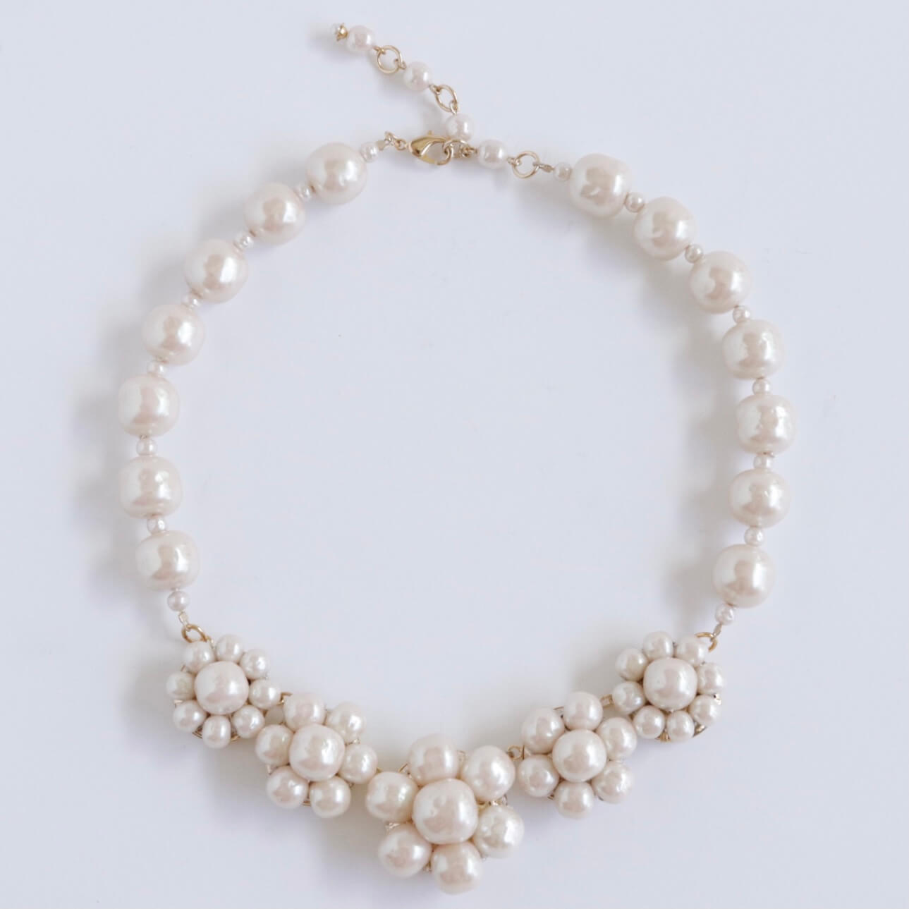 バロックパールで作ったデイジーを正面に5つグラデーションをつけて並べたデザインはおしゃれしたい日にぴったり。ネックレスを主役にスタイリングして見てください。