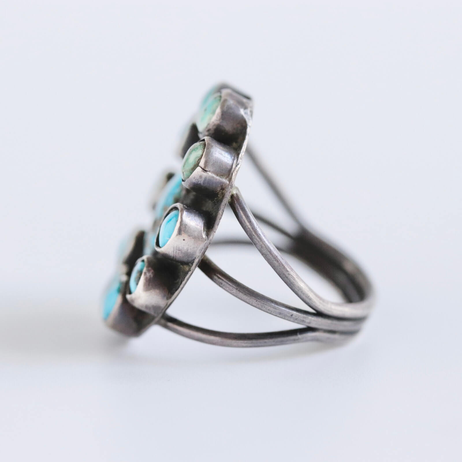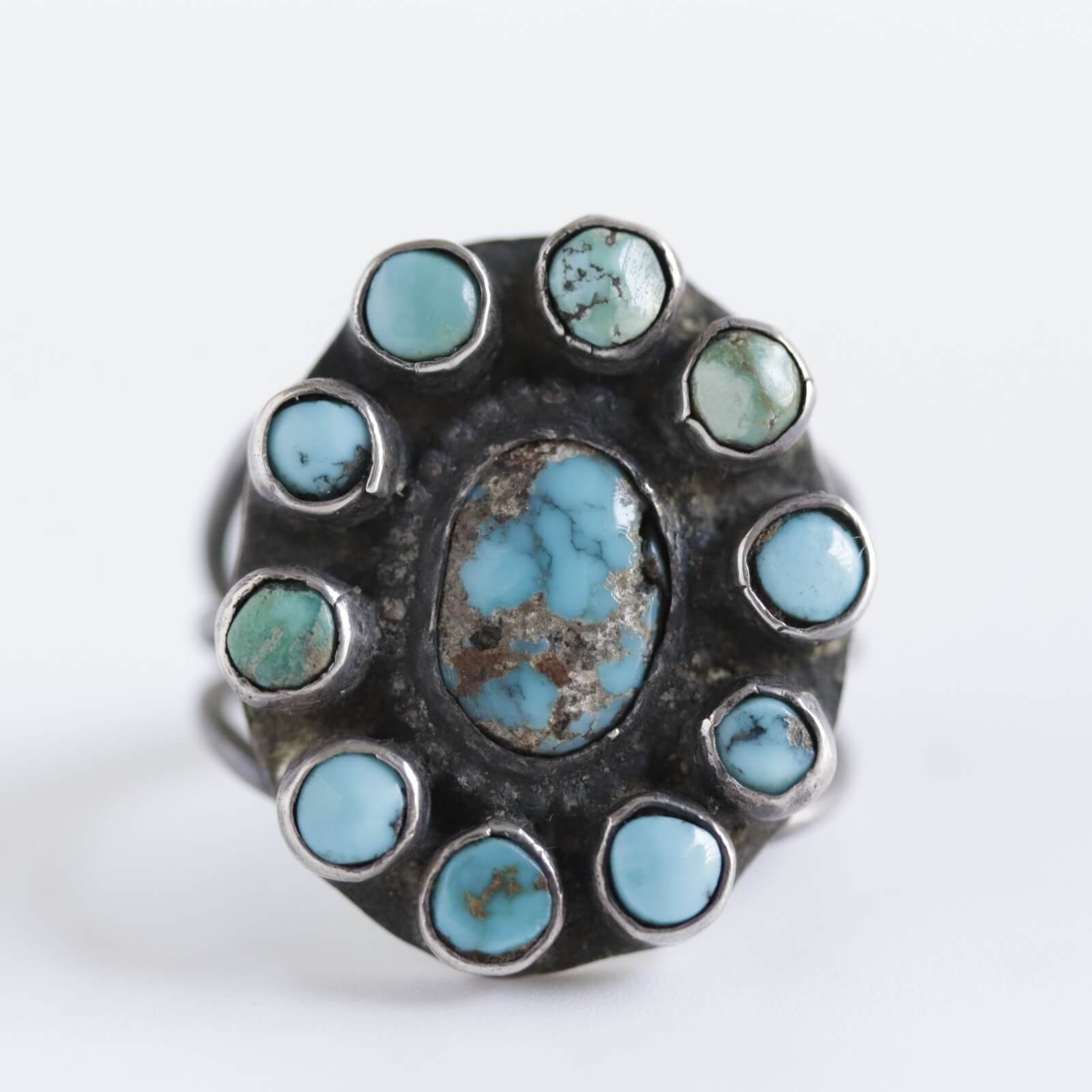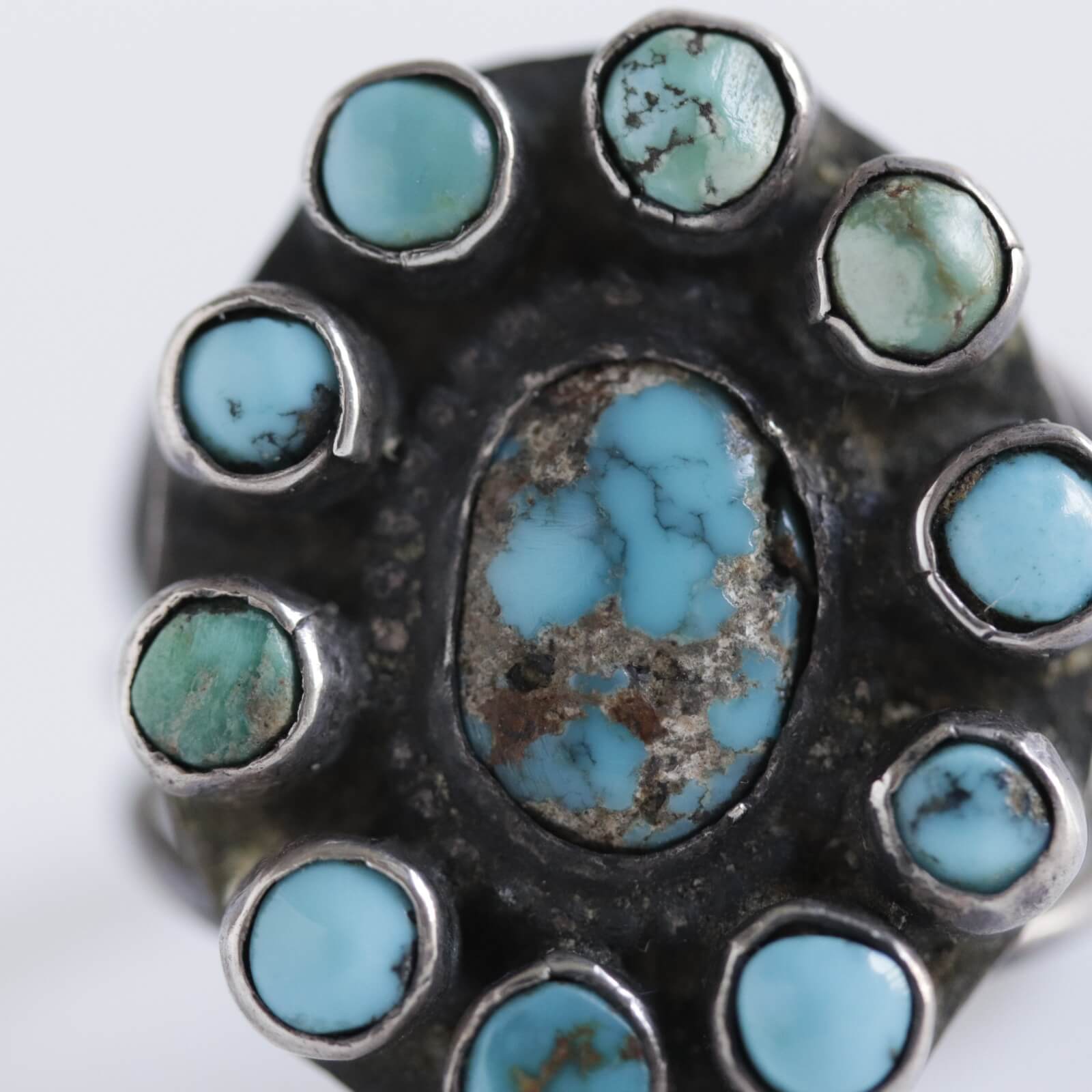 オーバルシェイプのターコイズの周りにラウンドシェイプののターコイズを並べ、お花のように見せているデザイン。