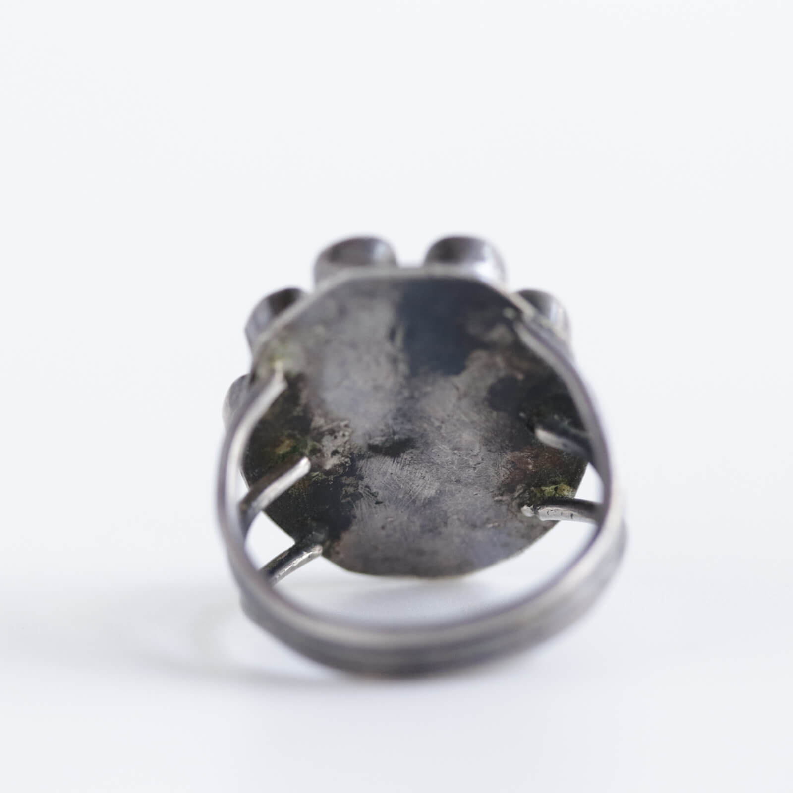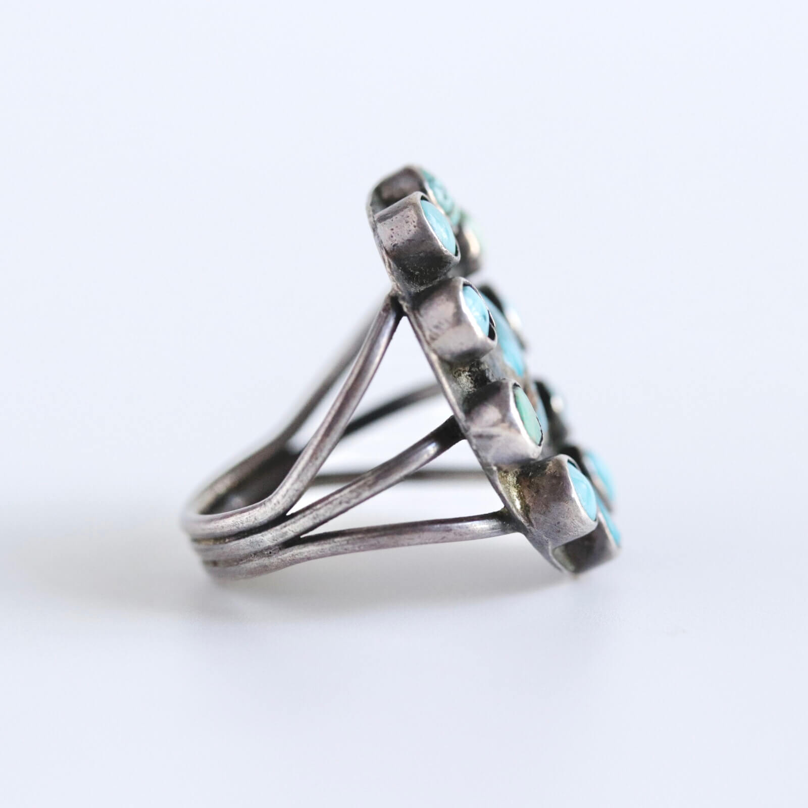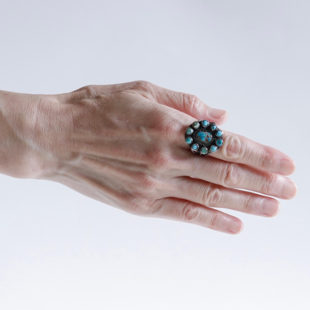 オーバルシェイプのターコイズの周りにラウンドシェイプののターコイズを並べ、お花のように見せているデザイン。