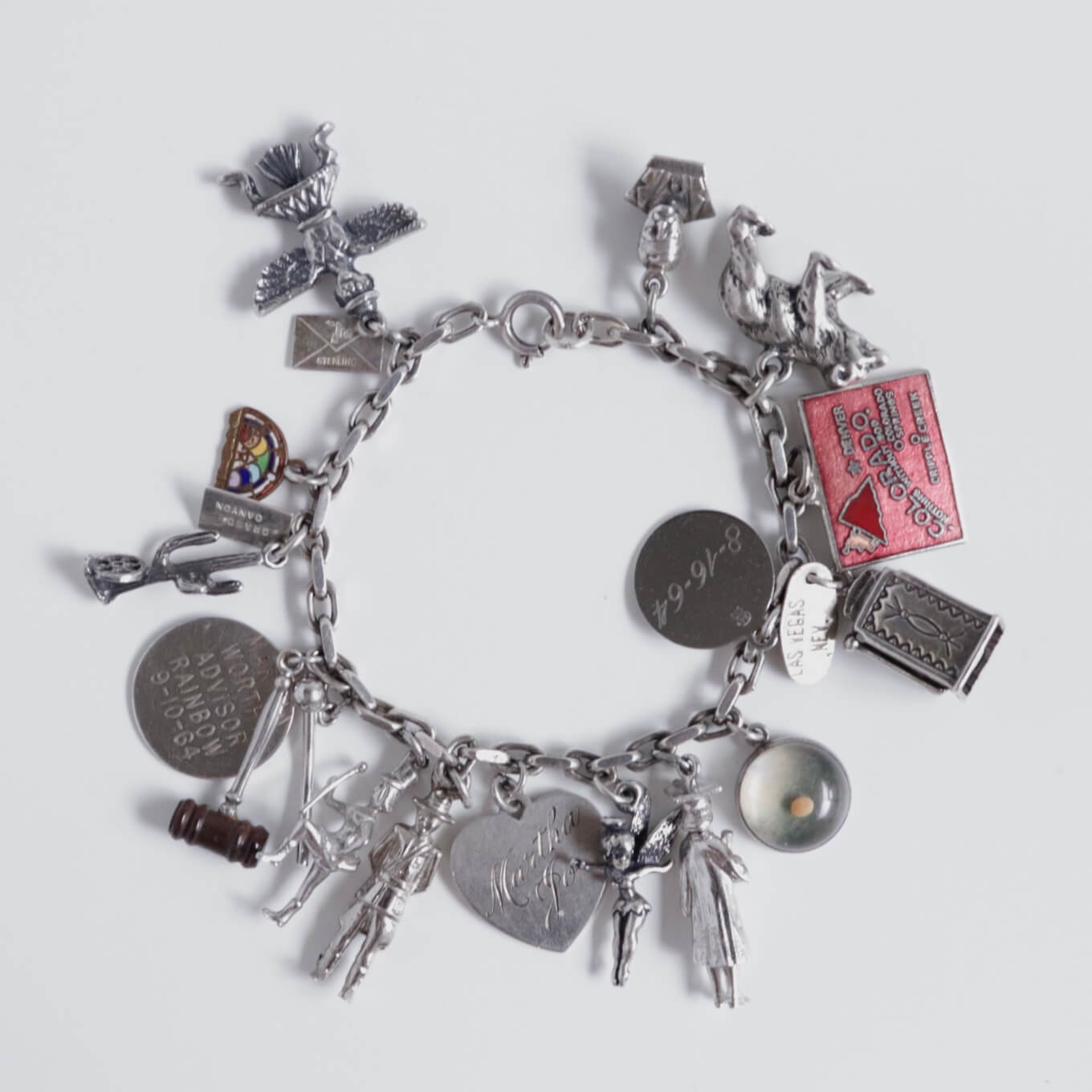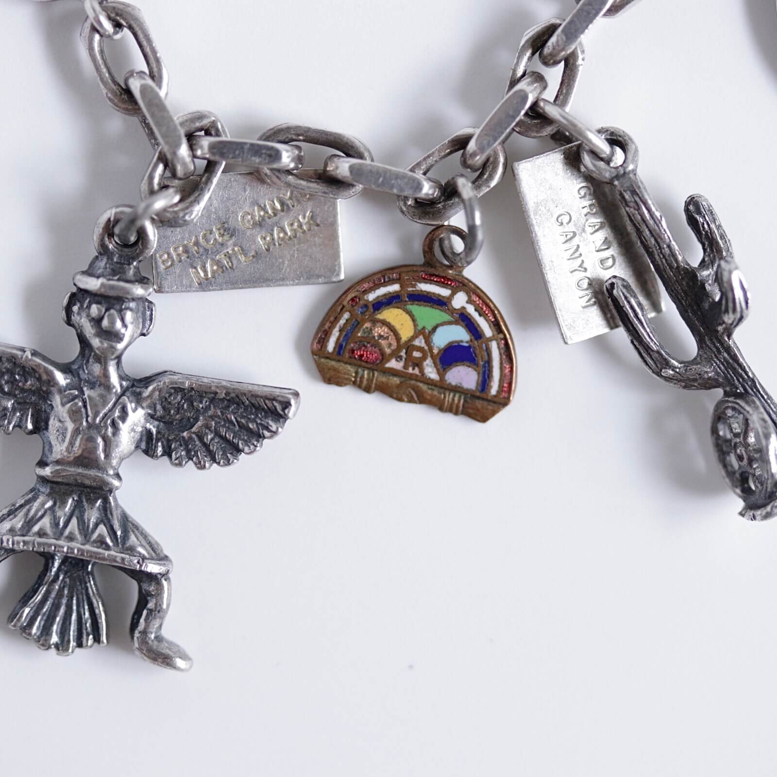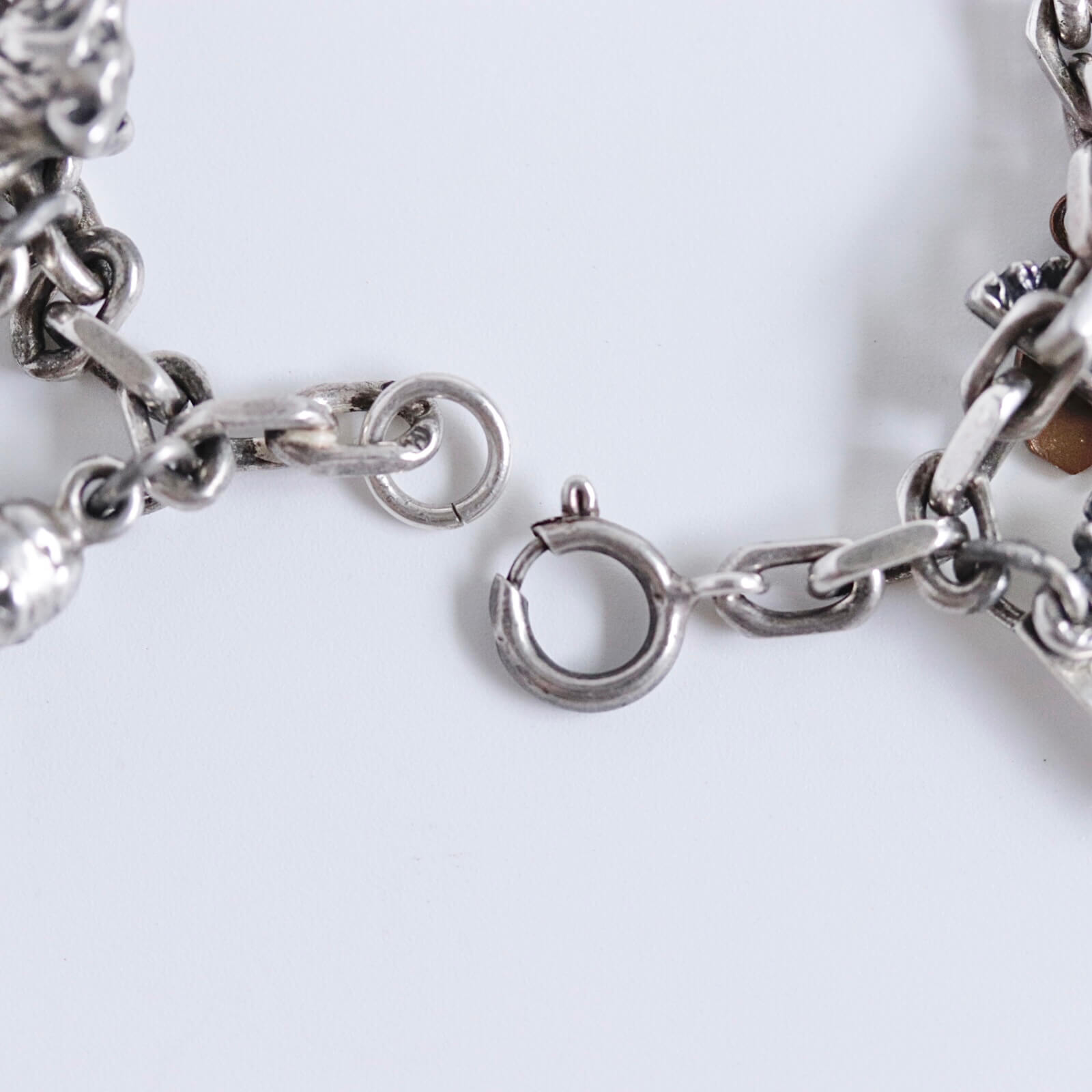 シルバーのチェーンにたくさんのチャームがついたヴィンテージのブレスレットです。