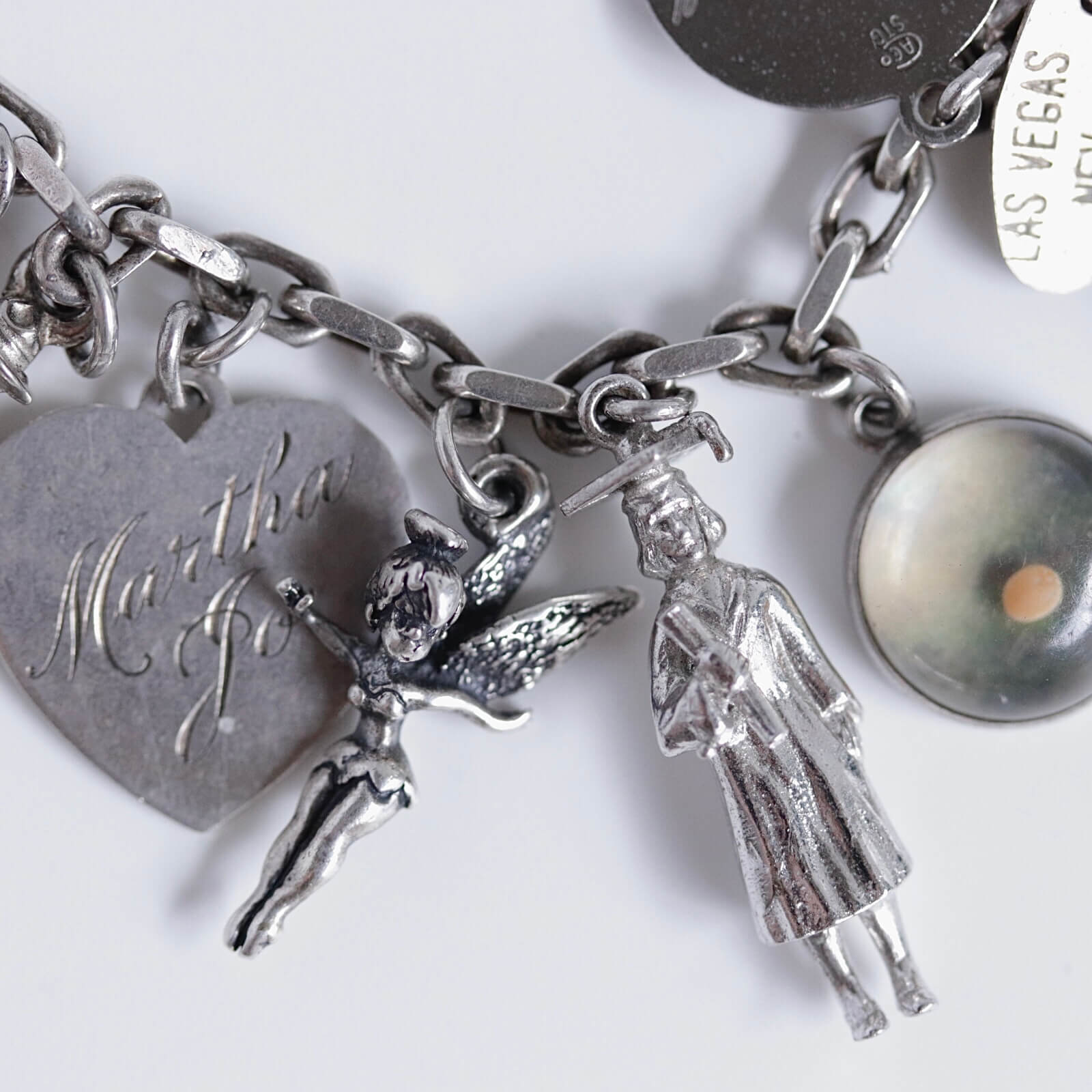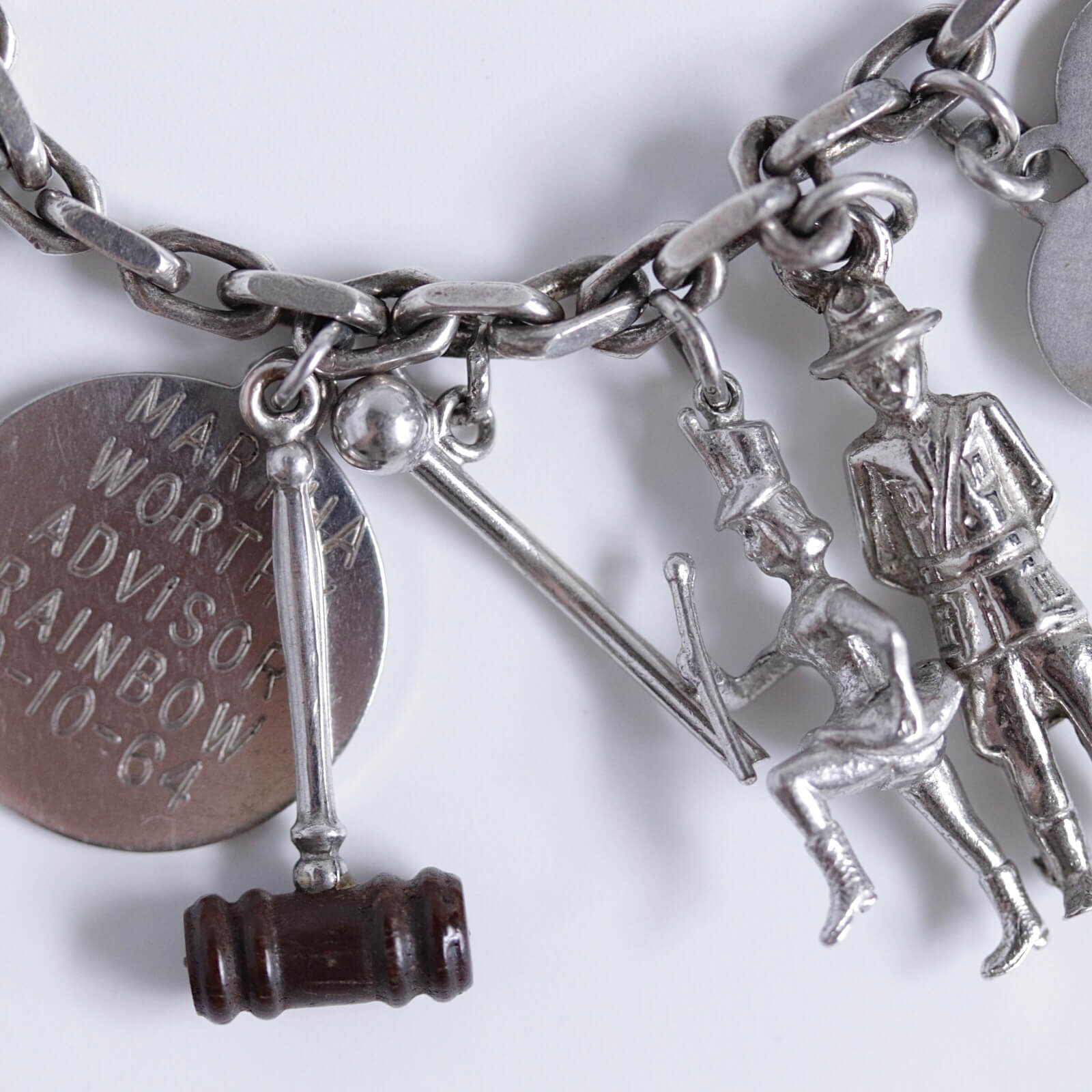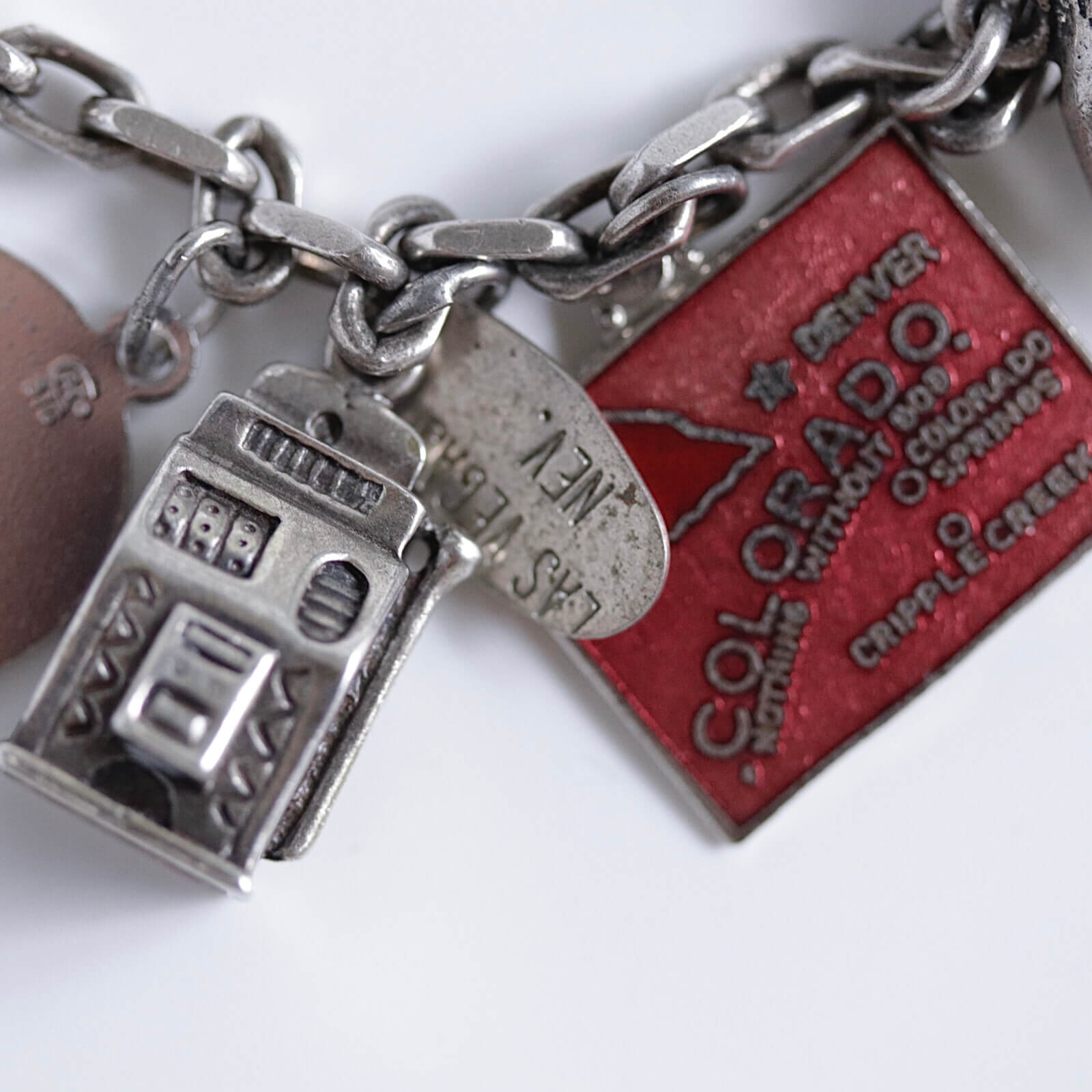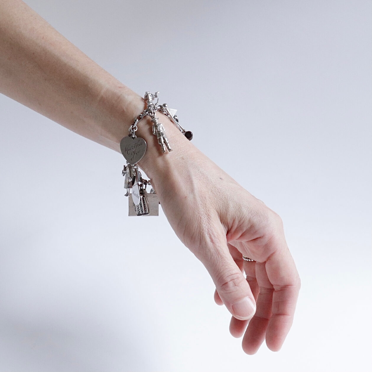 シルバーのチェーンにたくさんのチャームがついたヴィンテージのブレスレットです。