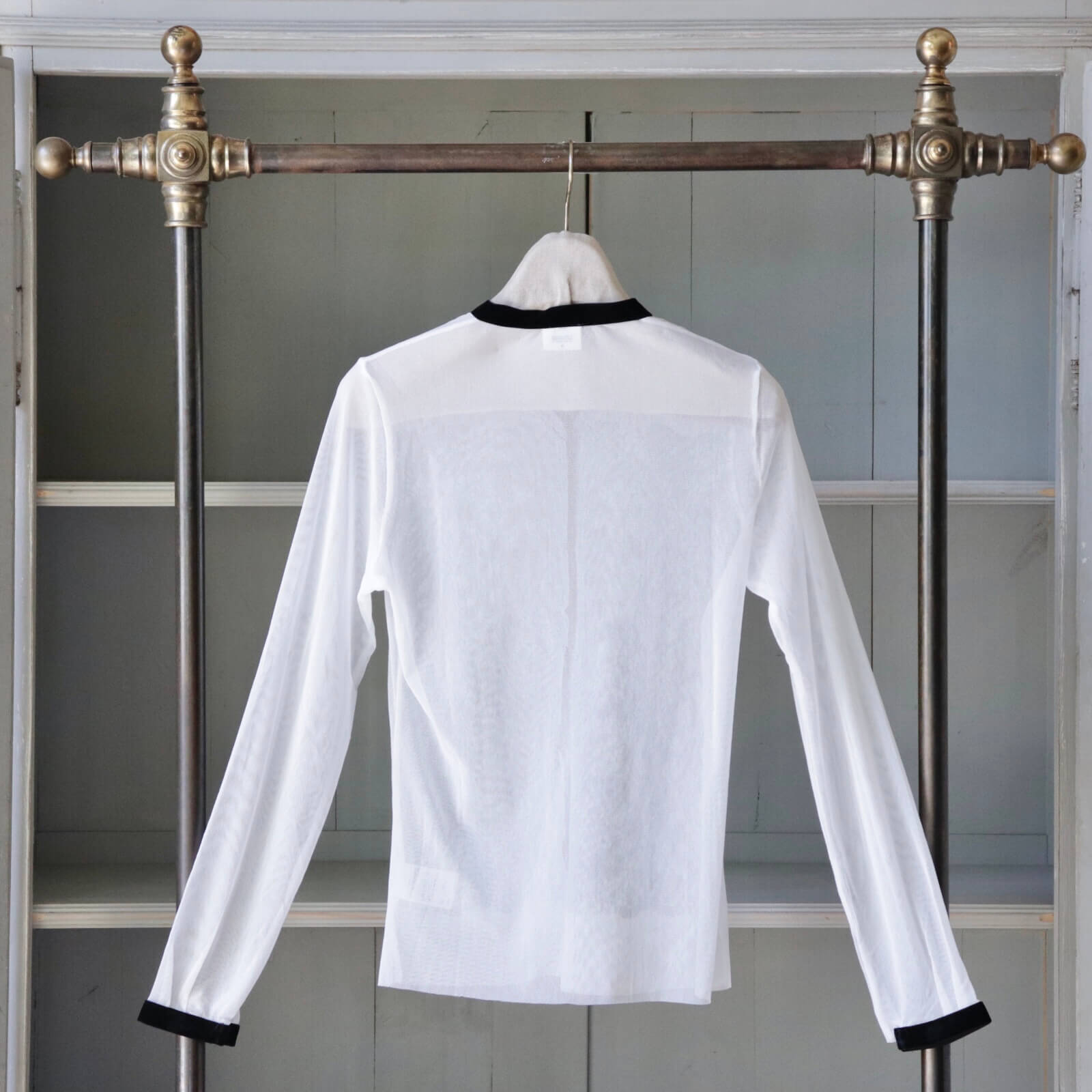 縁にはベルベットのリボンが添えられ、カジュアルなボトムスと合わせても上品な印象に仕上げてくれます。