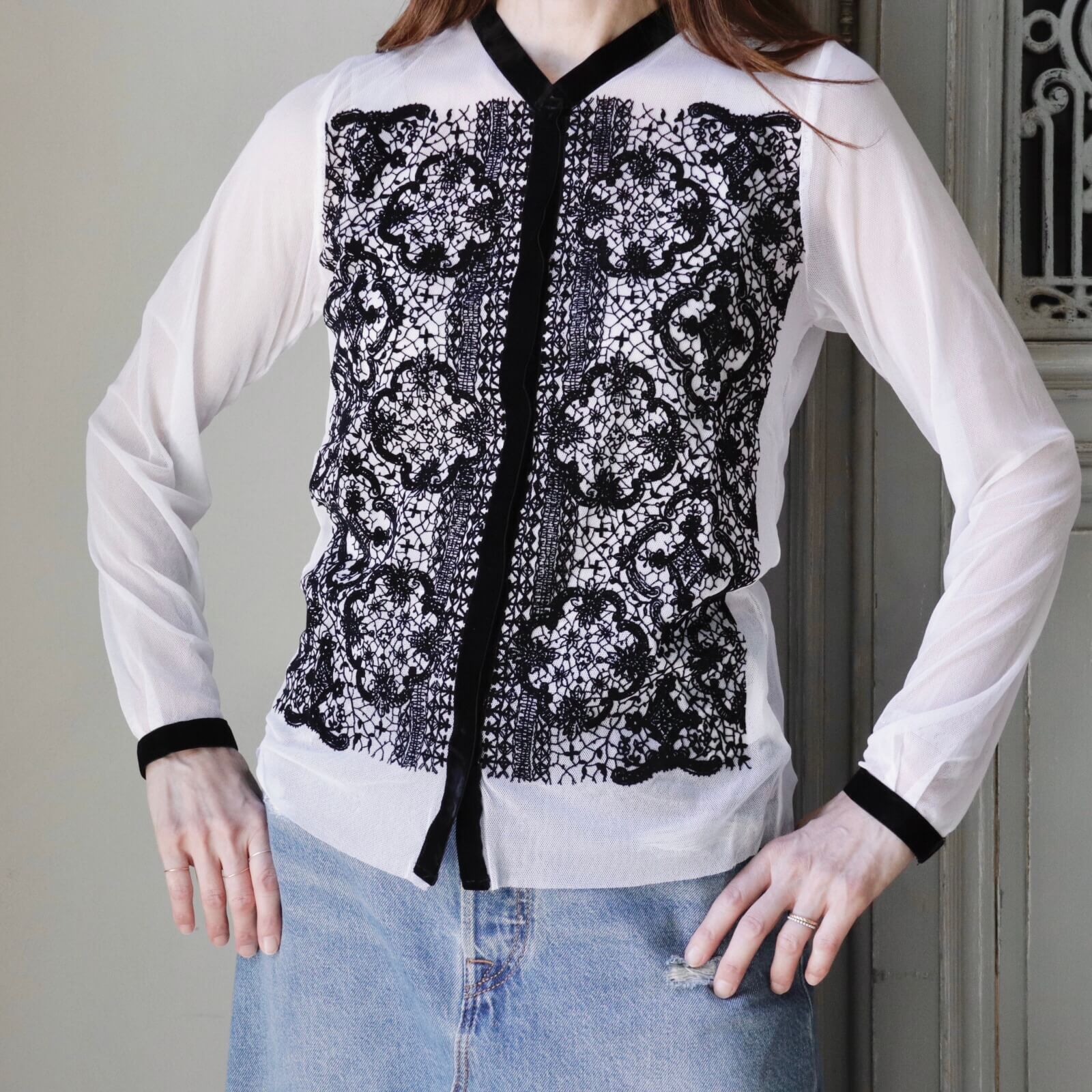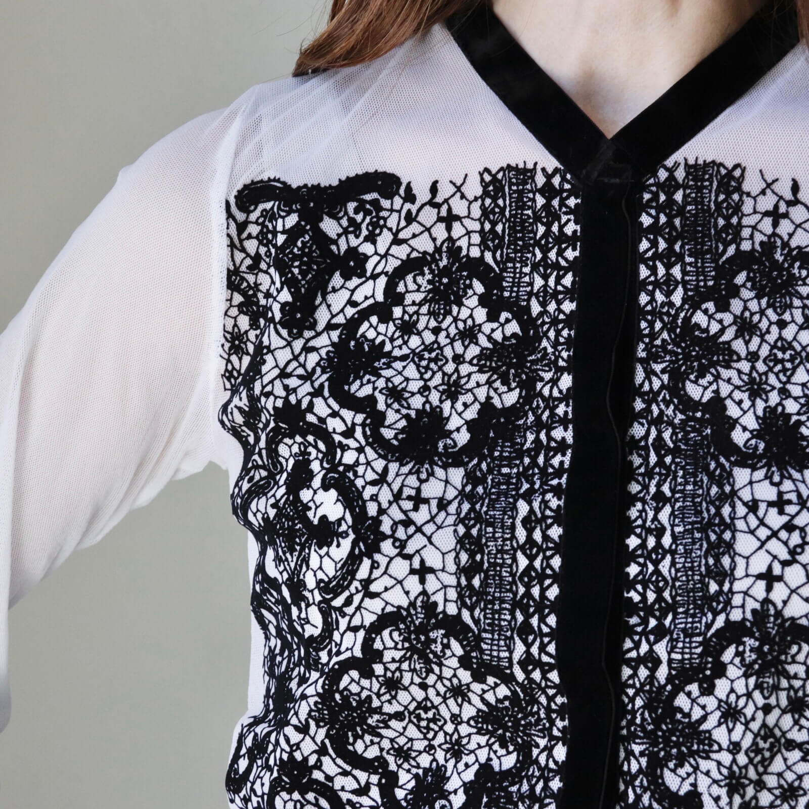 クラシカルなレース模様のデザインが印象的なフロッキープリントのカーディガン。