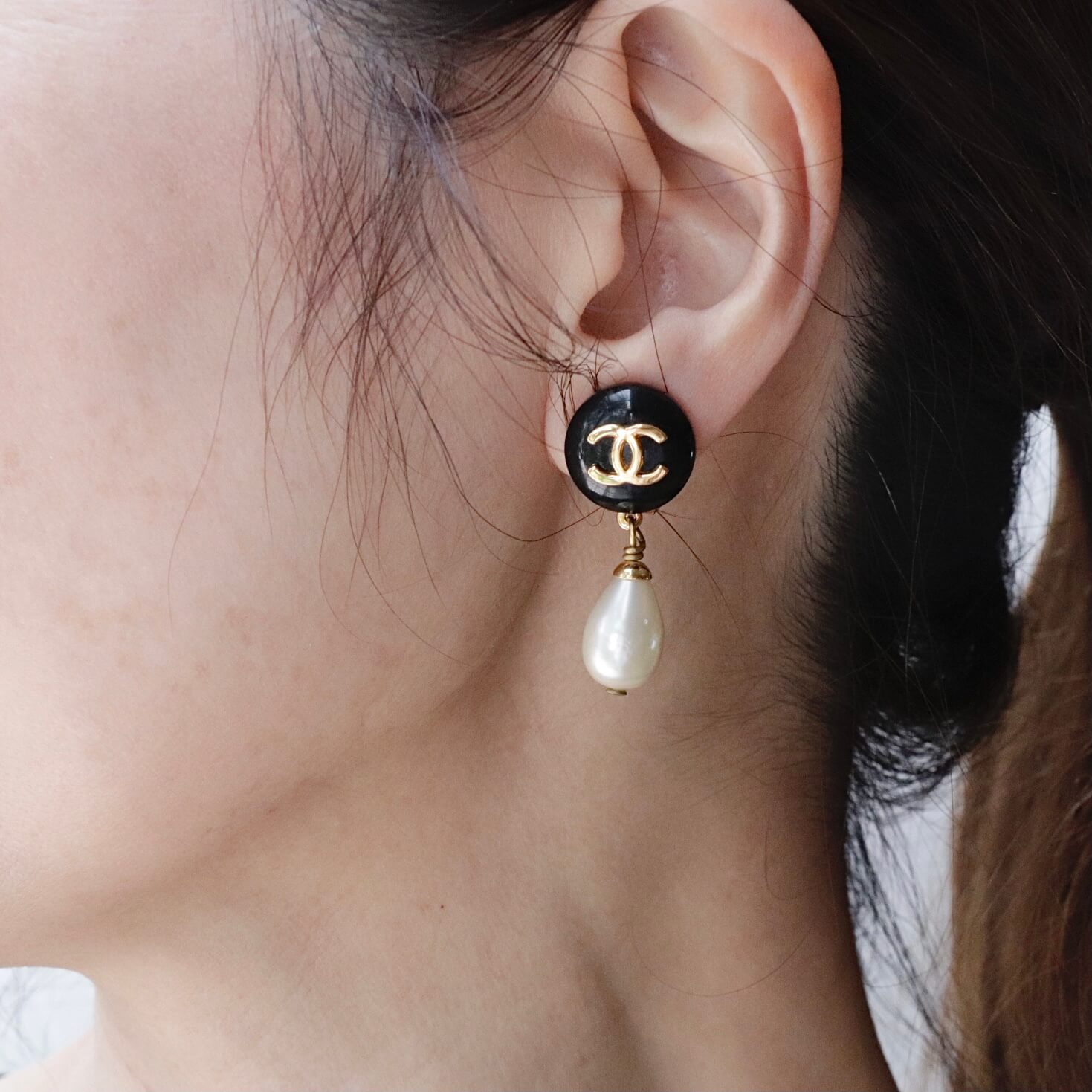 アイコニックな「ココマーク」を載せたドーム状のパーツにバロックタイプの雫型のパールが下がっています。