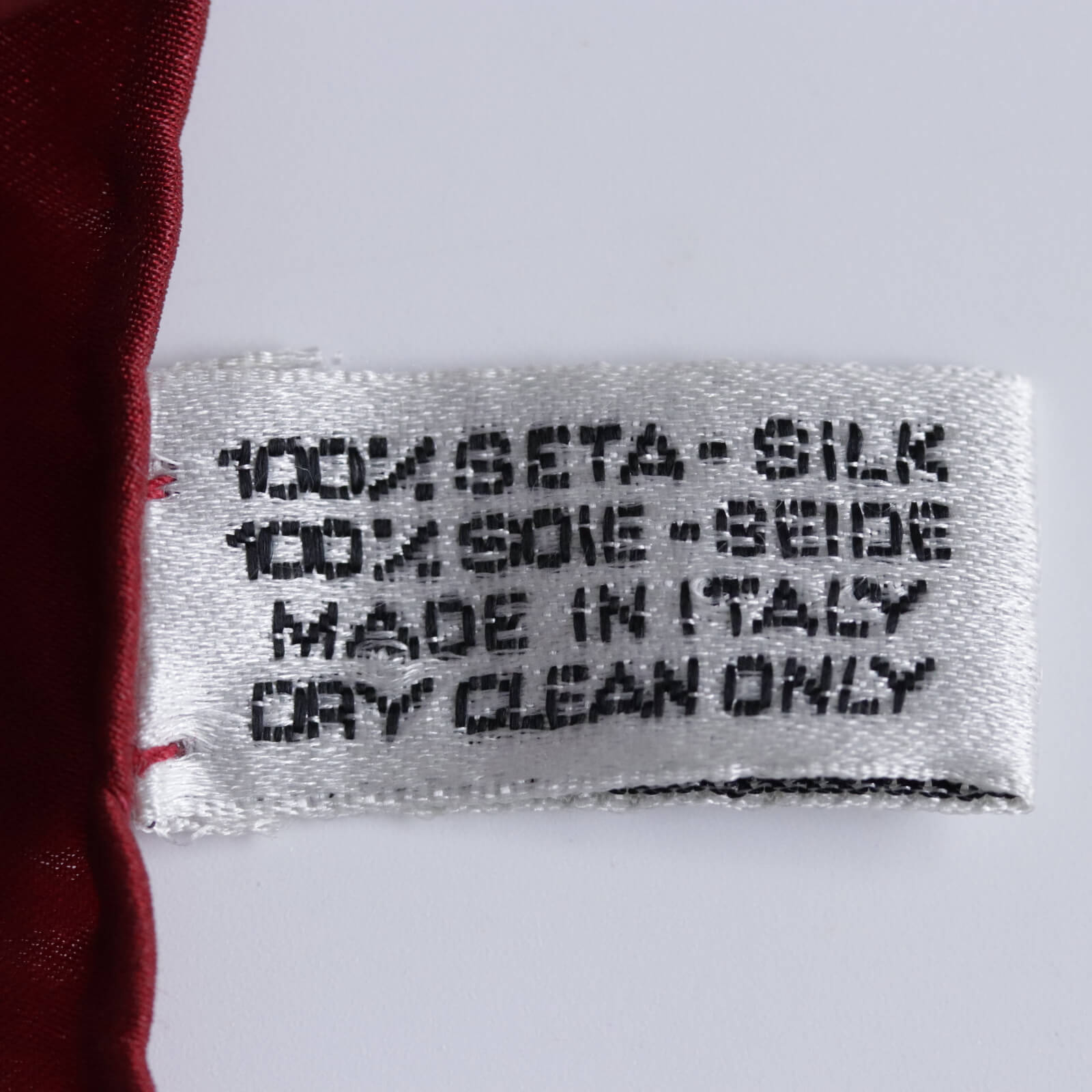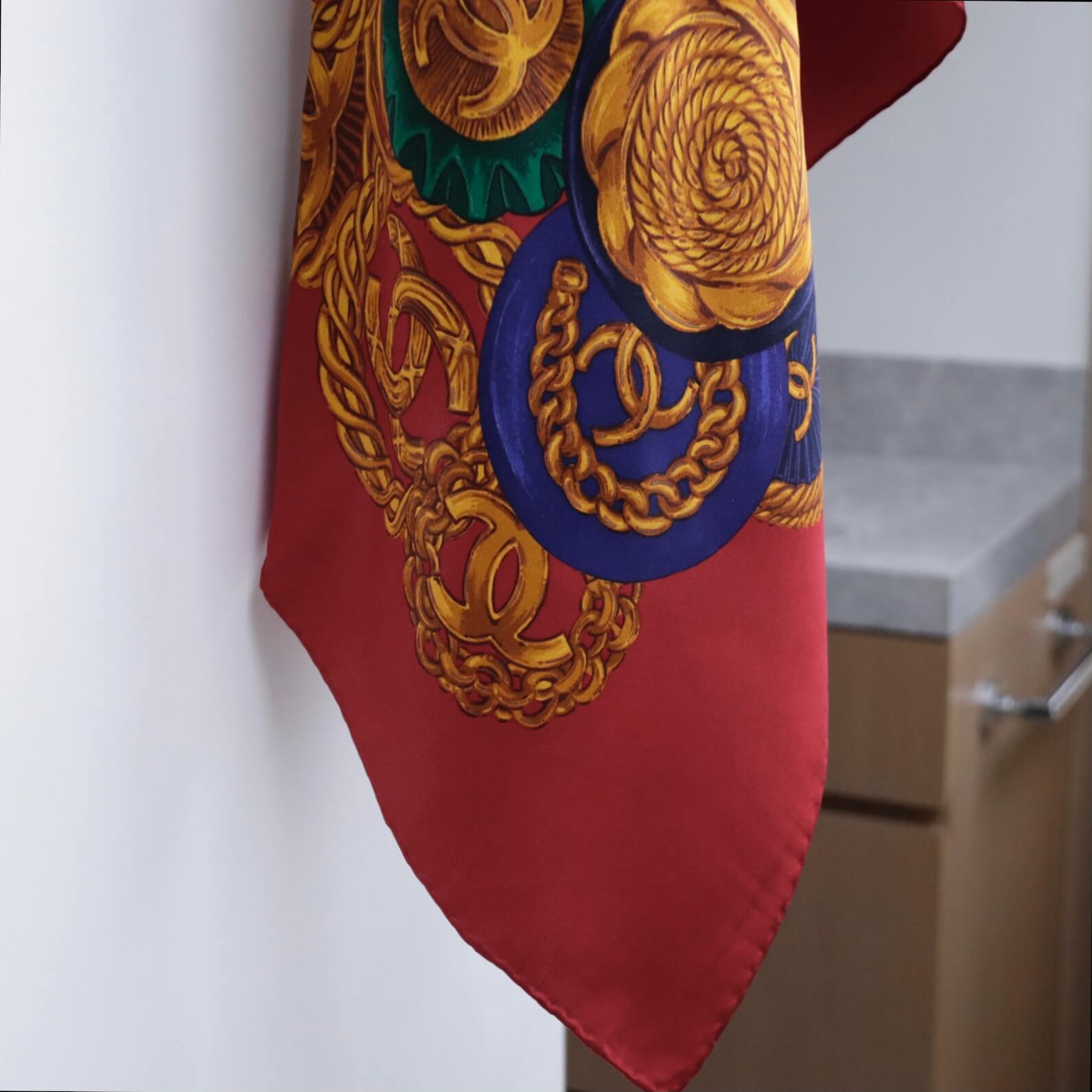 ベースの落ち着いた赤がゴールドのプリントとマッチして、シャネルのエレガンスを感じさせます。