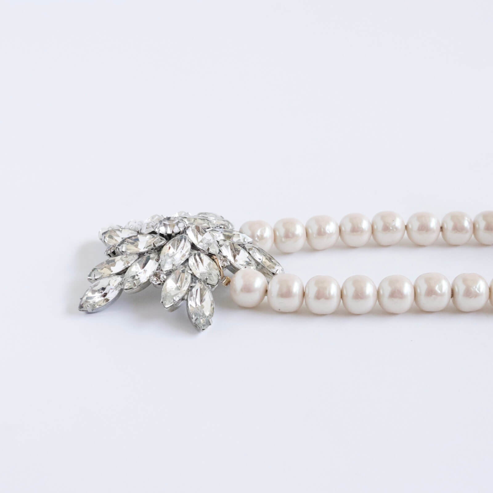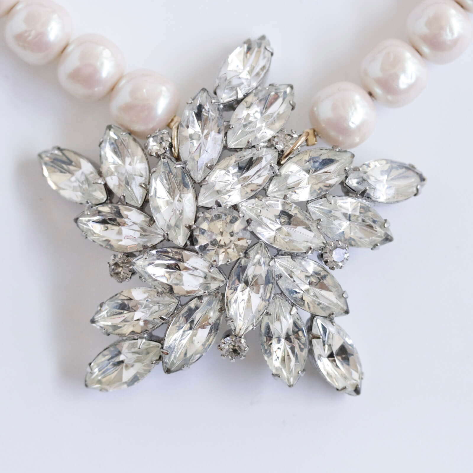ガラスで出来た10ミリのバロックパールのネックレスの中央には、ヴィンテージのブローチをリメイクしてセットしました。