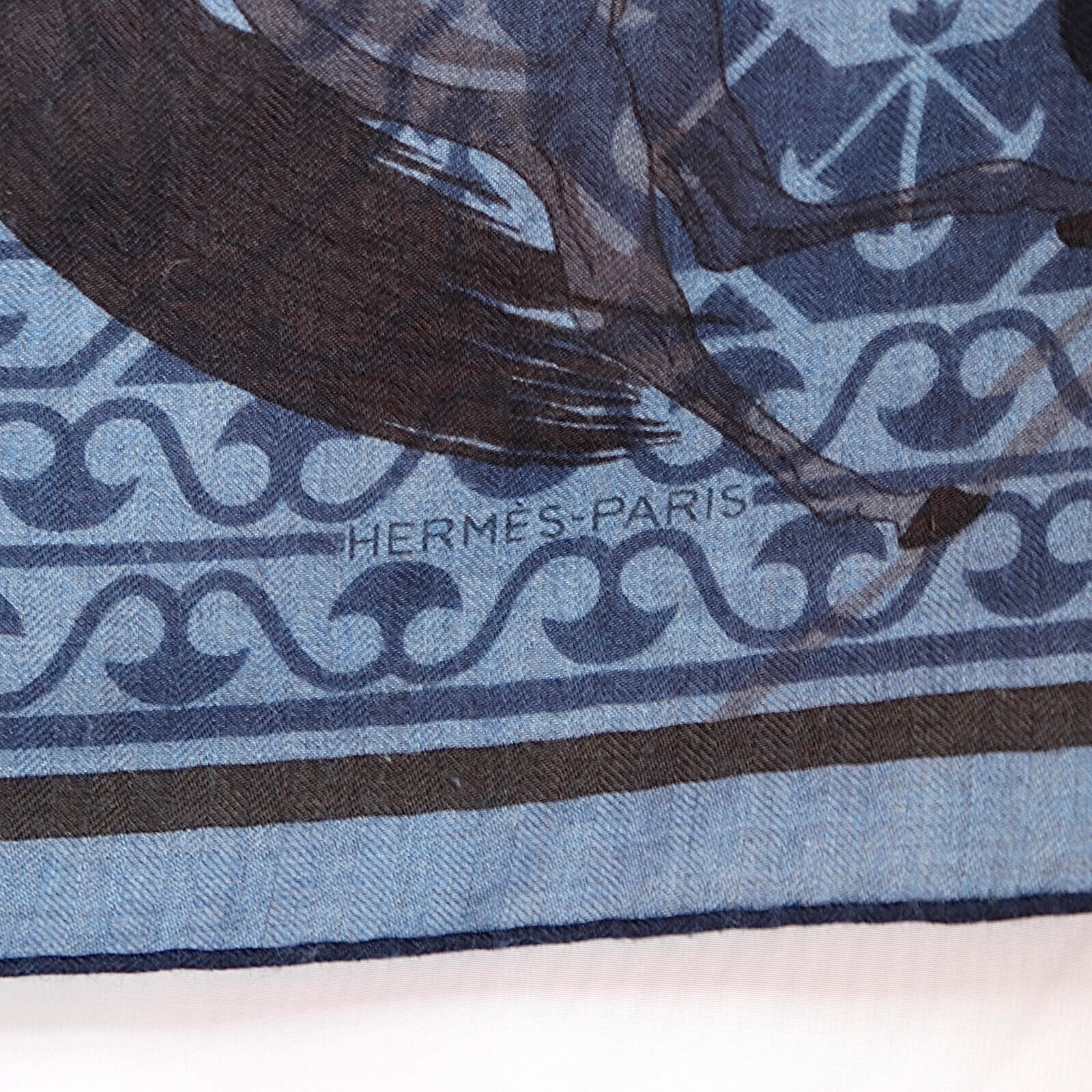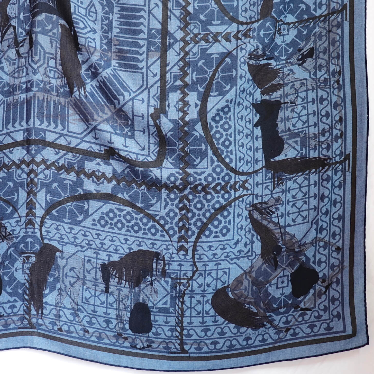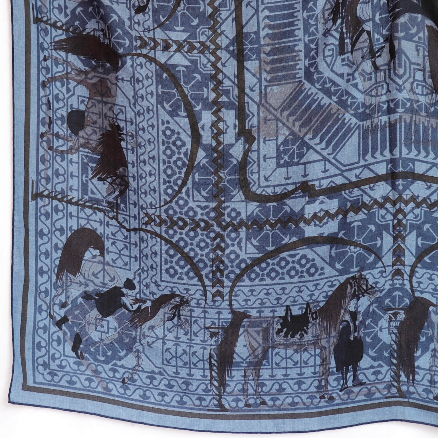 サハラ砂漠を中心とした砂漠に住む遊牧民族のベトウィン族とアラブ種の馬を描いた美しいデザインはエルメスの中でも大変人気で何度も再販されたようです。幾何学模様と合わせることでクラッシックな図案がモダンに昇華され、エルメスらしいエレガンスが見てとれます。