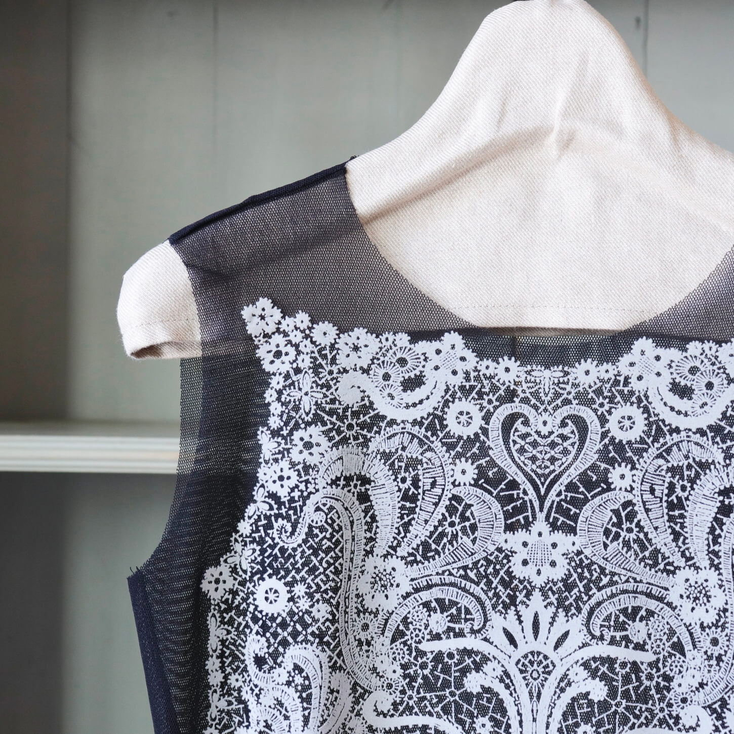 クラシカルなレース模様のデザインが印象的なフロッキープリントのキャミソール。