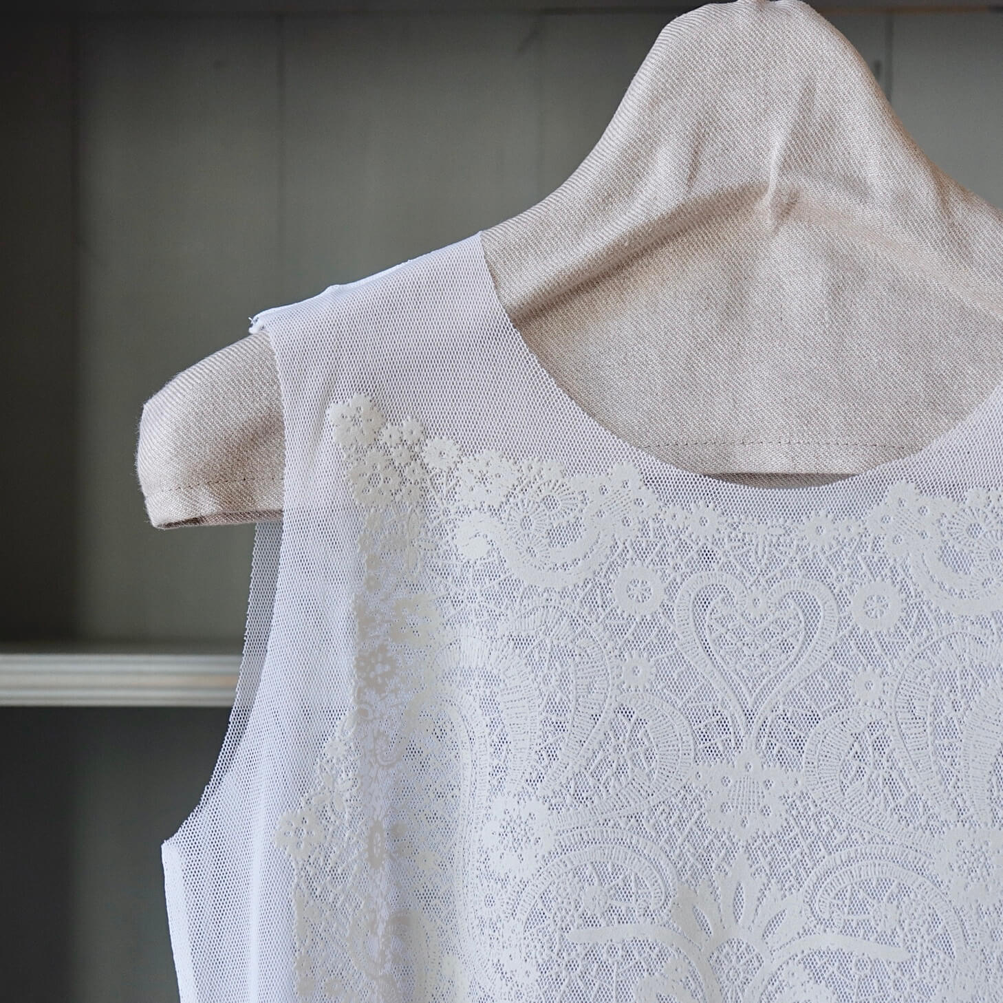 クラシカルなレース模様のデザインが印象的なフロッキープリントのキャミソール。