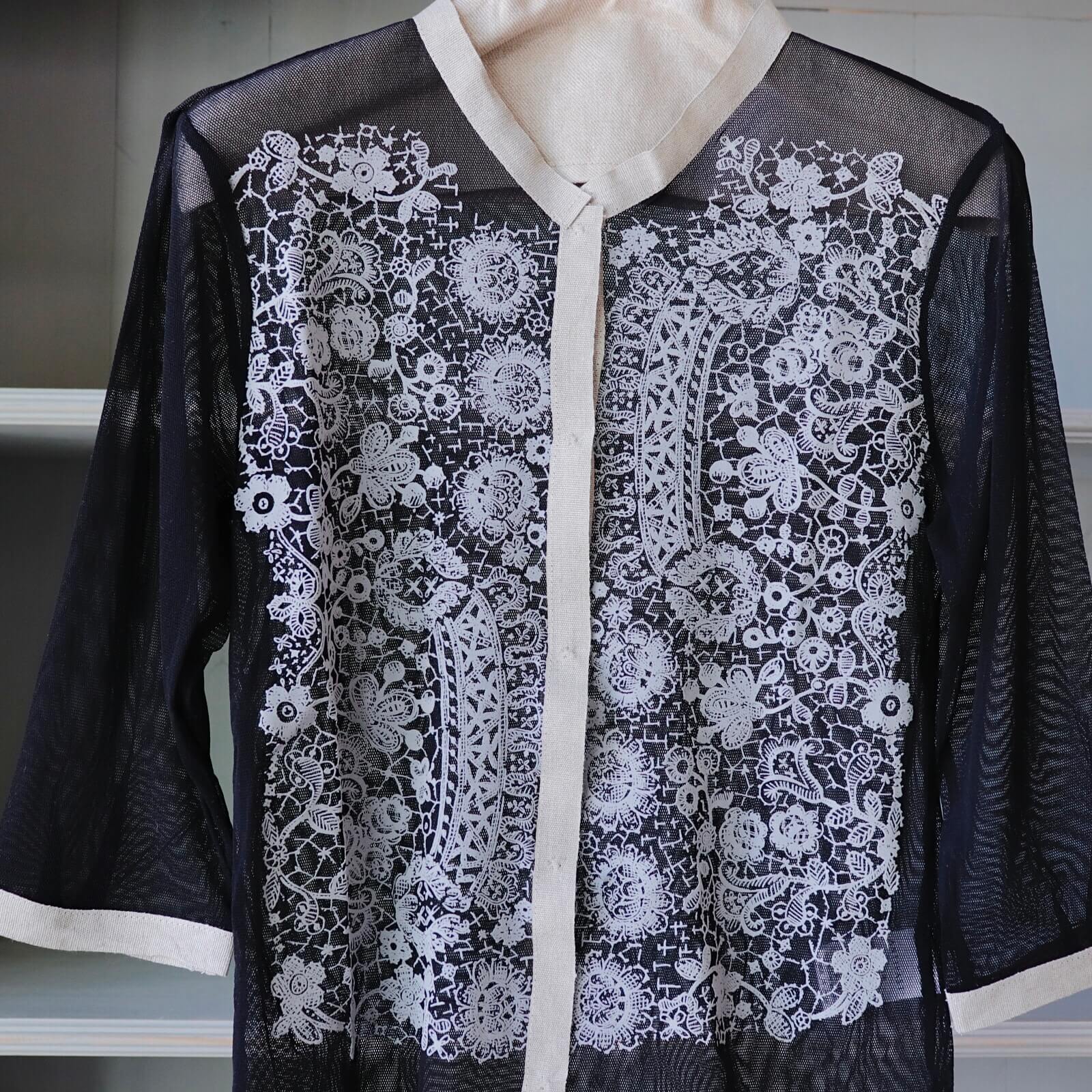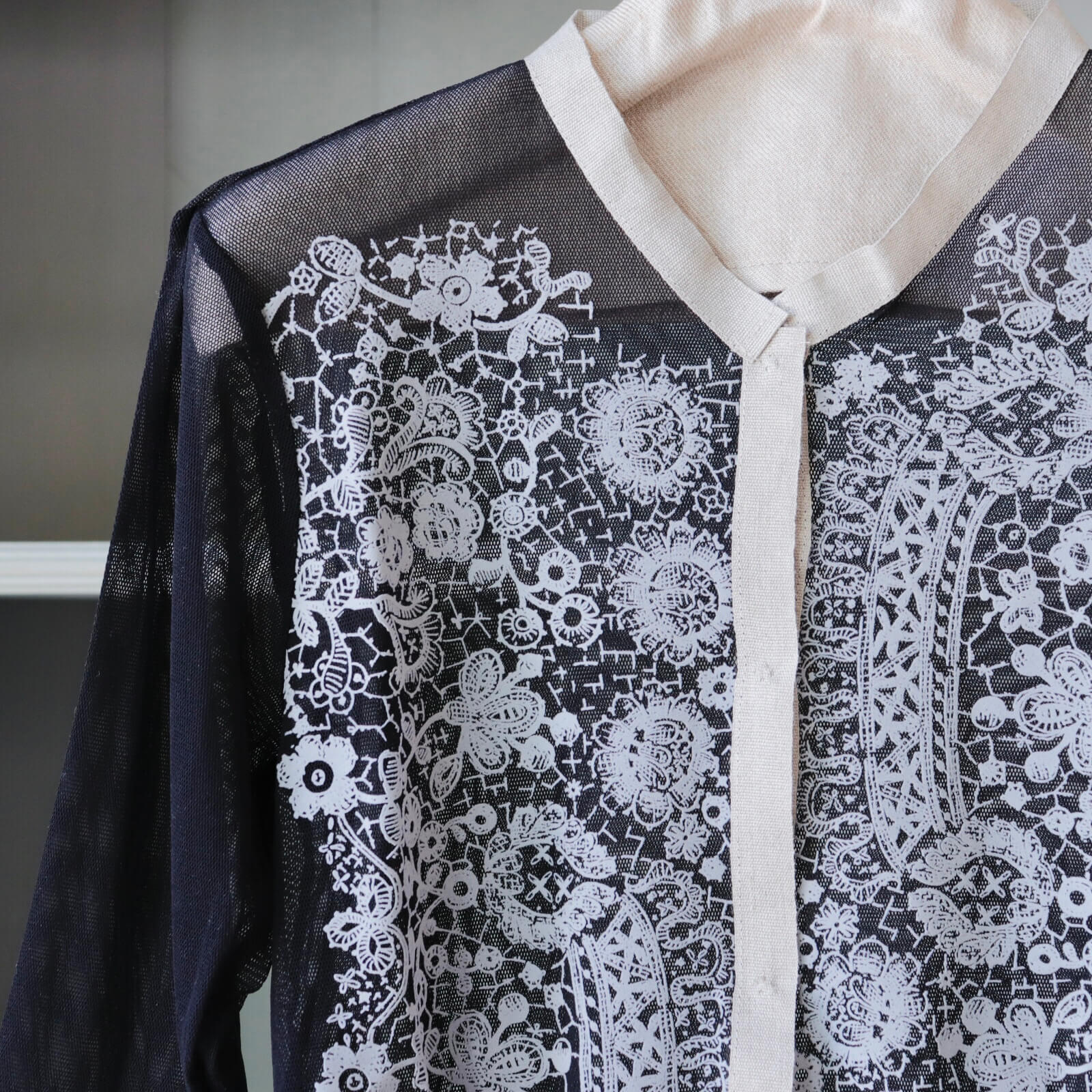 メッシュ生地にレース柄が浮き出るよう、わずかな凹凸感が出るフロック加工が施されており、普通のプリントでは出せない質感がなんとも魅力的な一枚です。