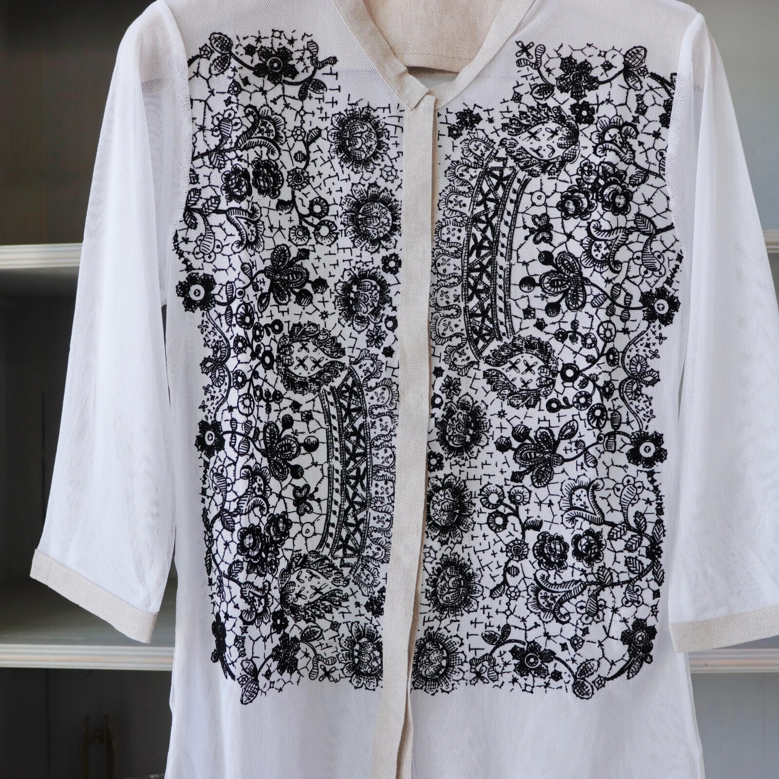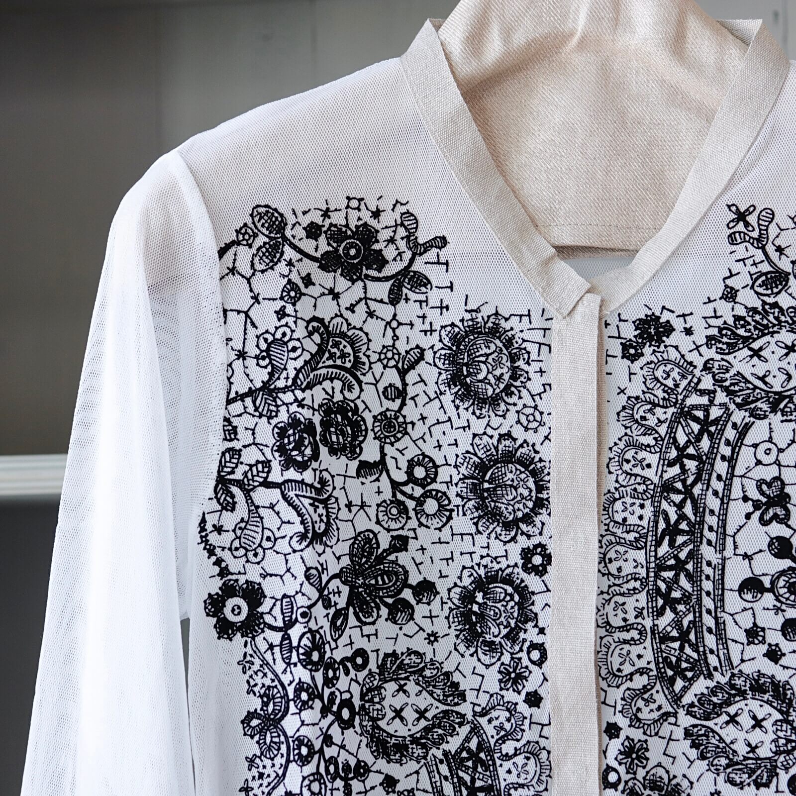 メッシュ生地にレース柄が浮き出るよう、わずかな凹凸感が出るフロック加工が施されており、普通のプリントでは出せない質感がなんとも魅力的な一枚です。