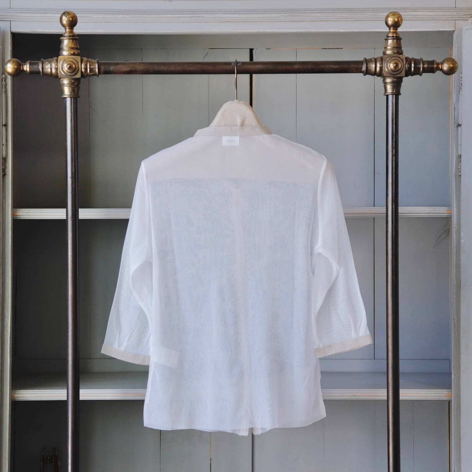 縁にはリネンのリボンが添えられ、カジュアルなボトムスと合わせても上品な印象に仕上げてくれます。