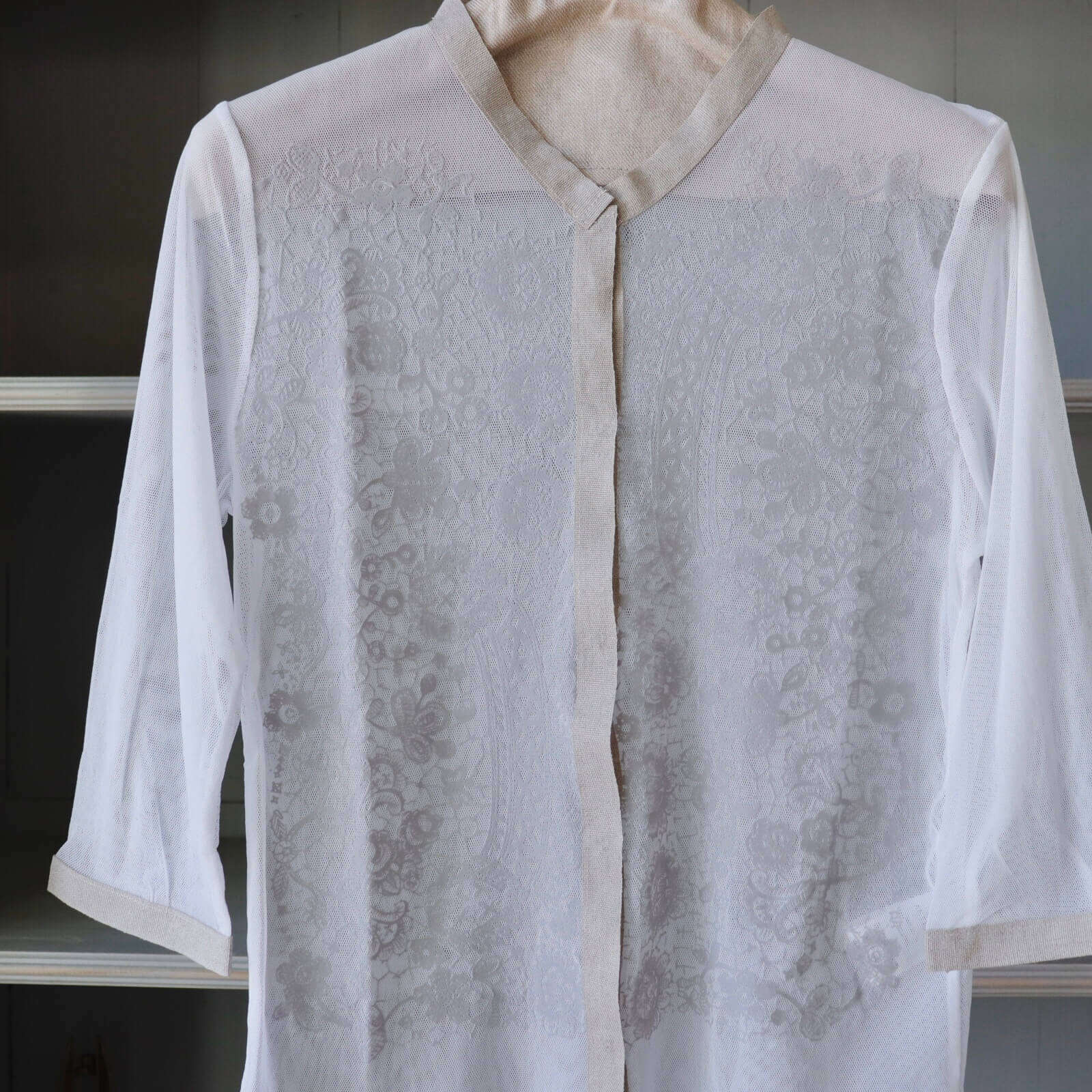 メッシュ生地にレース柄が浮き出るよう、わずかな凹凸感が出るフロック加工が施されており、普通のプリントでは出せない質感がなんとも魅力的な一枚です。