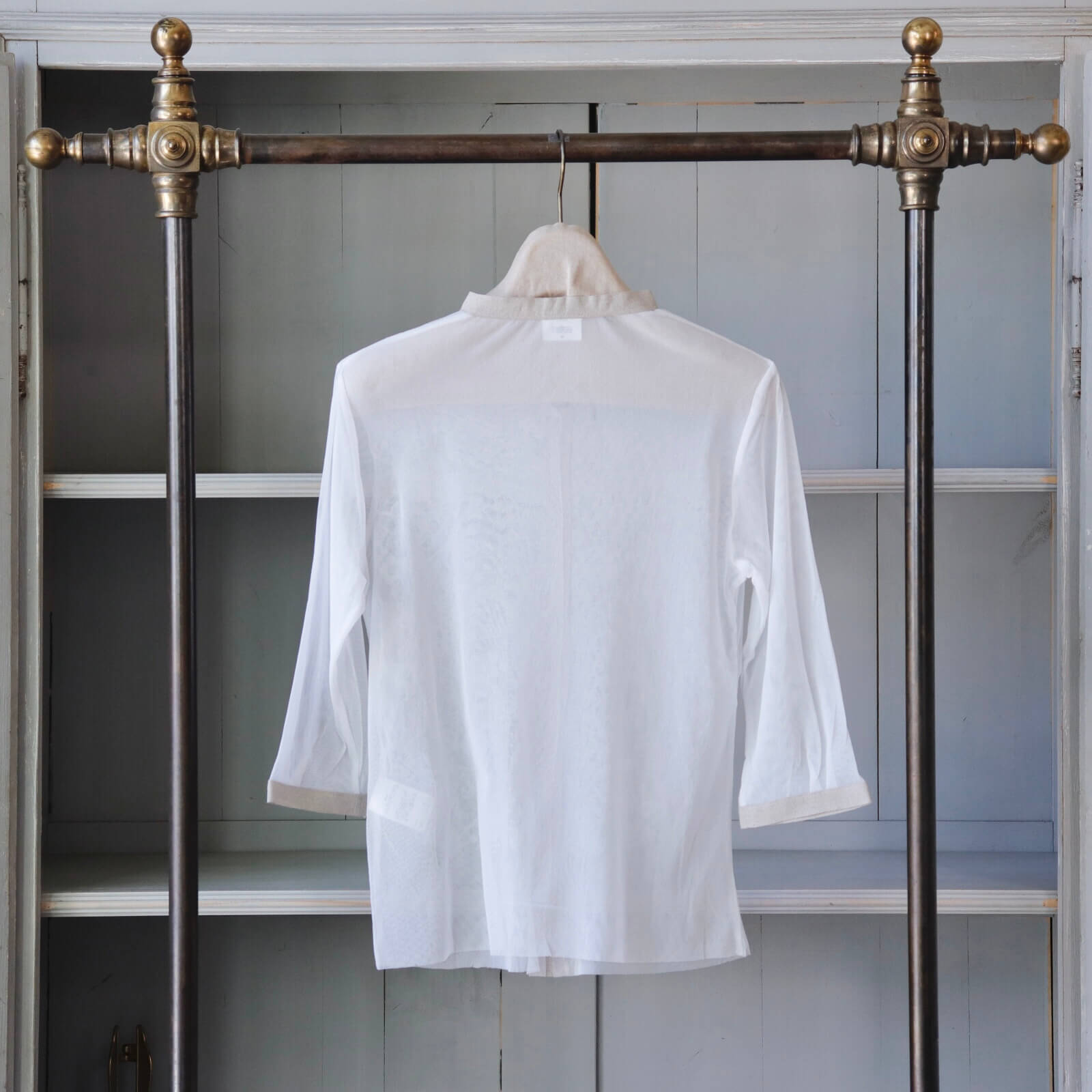 縁にはリネンのリボンが添えられ、カジュアルなボトムスと合わせても上品な印象に仕上げてくれます。